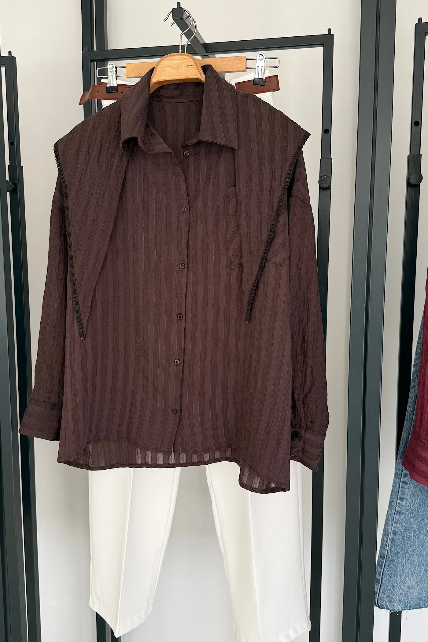 Bağlama Detaylı Çizgili Gömlek Kahverengi