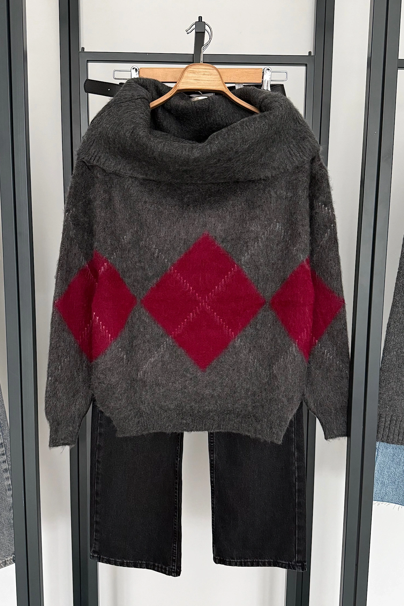 Baklava Desen Madonna Yaka Kazak Antrasit