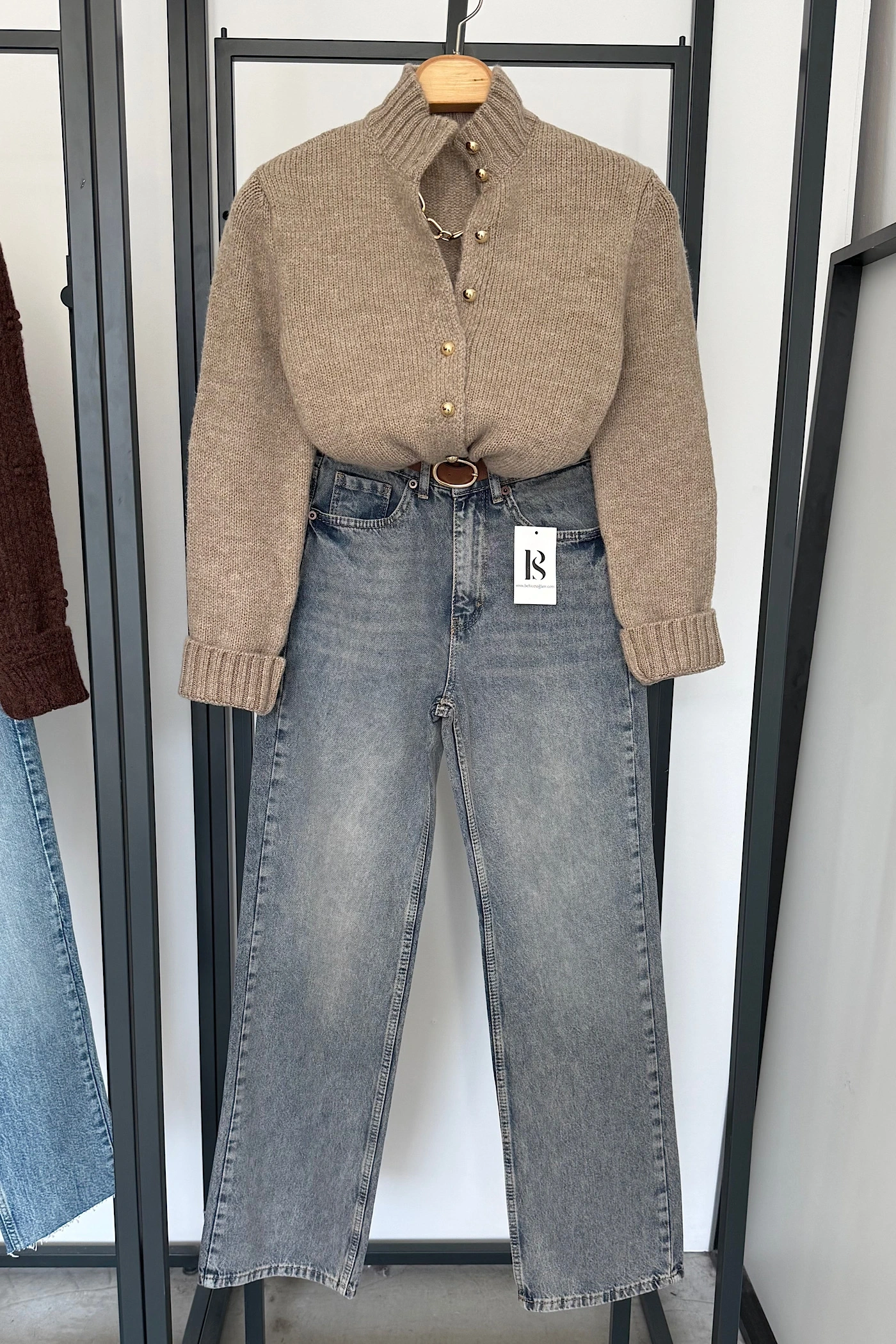 Püsküllü Düğmeli Triko Hırka Kahverengi