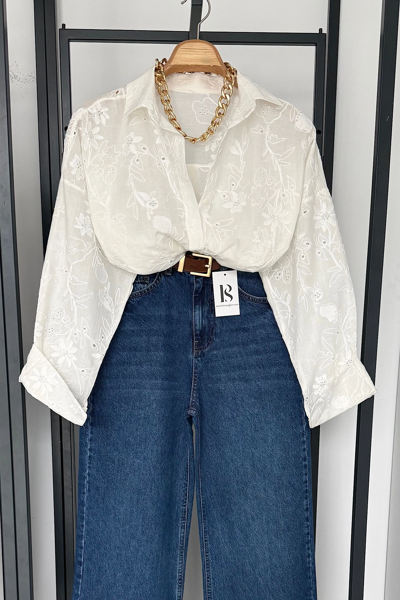Bs Çiçek Nakışlı Gömlek Beyaz