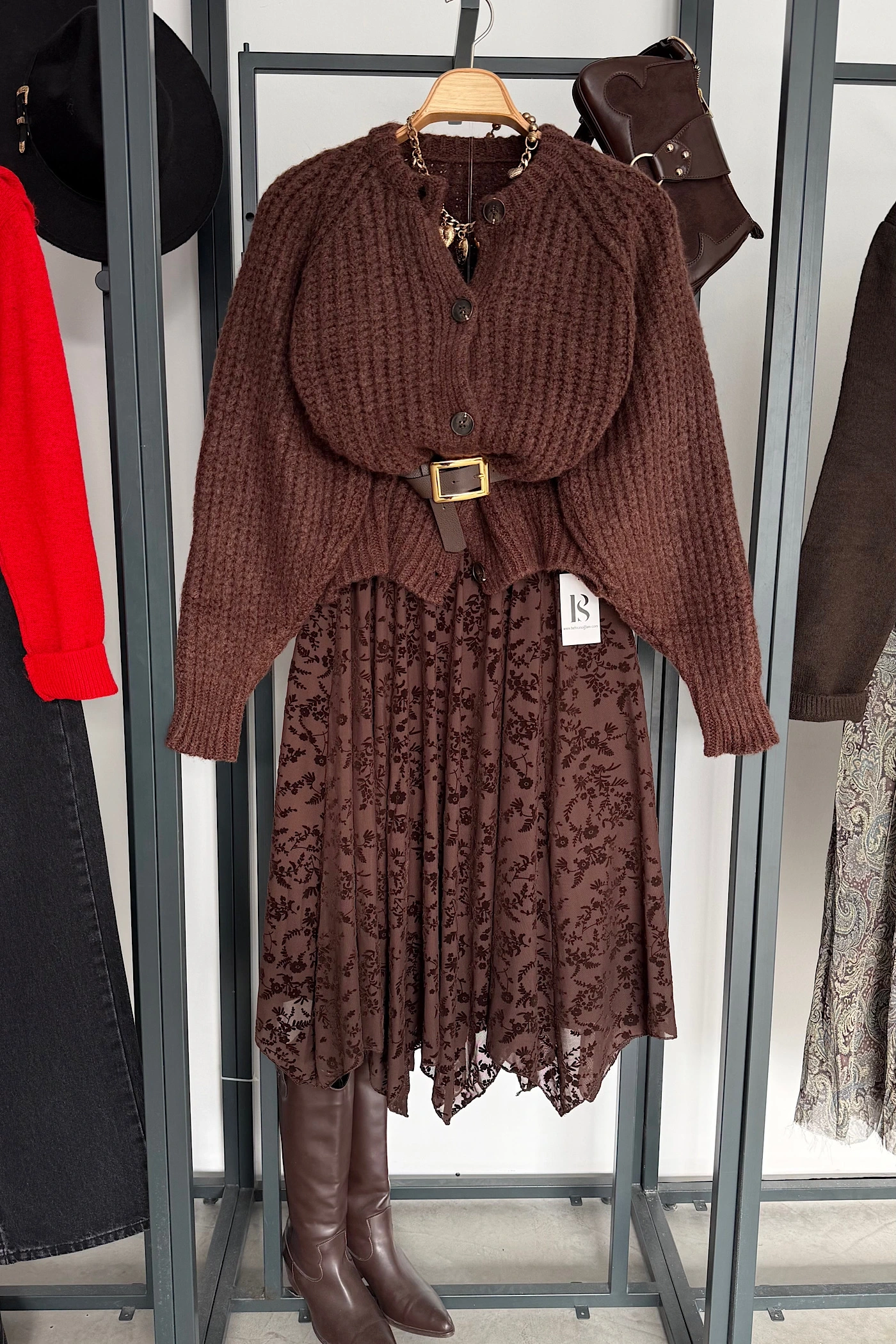 Pislik İsli Asimetrik Kesim İçi Astarlı Etek Kahverengi