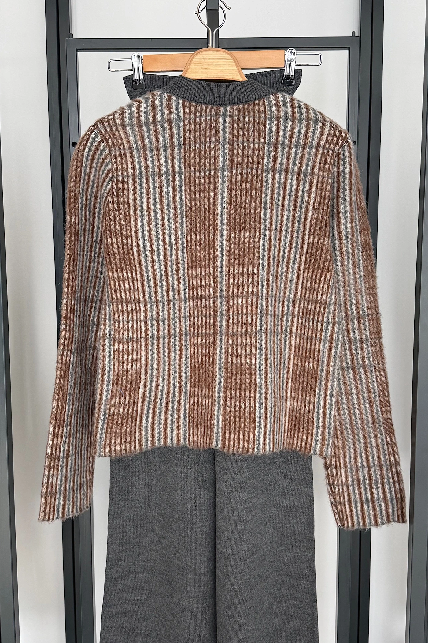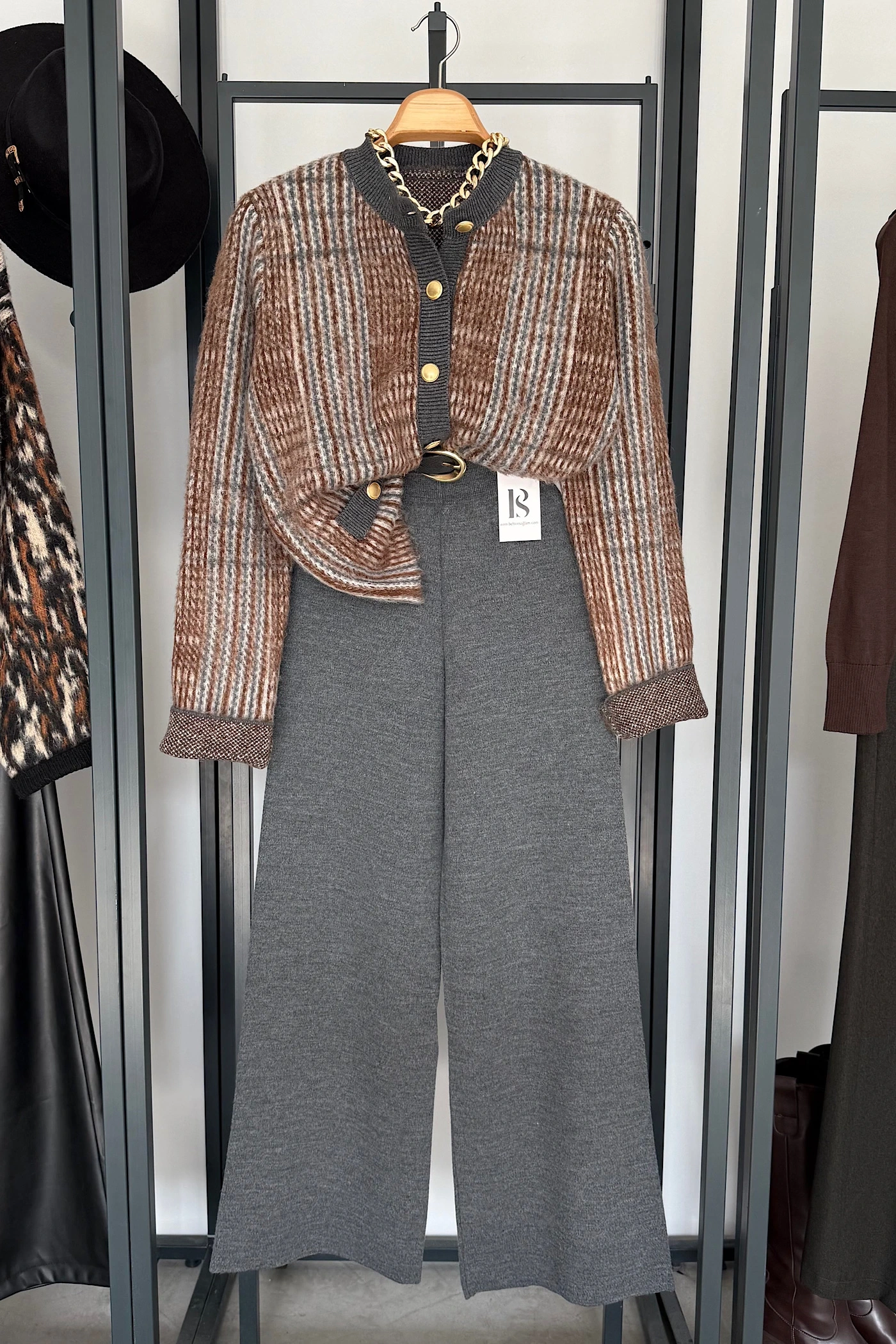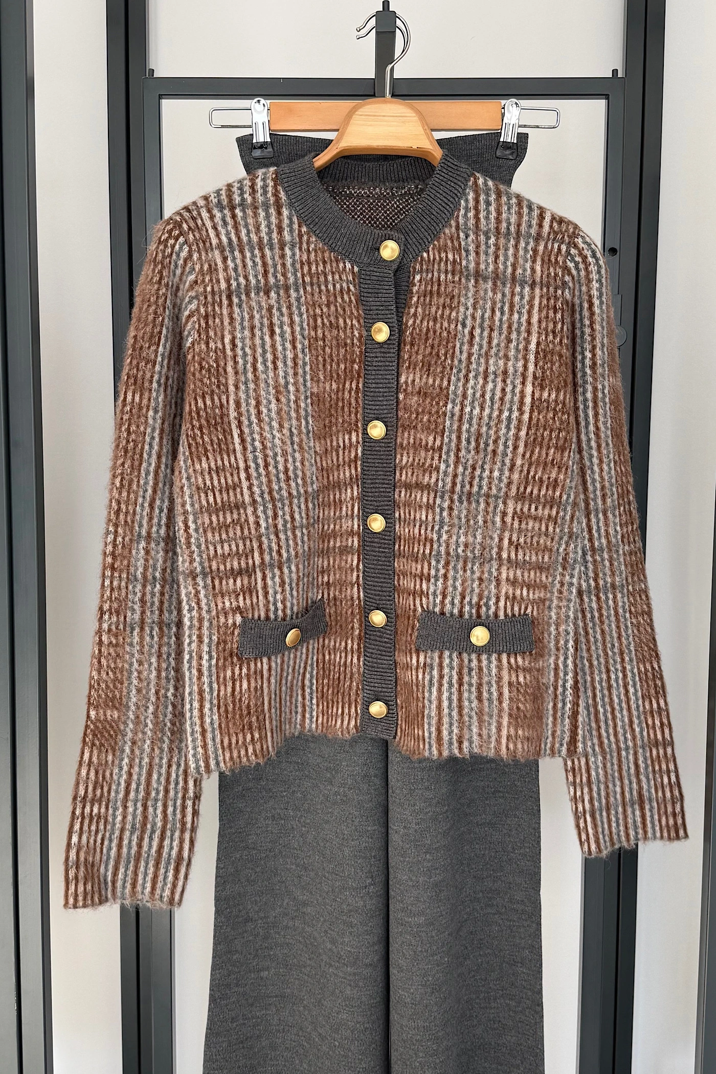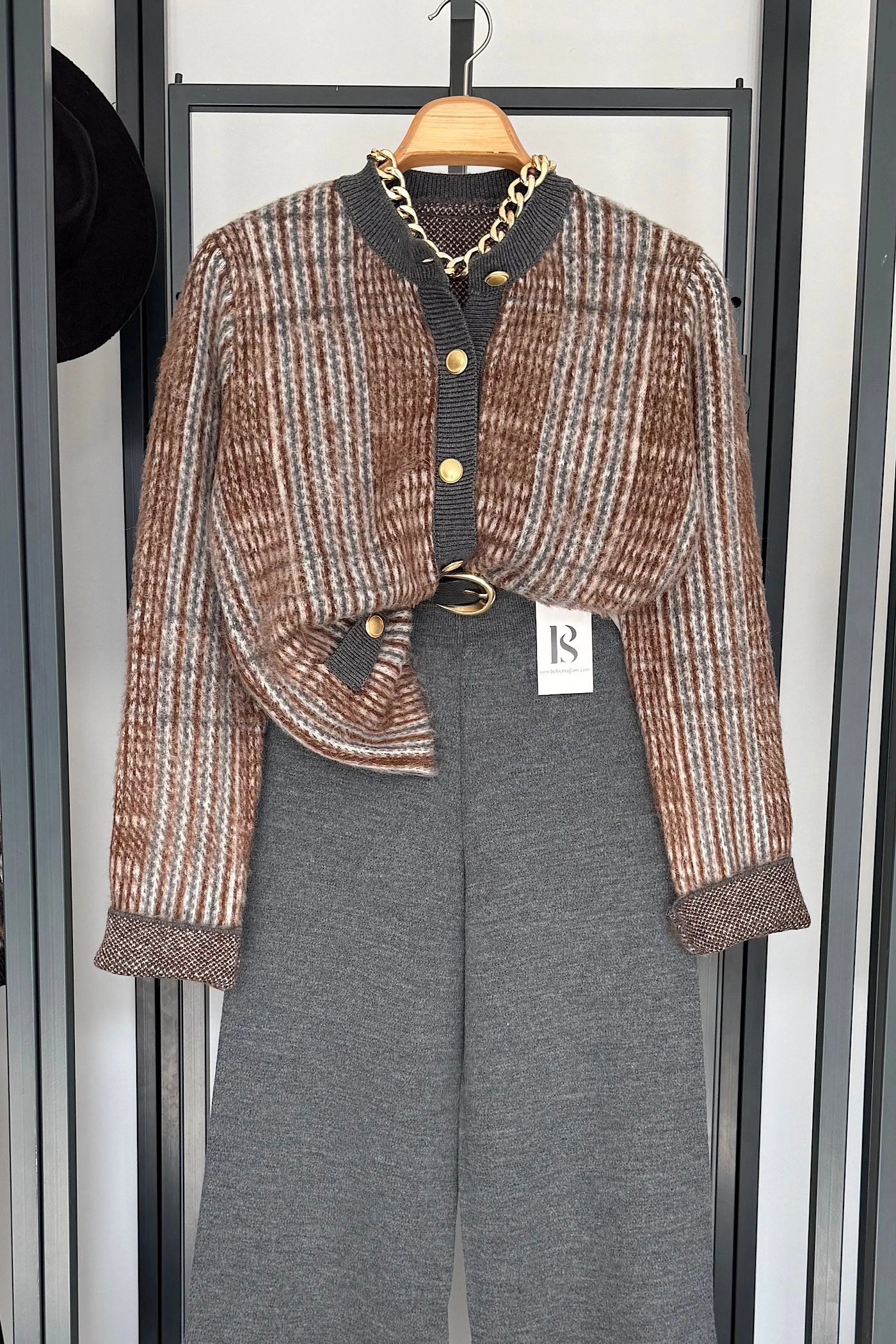 Desenli Şardonlu Düğmeli Triko Hırka Kahverengi