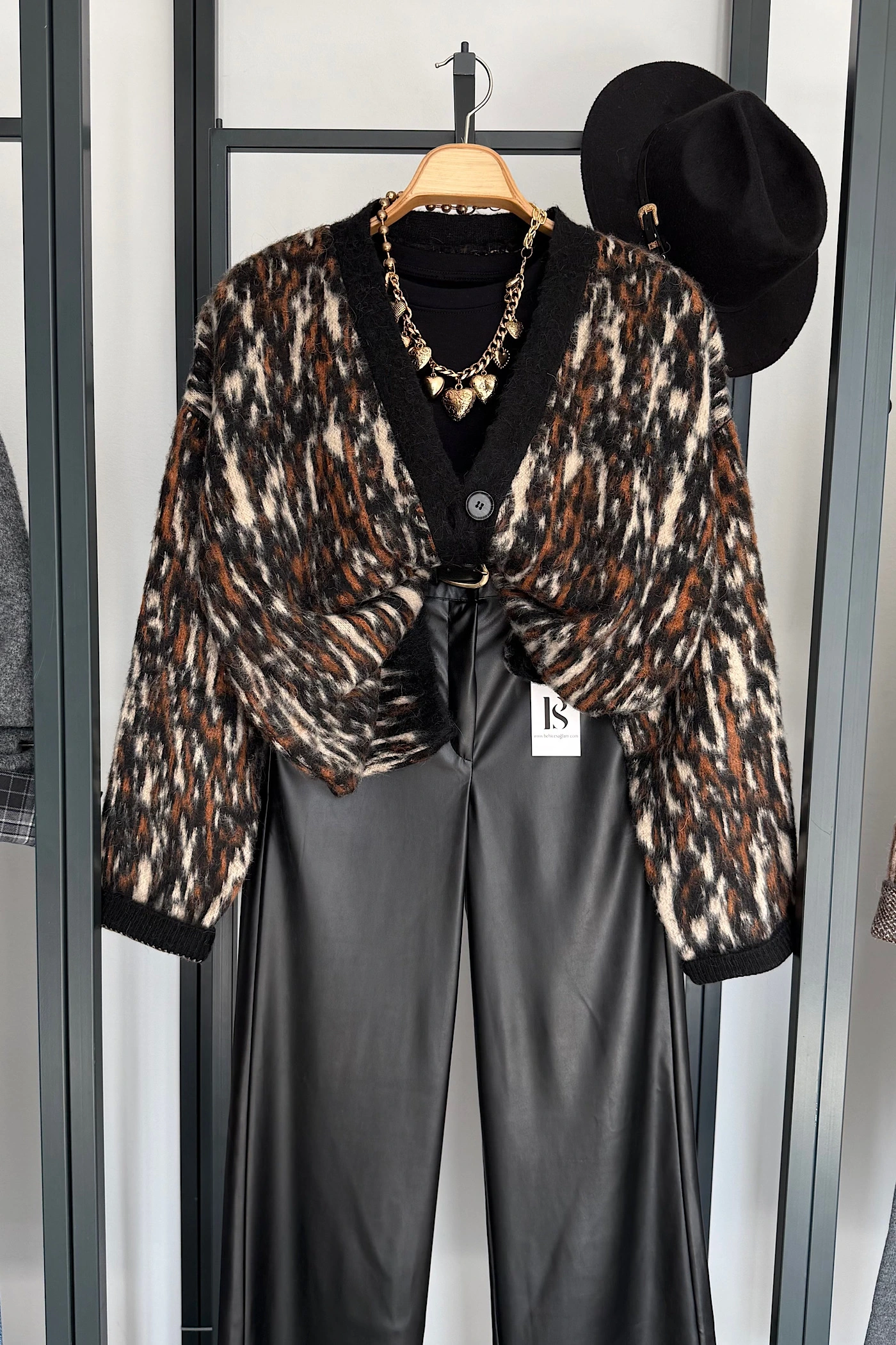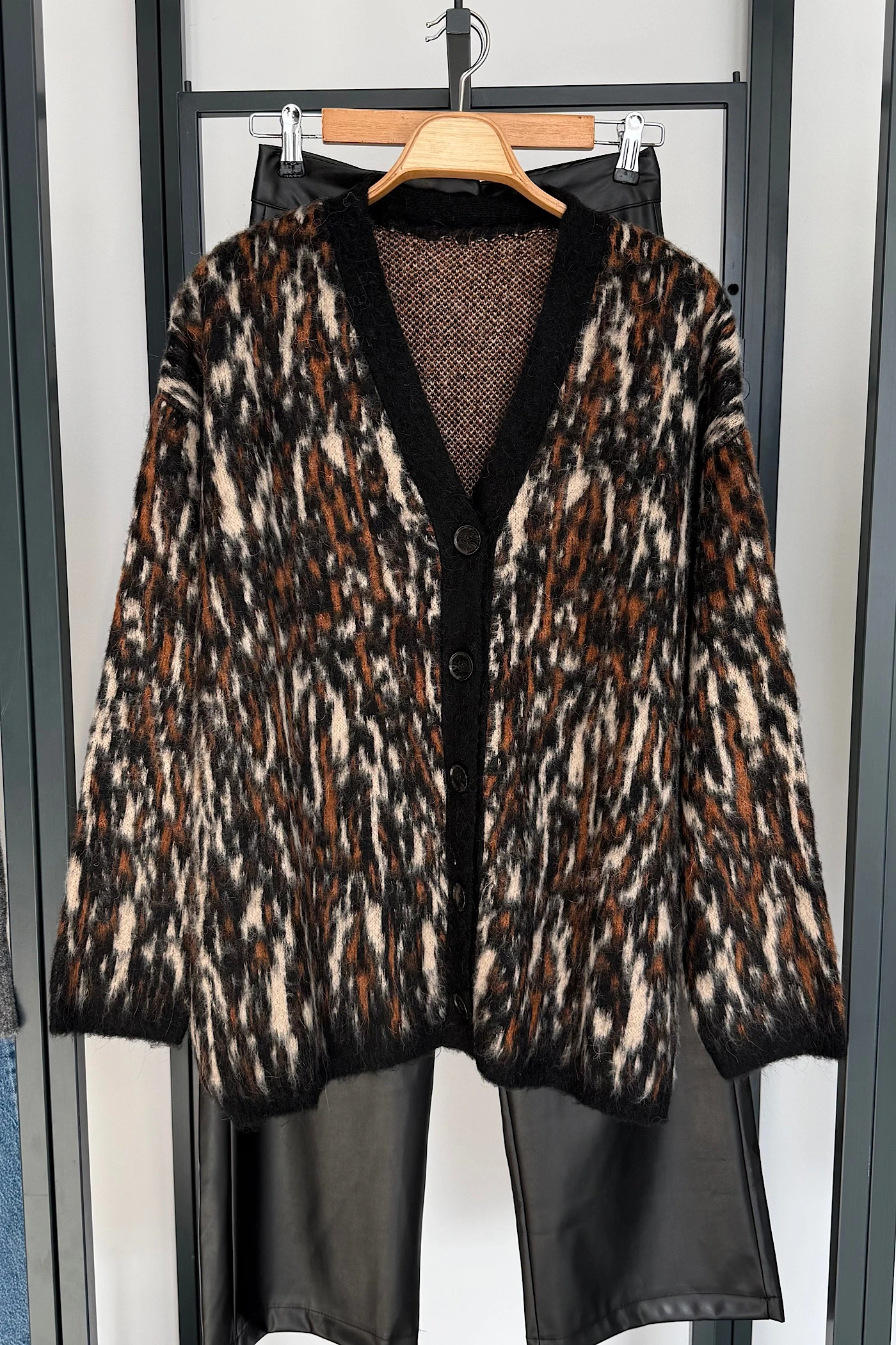 Desenli Şardonlu Düğmeli Triko Hırka Kahverengi