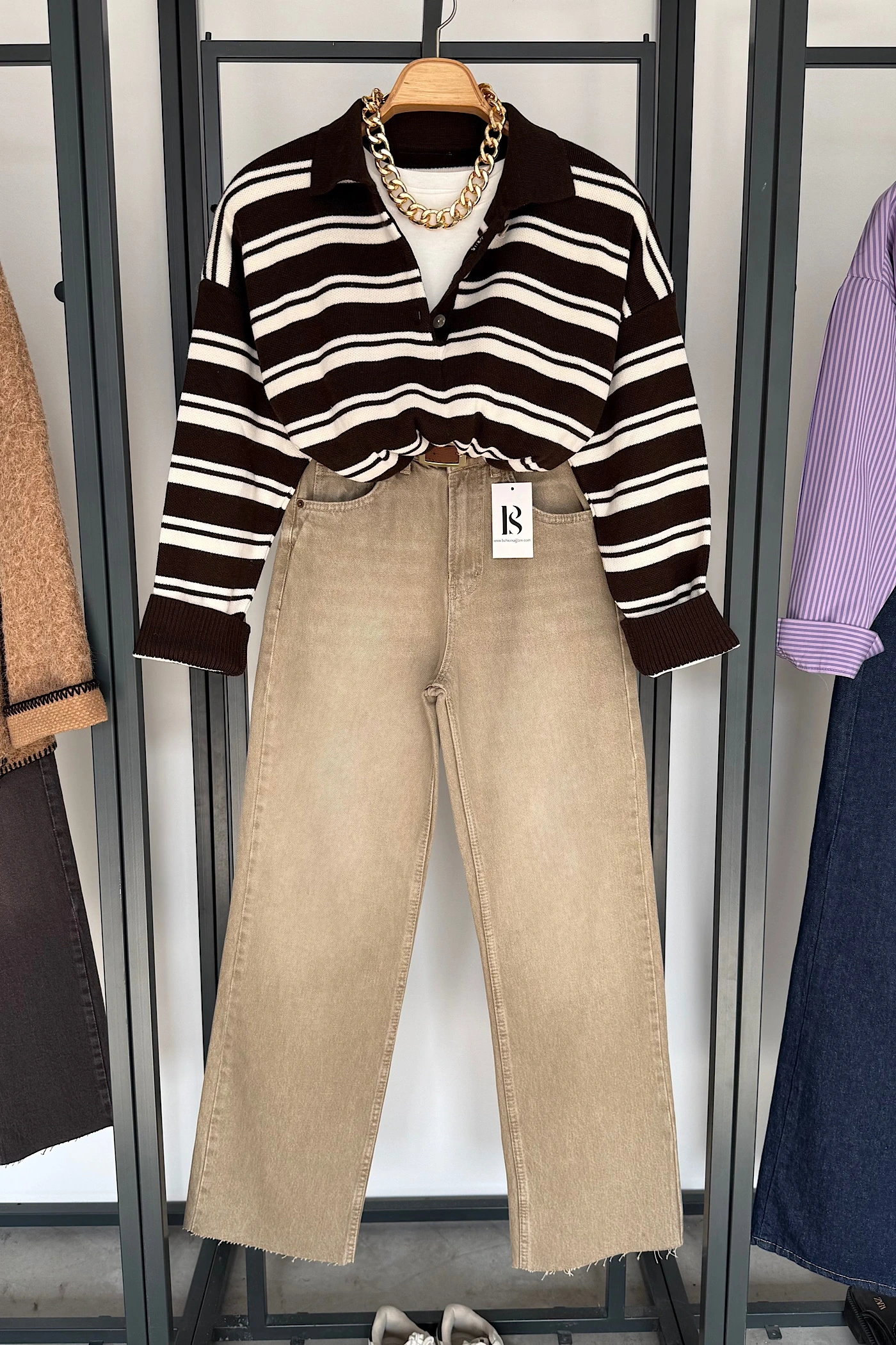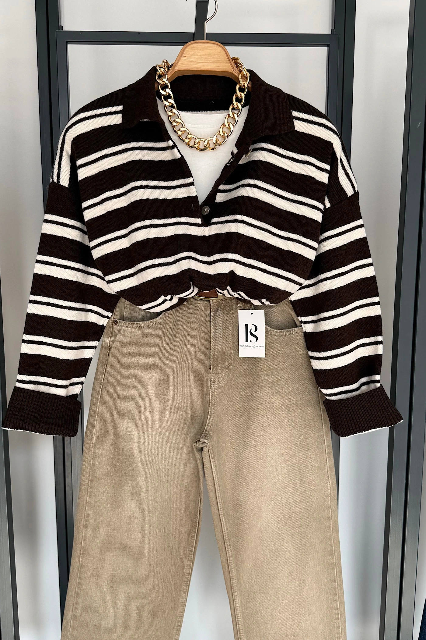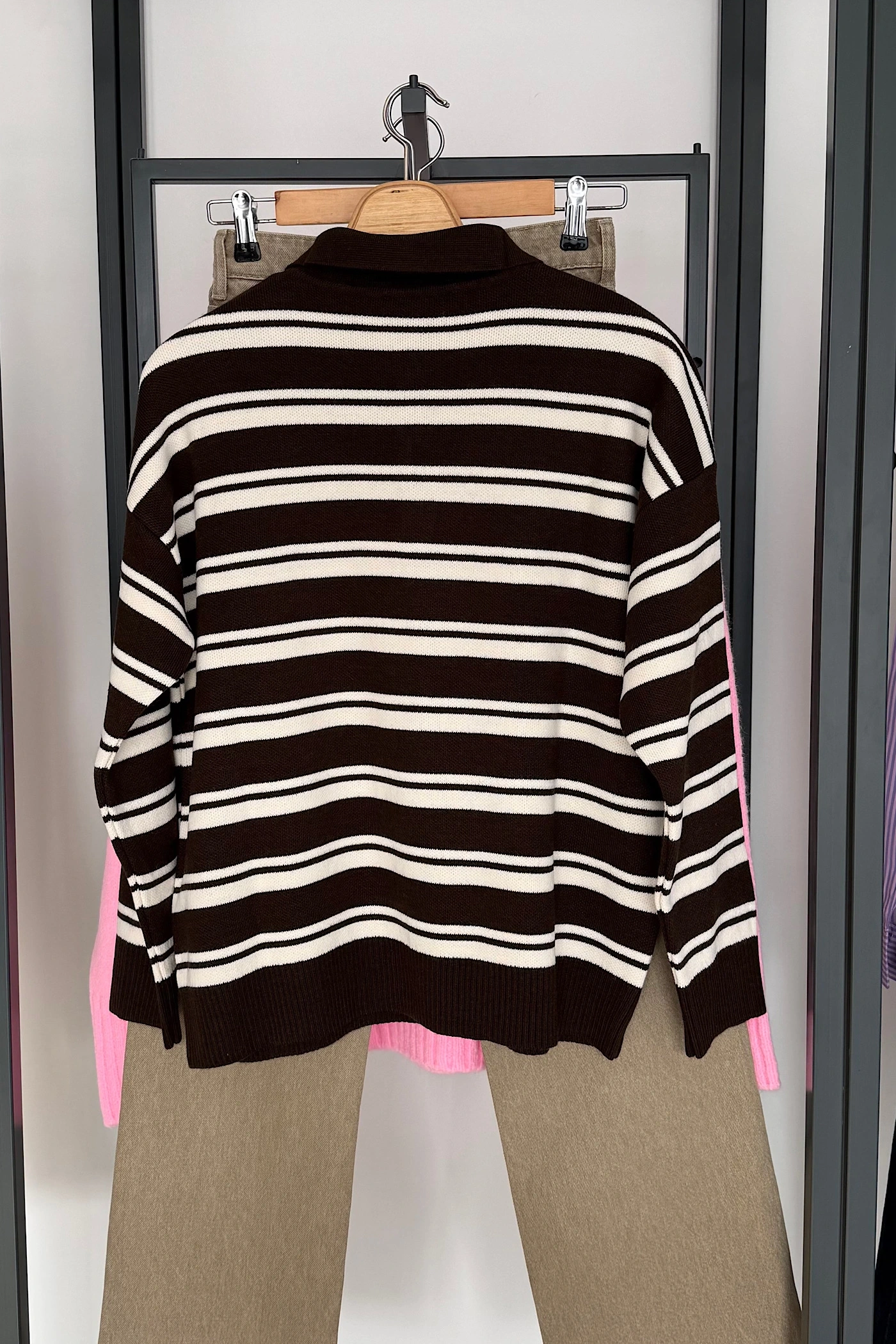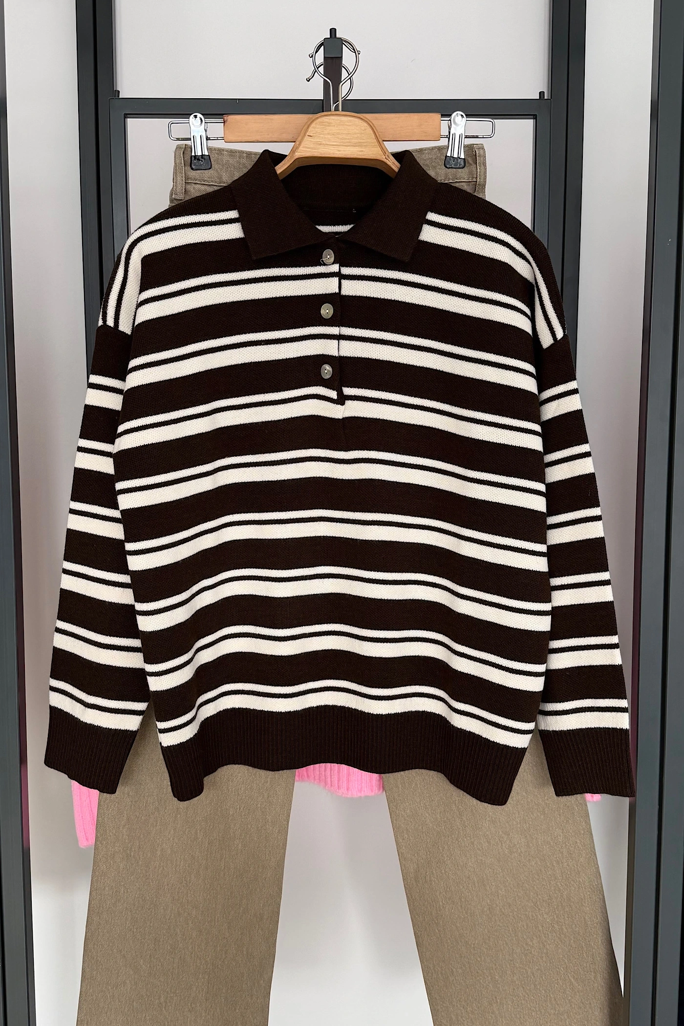 Düğmeli Polo Yaka Kazak Koyu Kahve-Krem