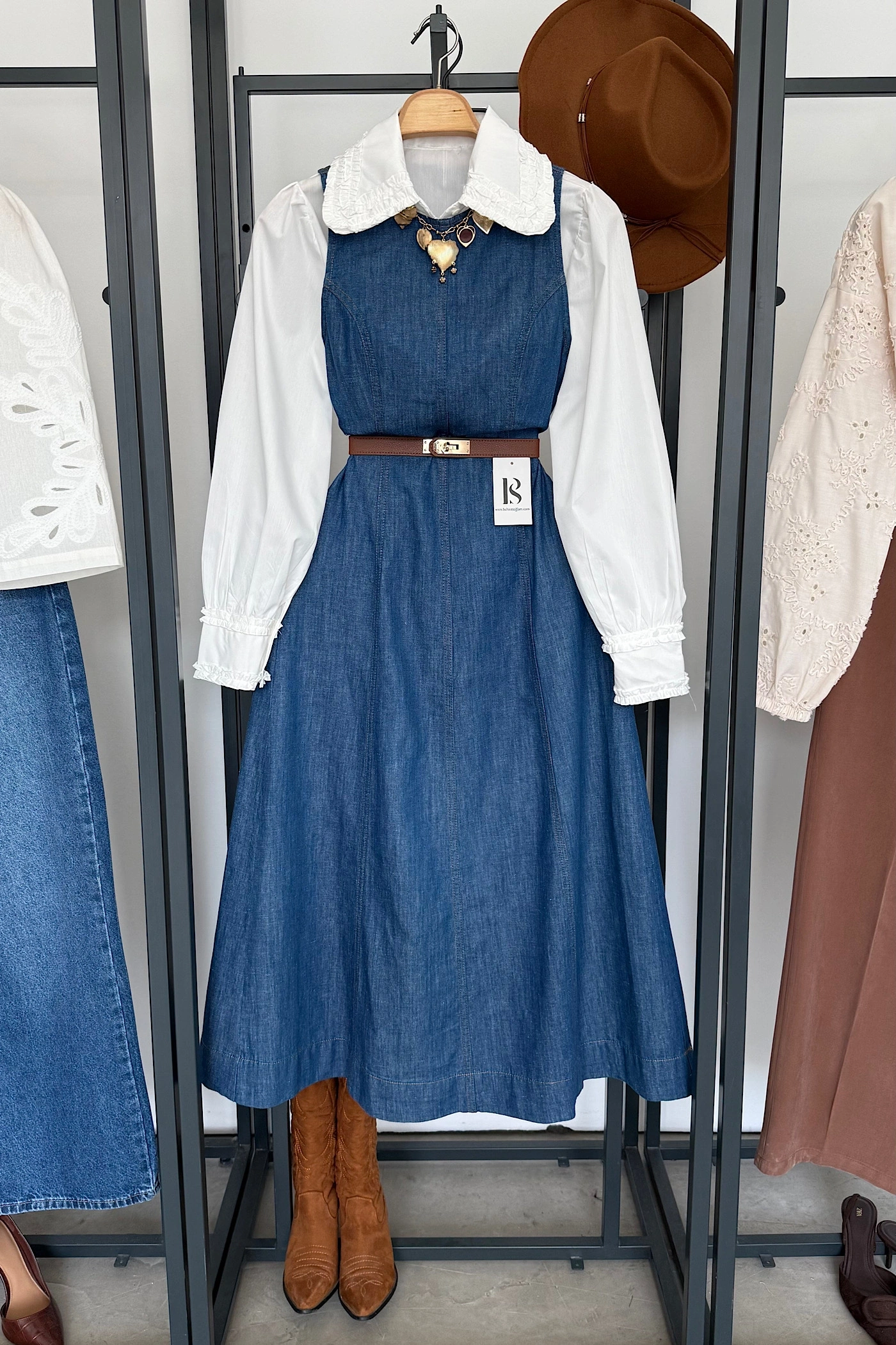 Bisiklet Yaka Kolsuz Premium Uzun Kot Elbise Mavi