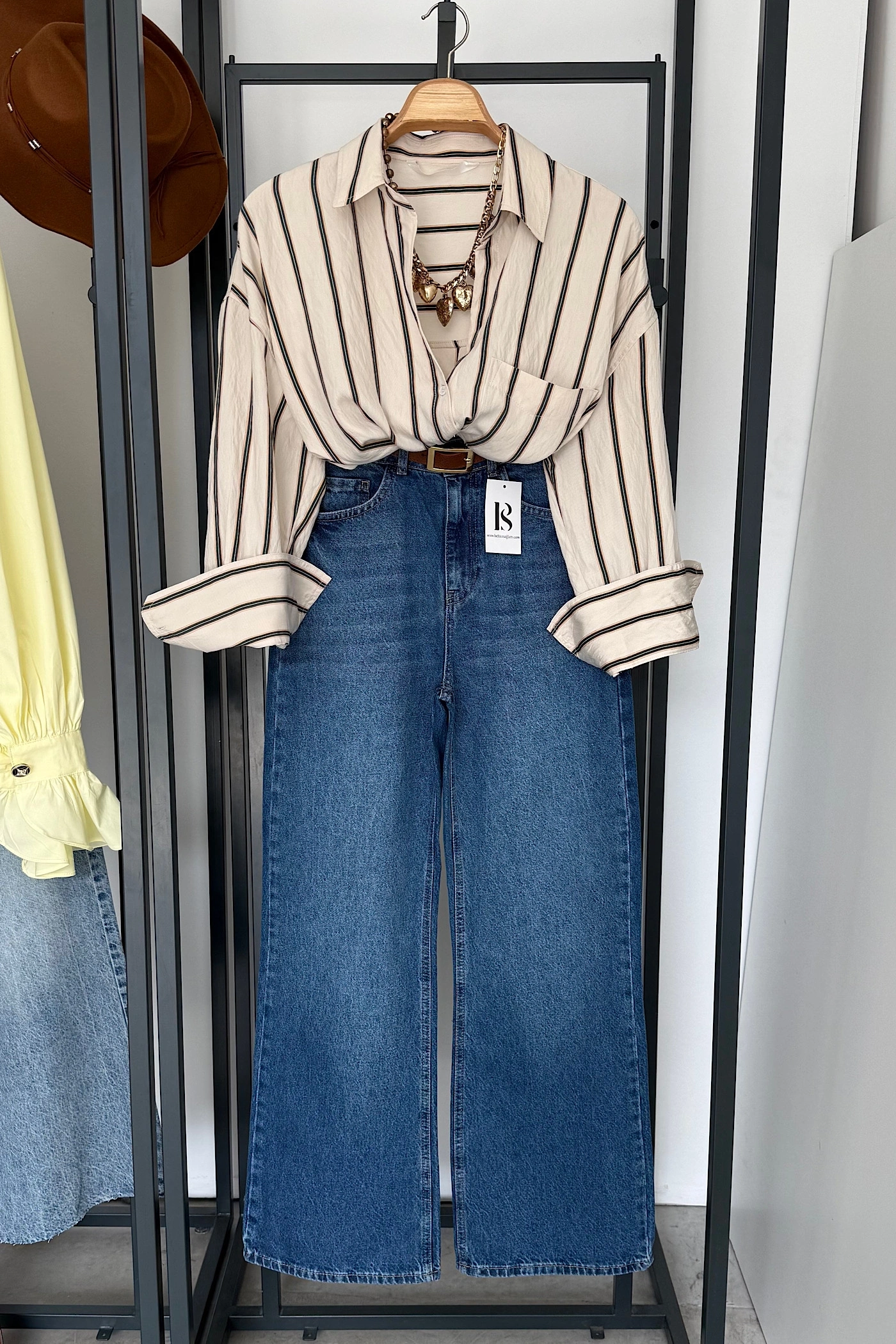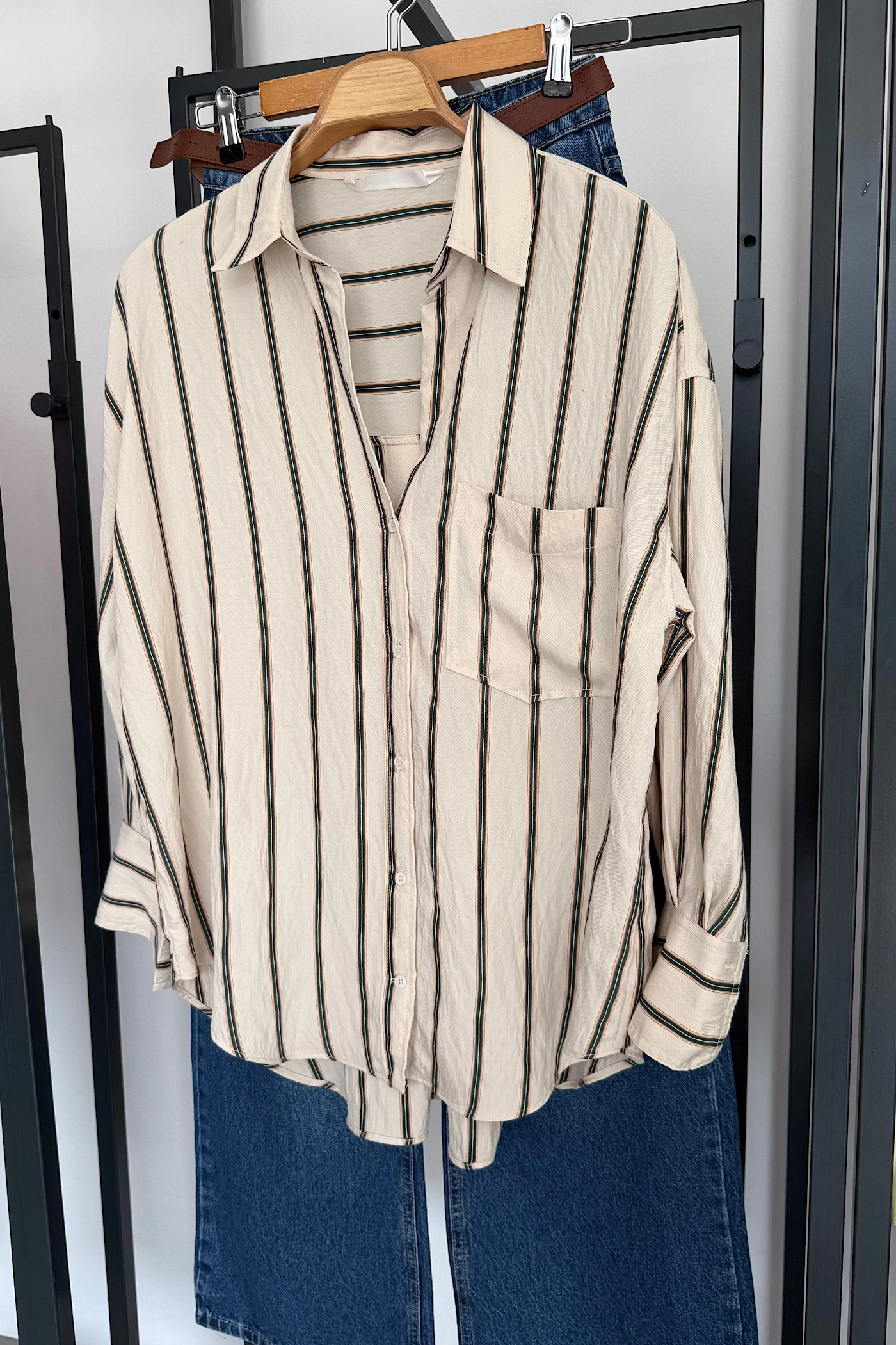 Çizgili Kayık Yaka Gömlek Kahverengi