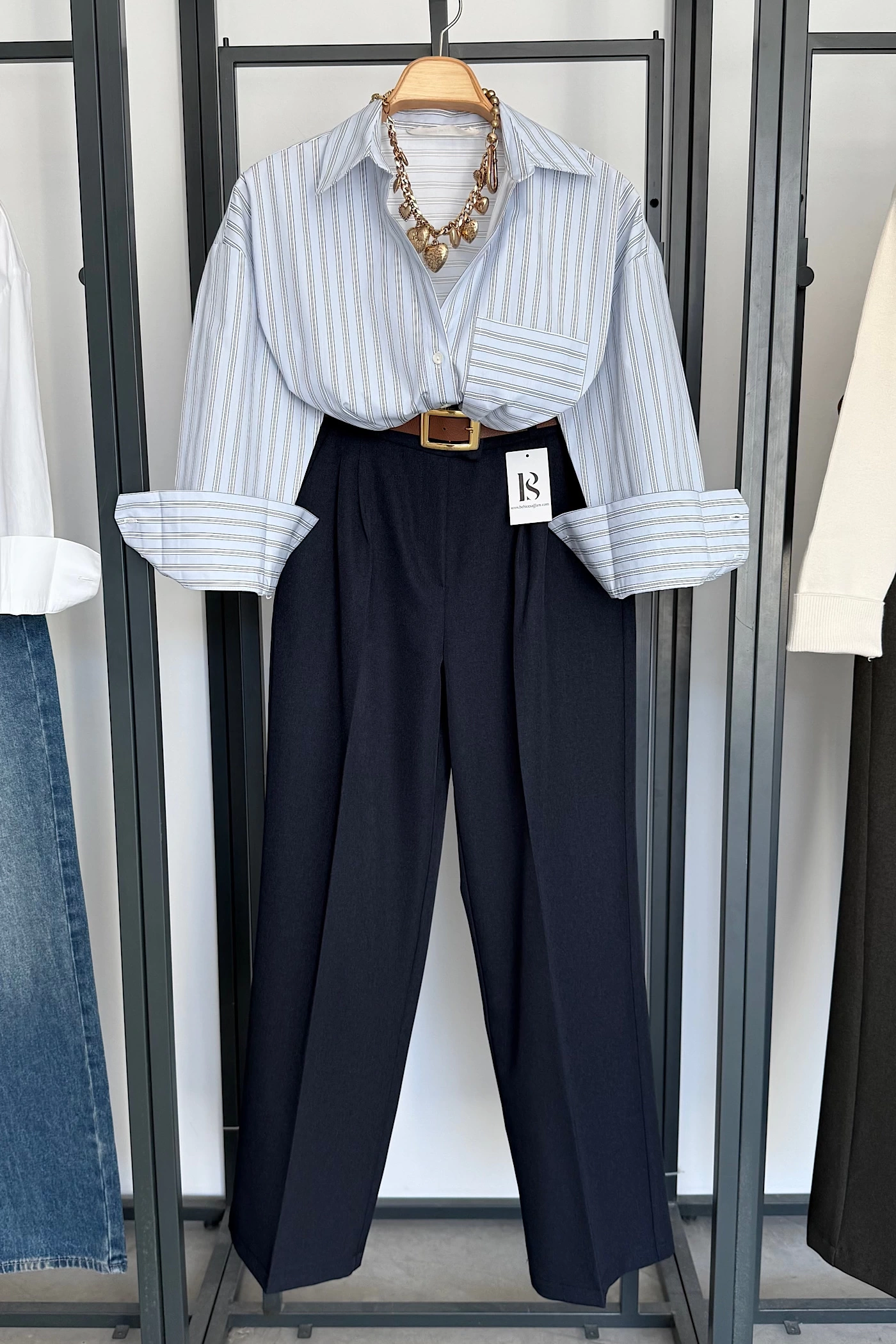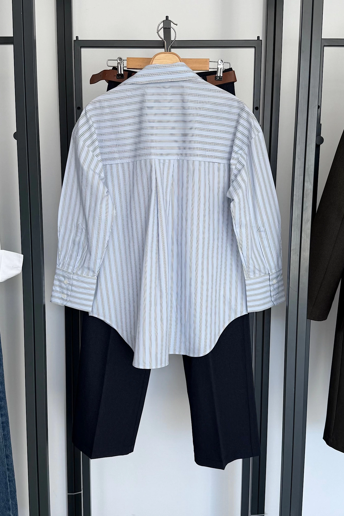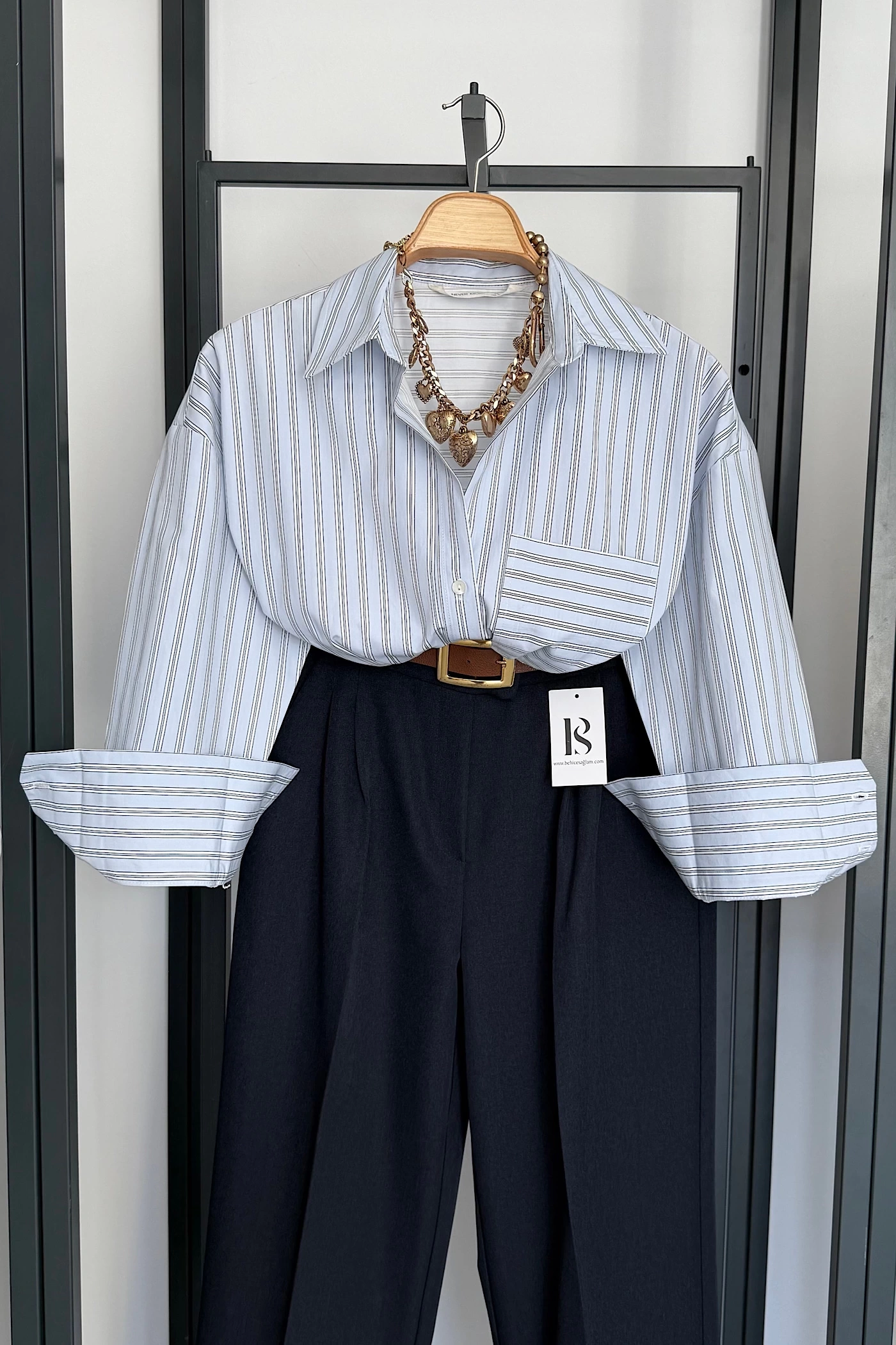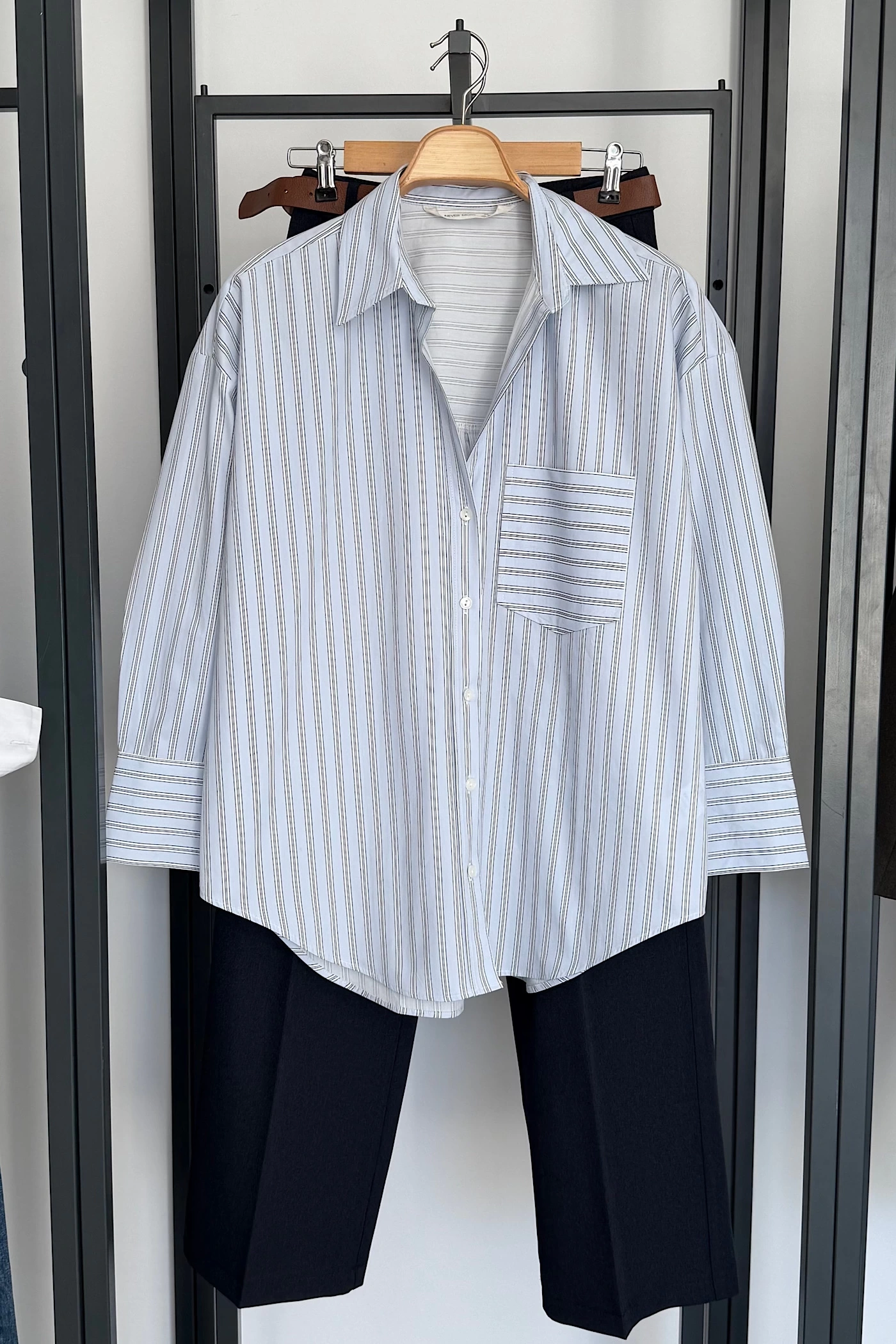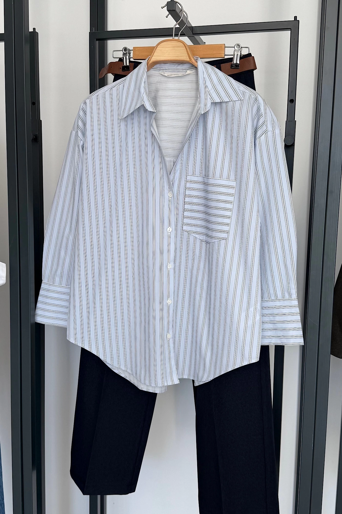 Çizgili Tek Cepli Poplin Gömlek Açık Mavi