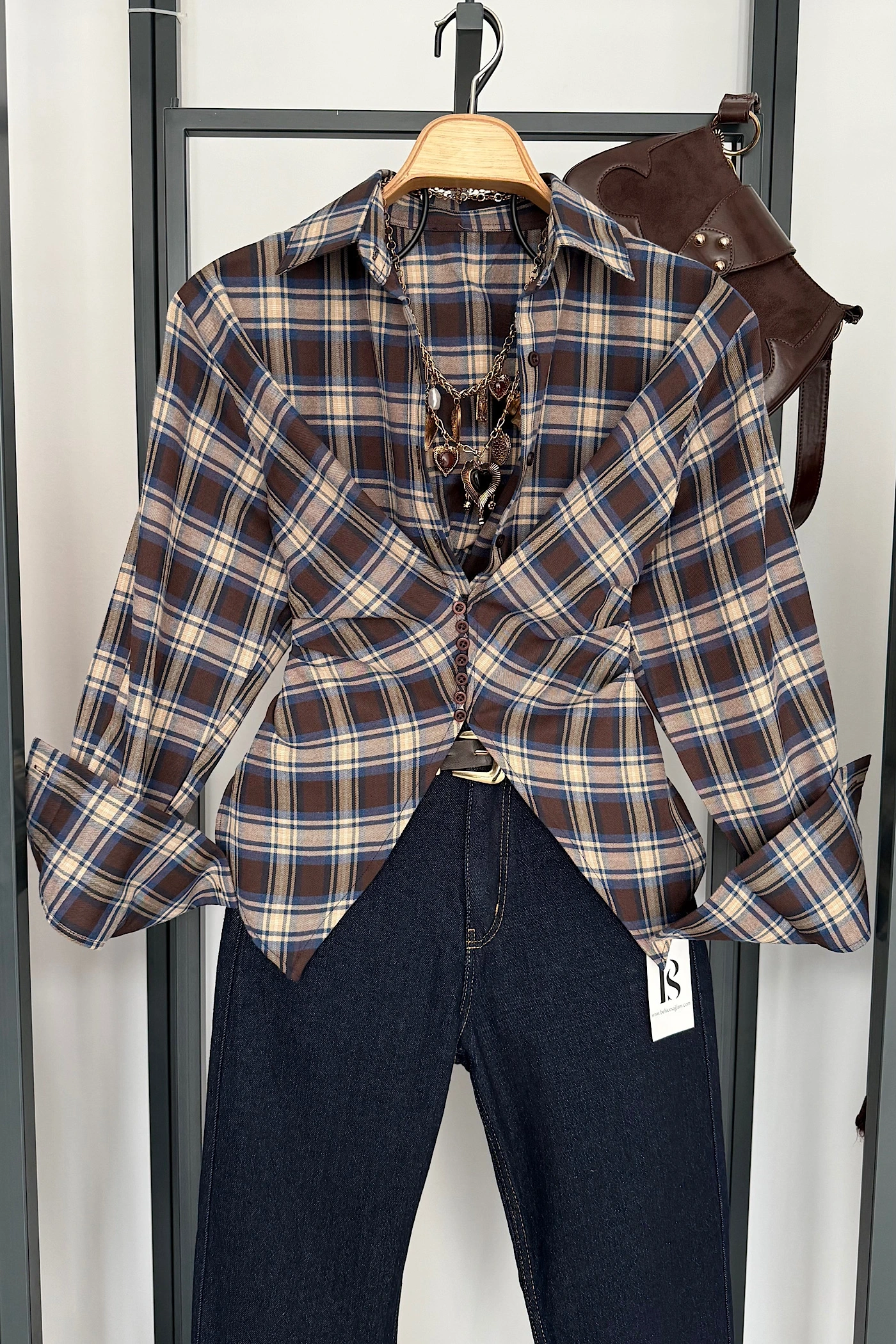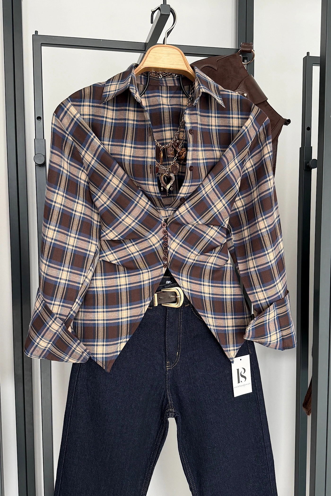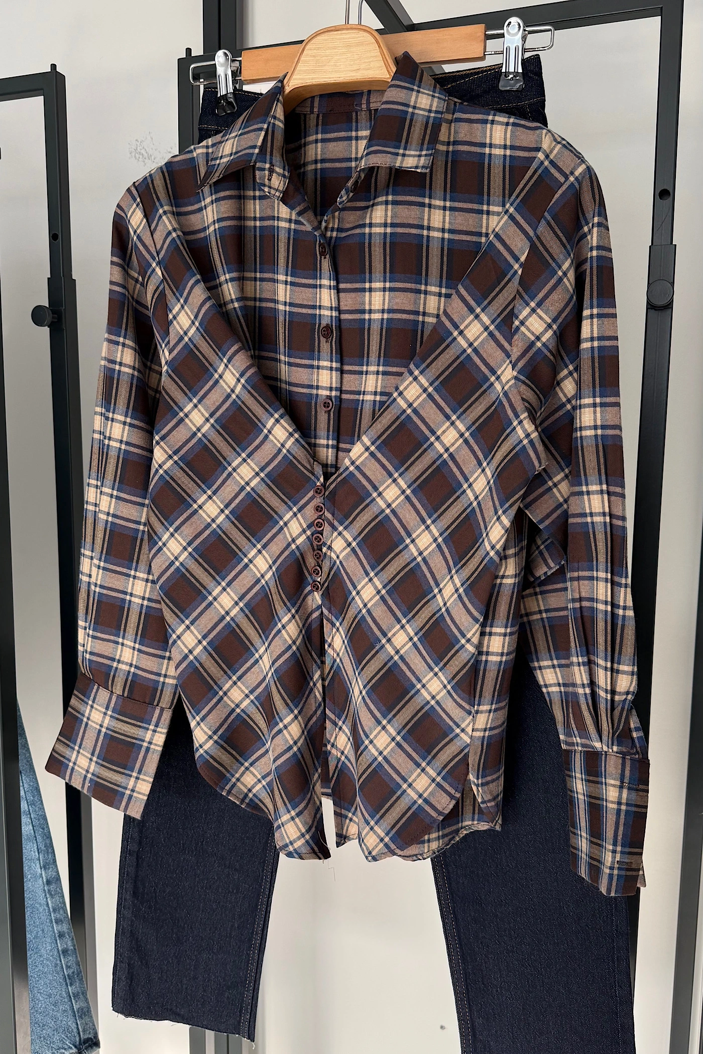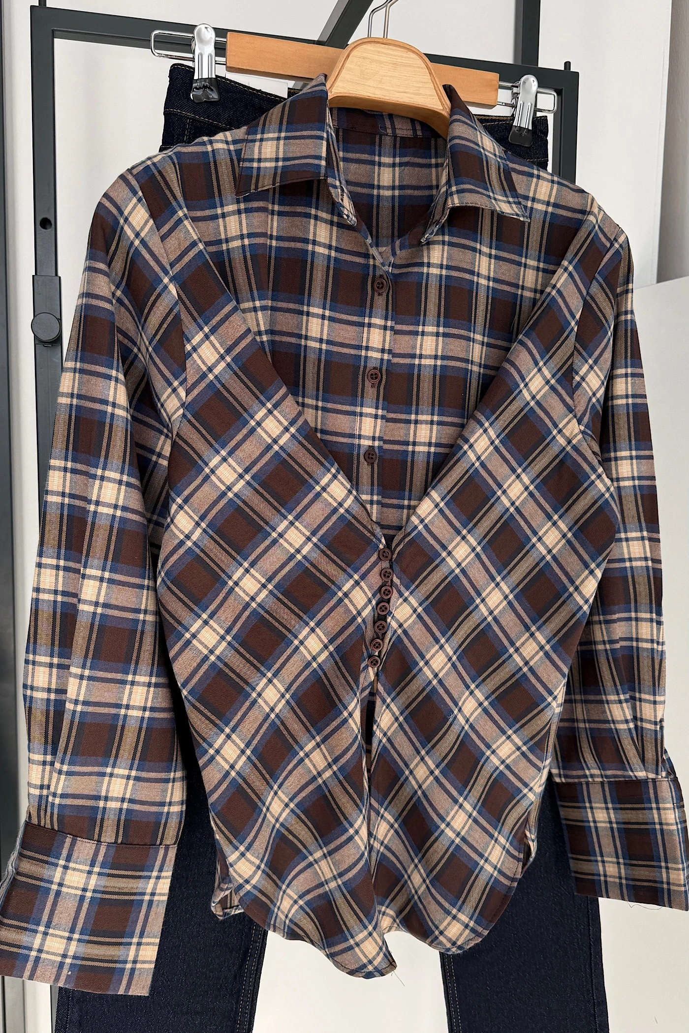 Ekose Desen Düğme Detaylı Gömlek Kahve-Ekru
