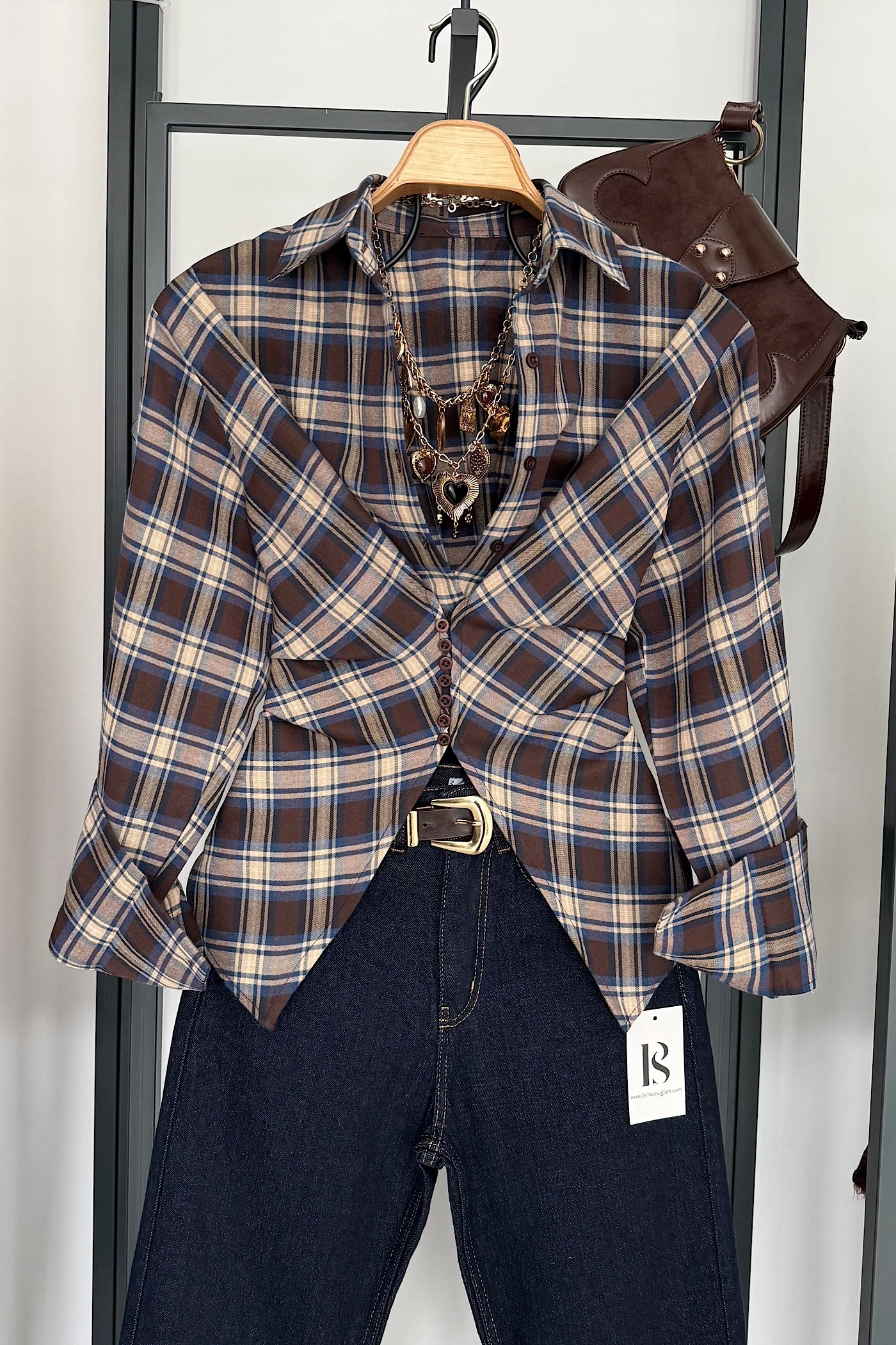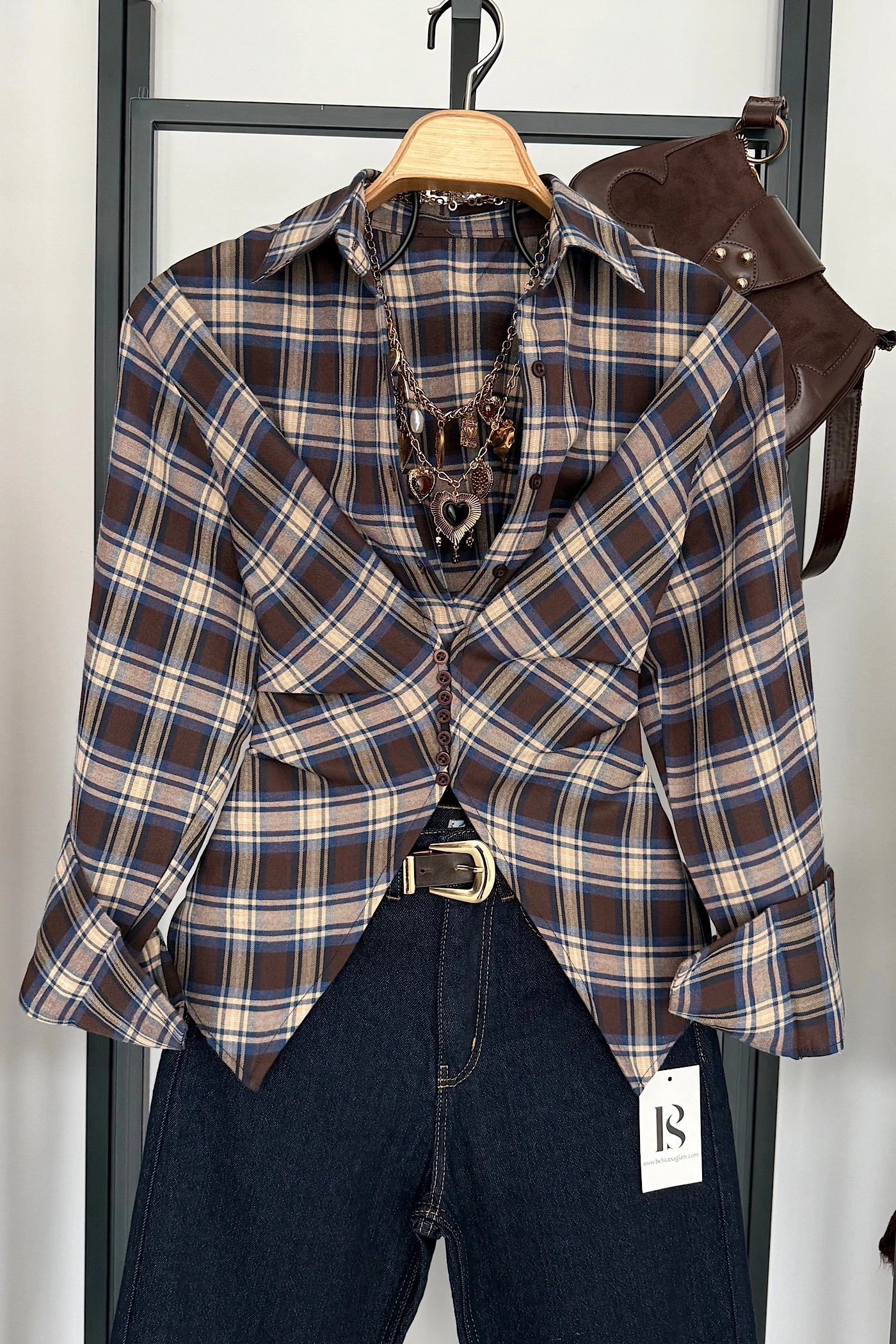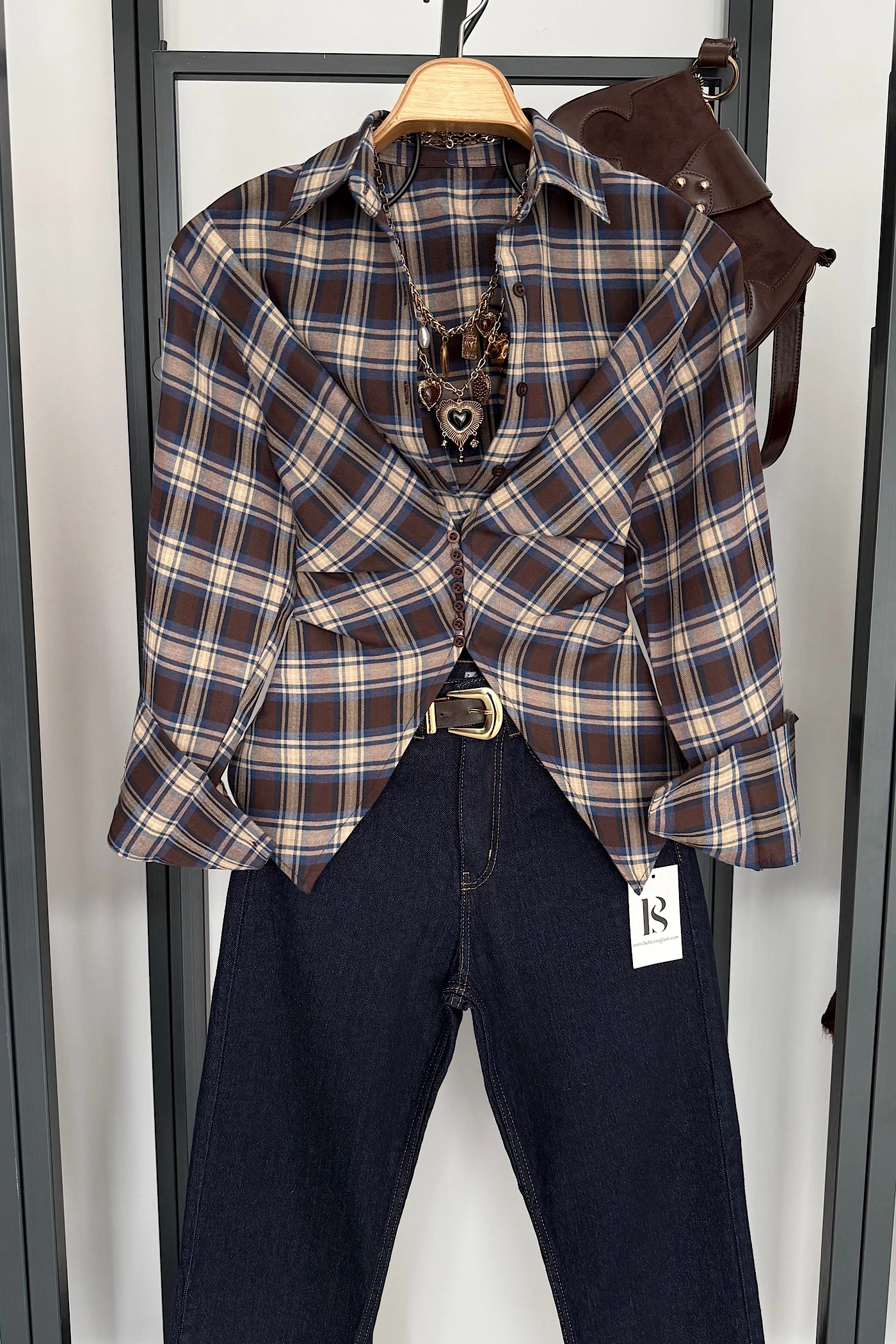 Ekose Desen Düğme Detaylı Gömlek Kahve-Ekru
