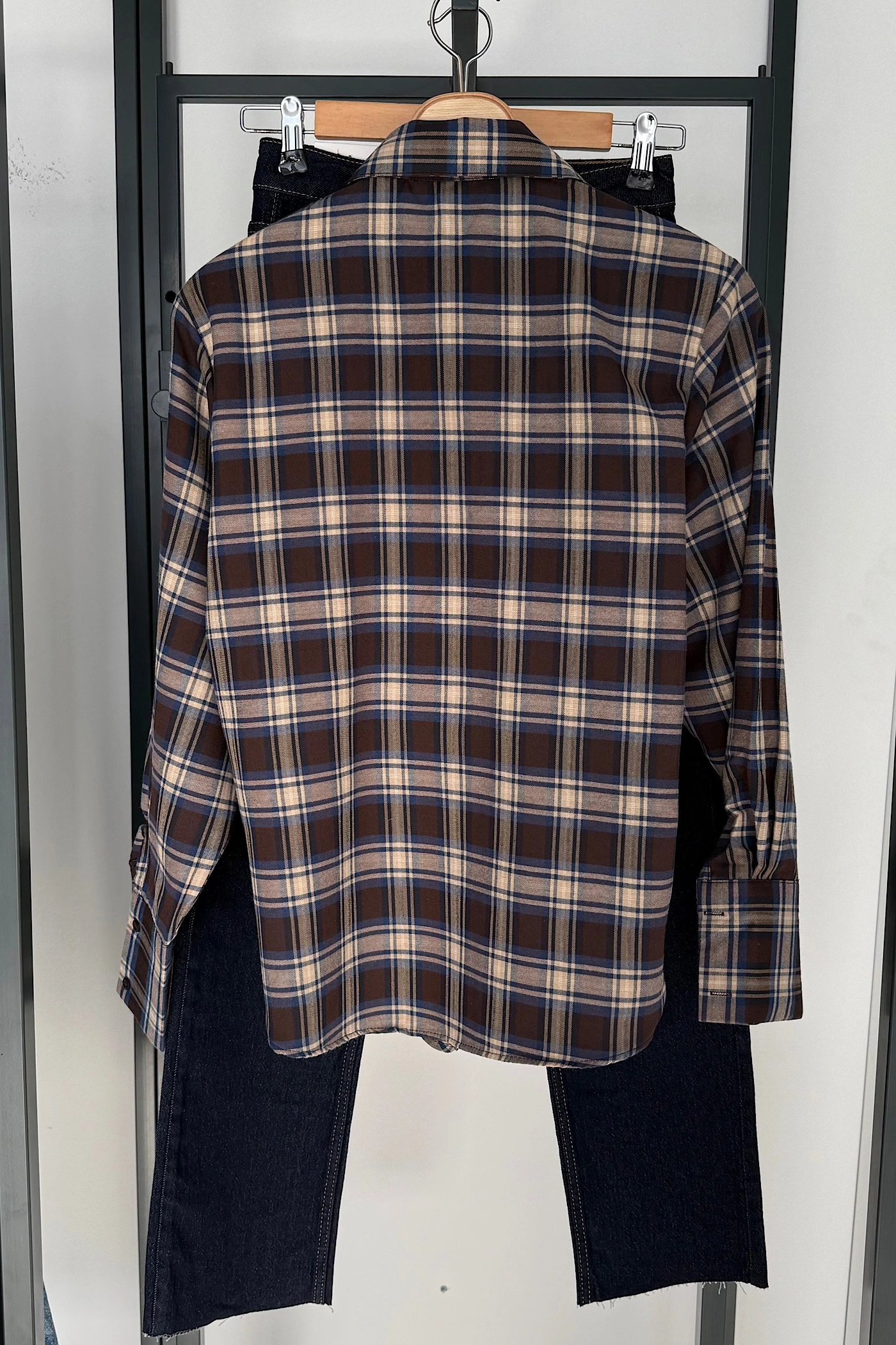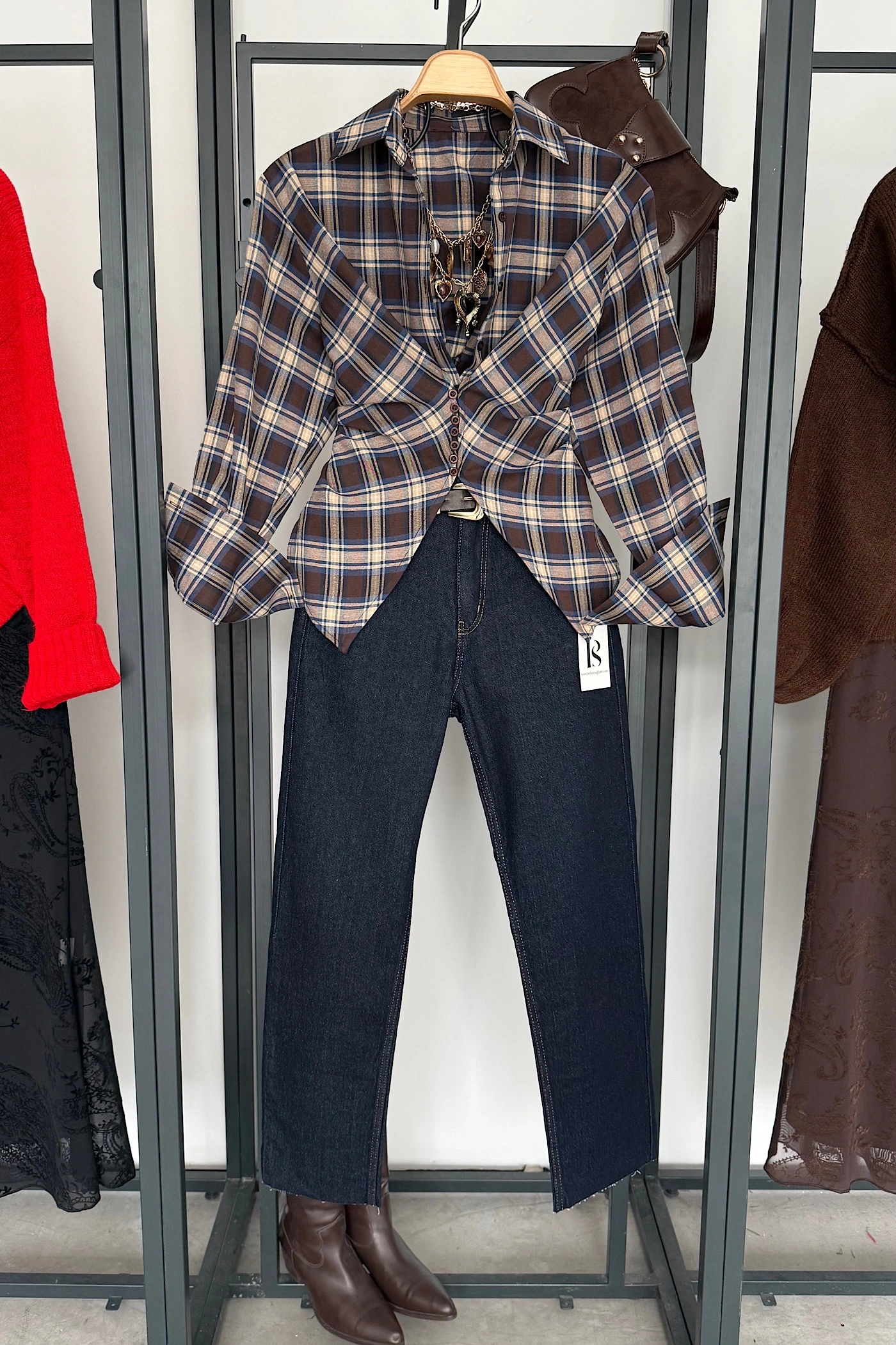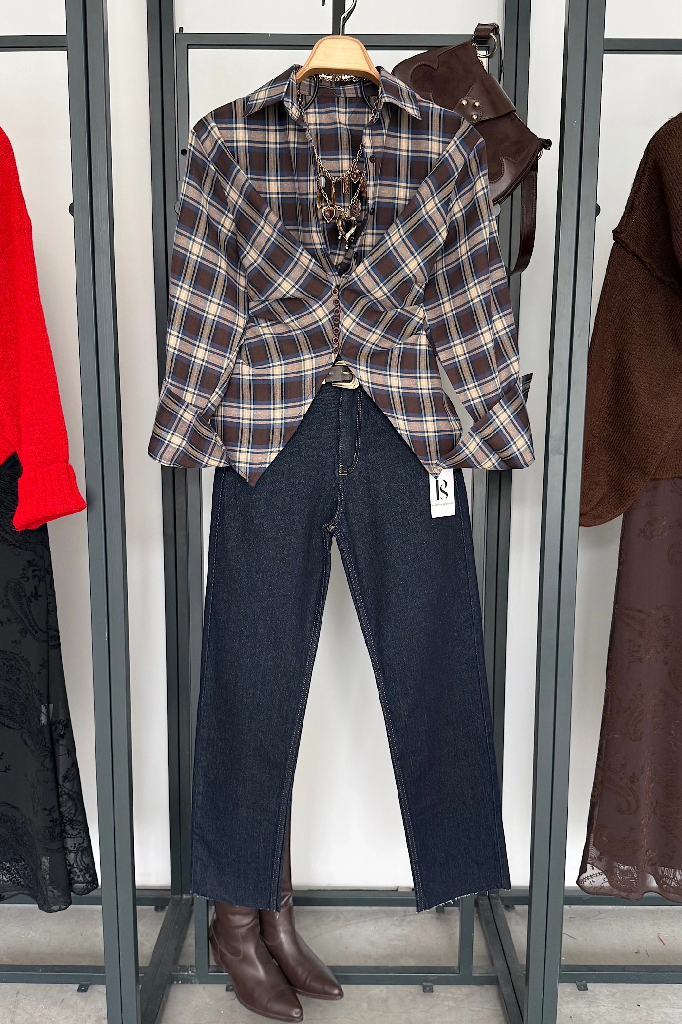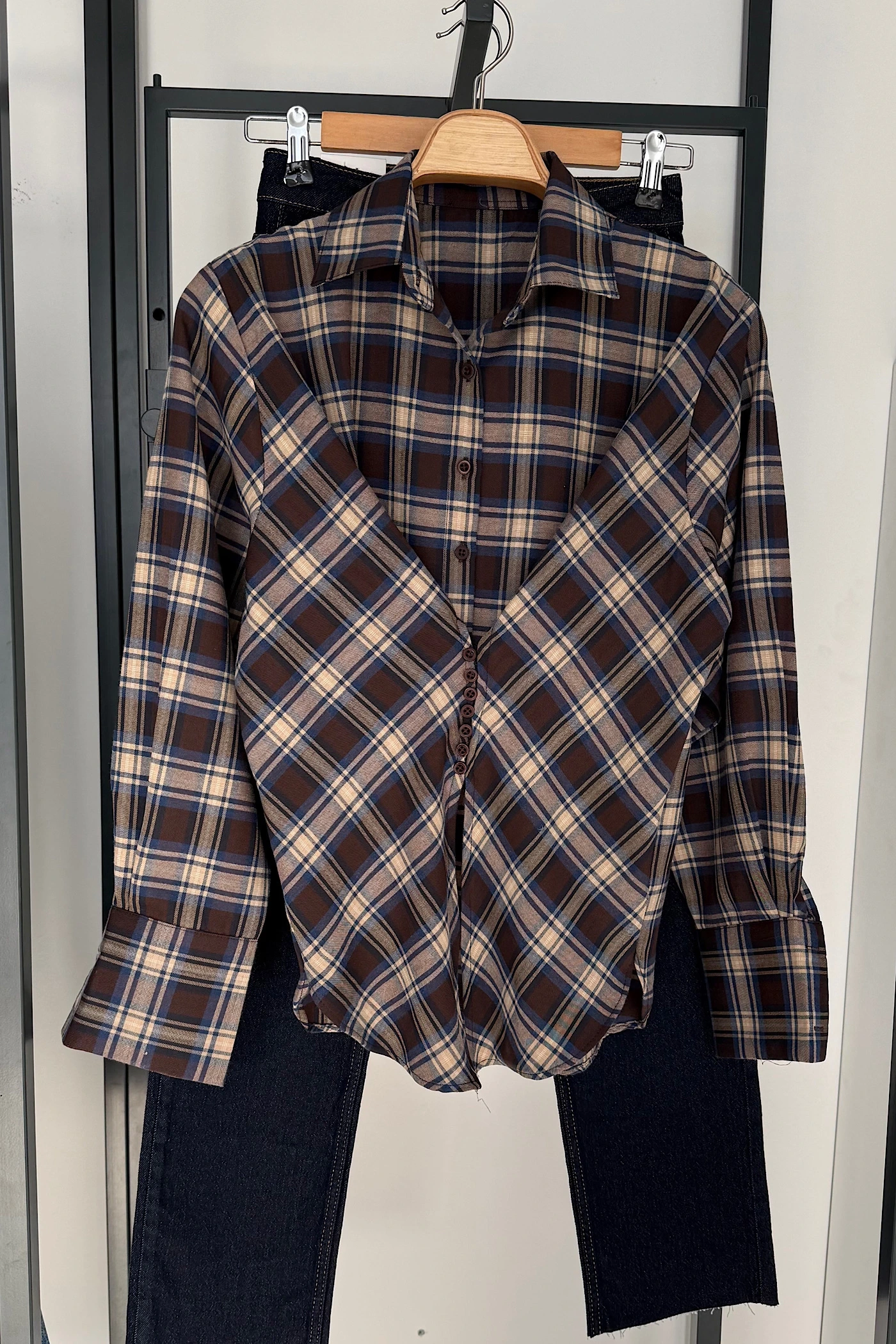 Ekose Desen Düğme Detaylı Gömlek Kahve-Ekru