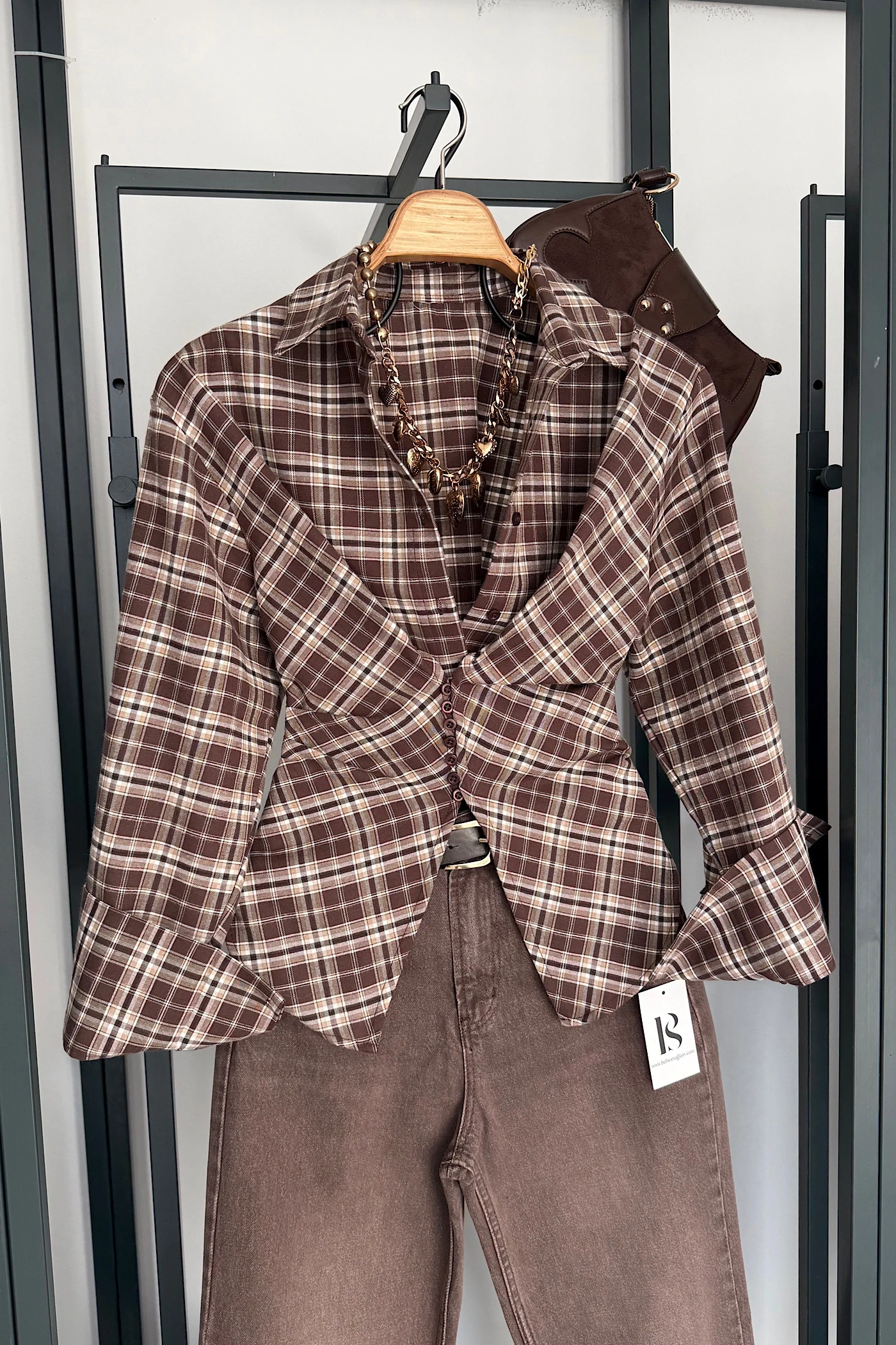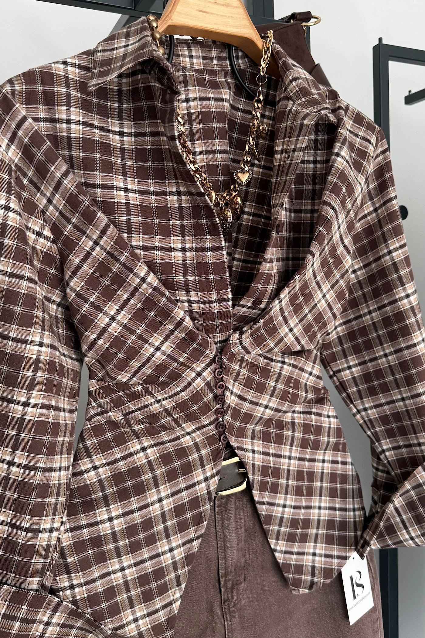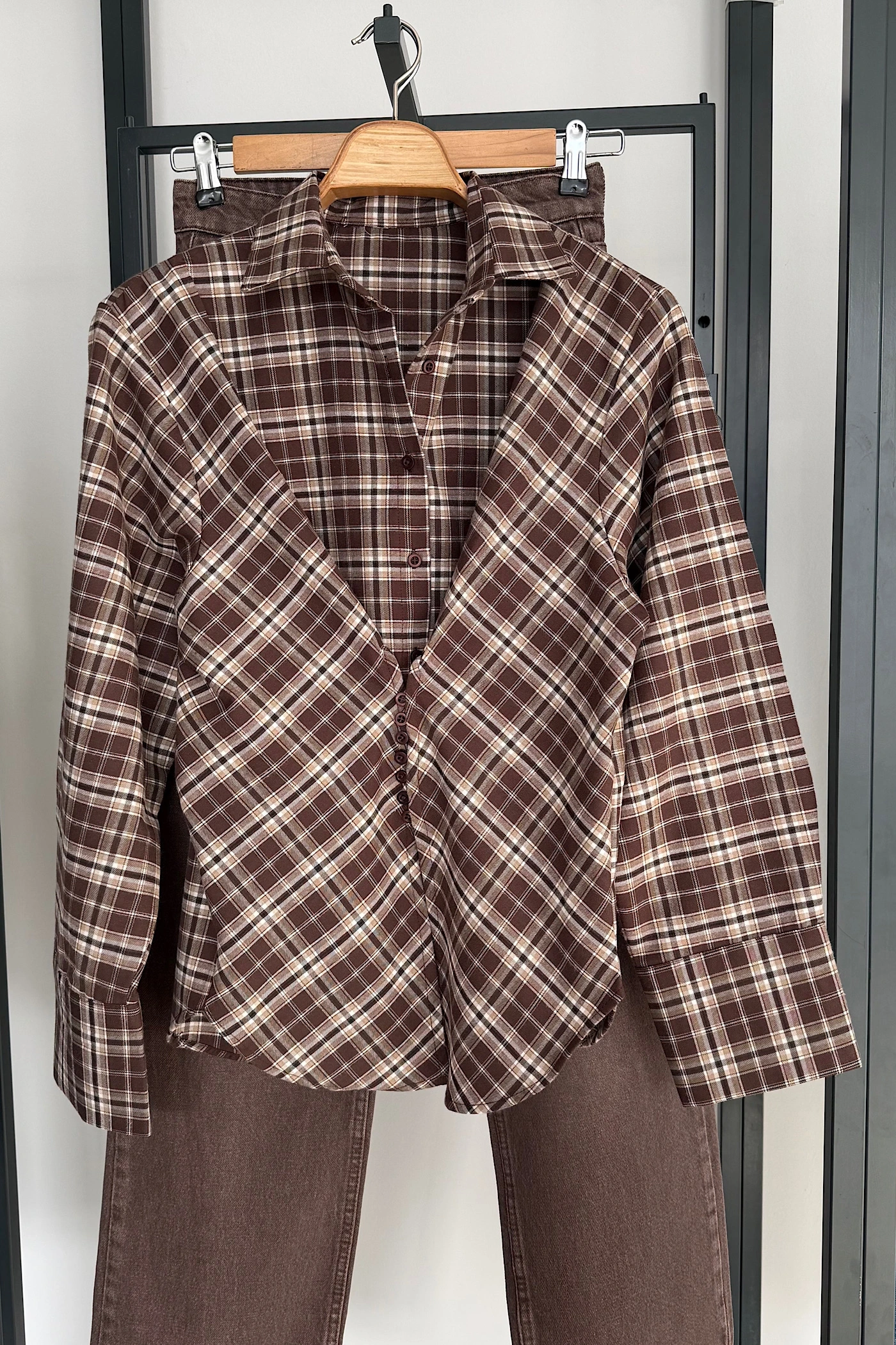Ekose Desen Düğme Detaylı Gömlek Kahve-Ekru
