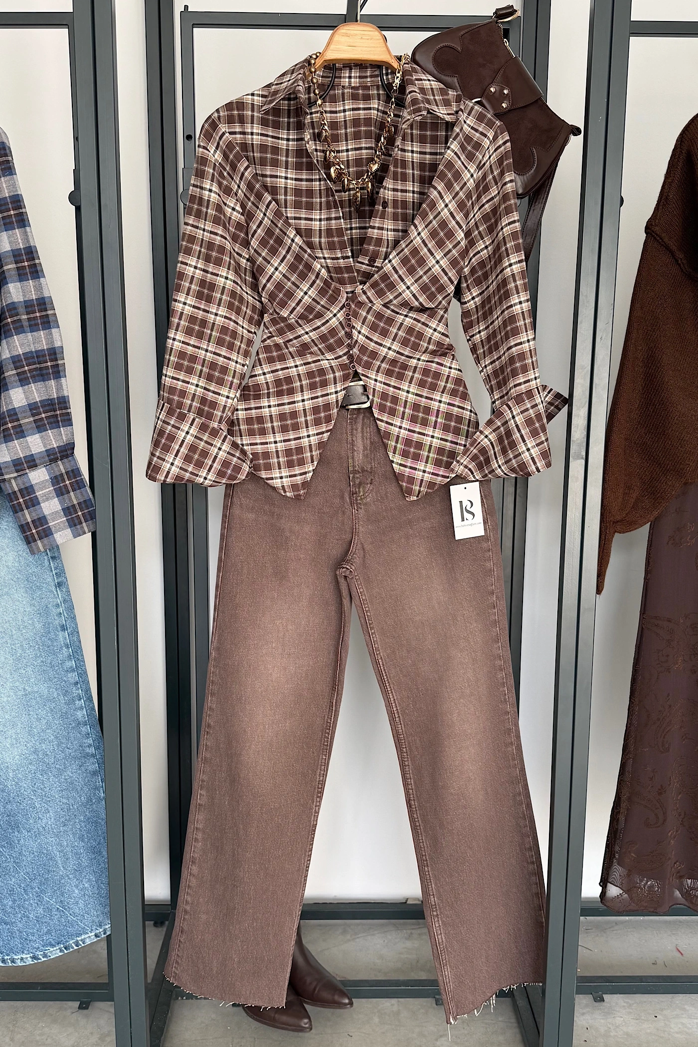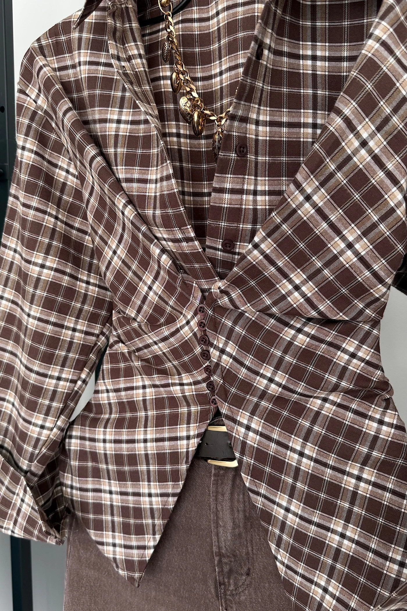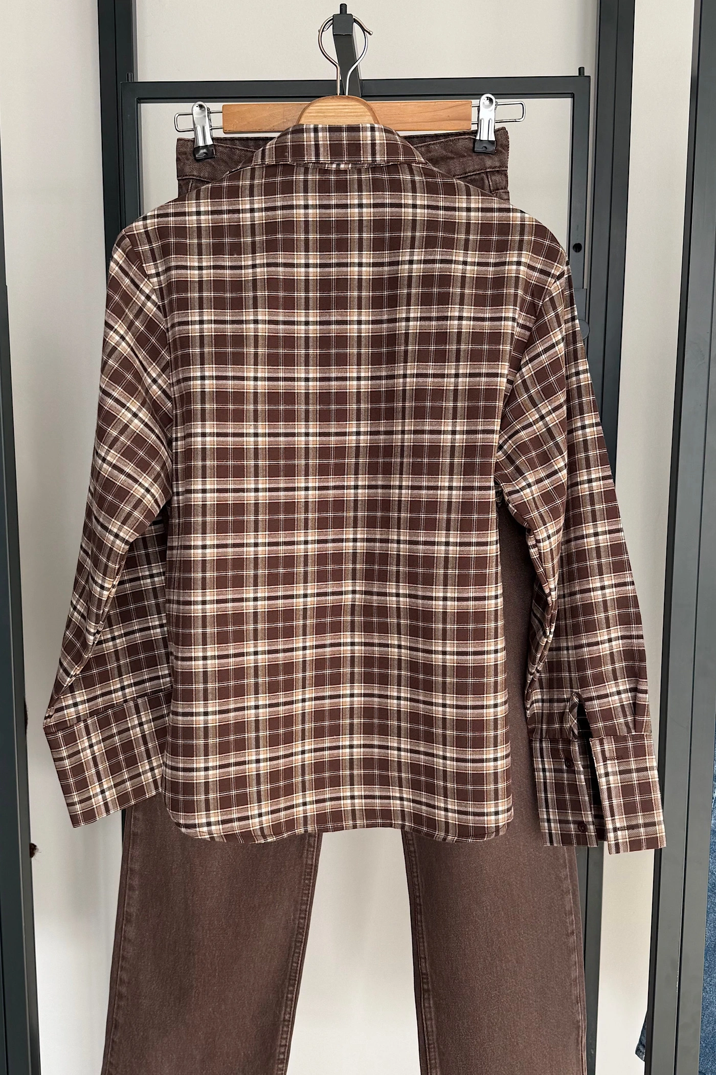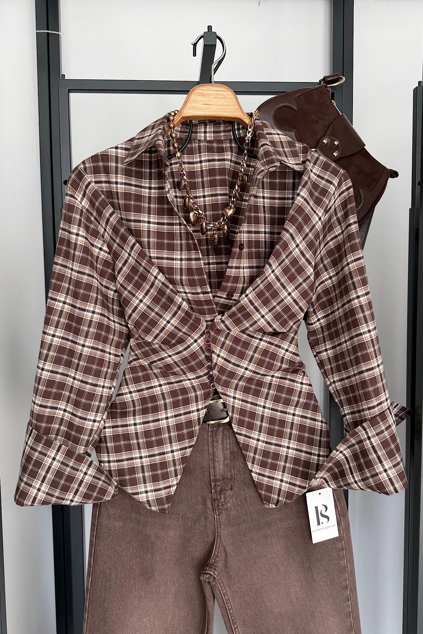 Ekose Desen Düğme Detaylı Gömlek Kahve-Ekru