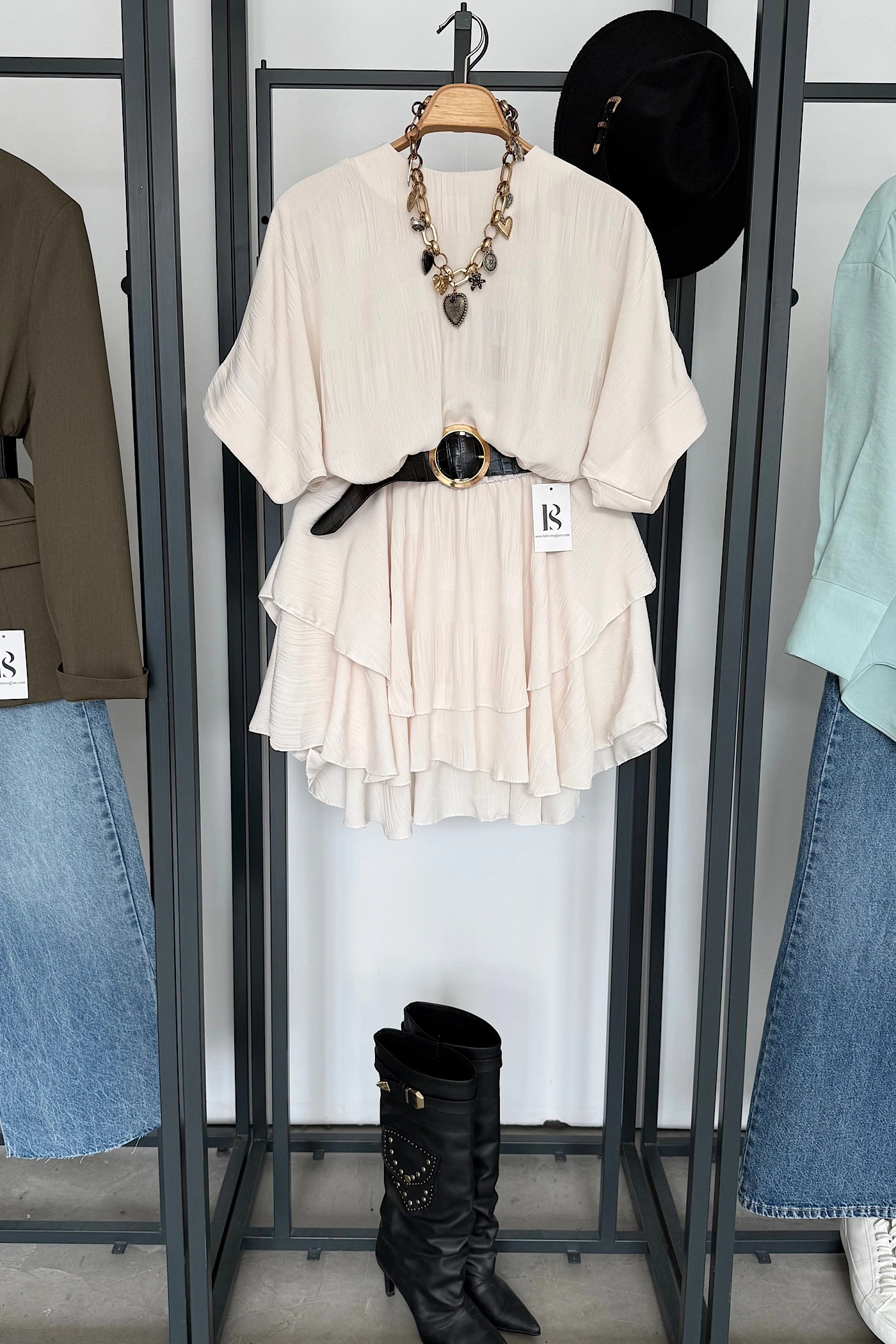 Eteği Katlı Mini Elbise Krem