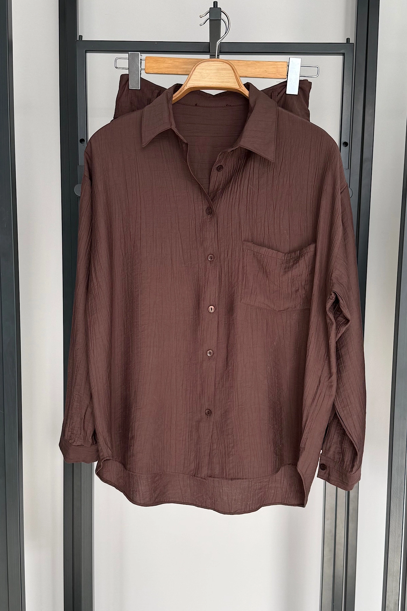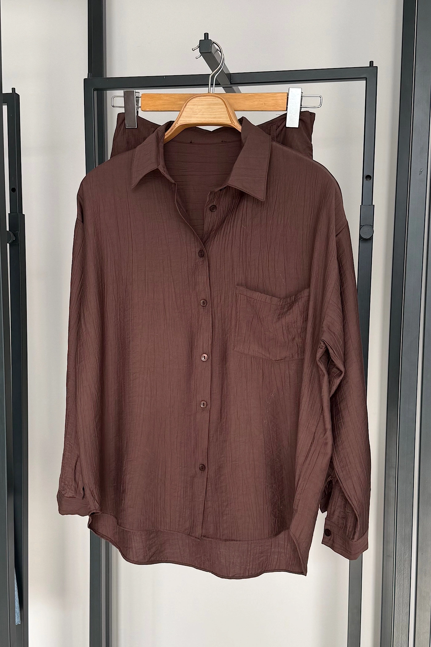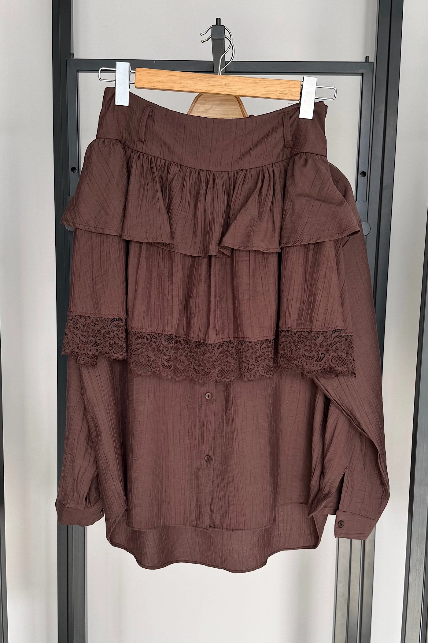 Eteği Katlı Ekose Gömlek Takım Kahverengi