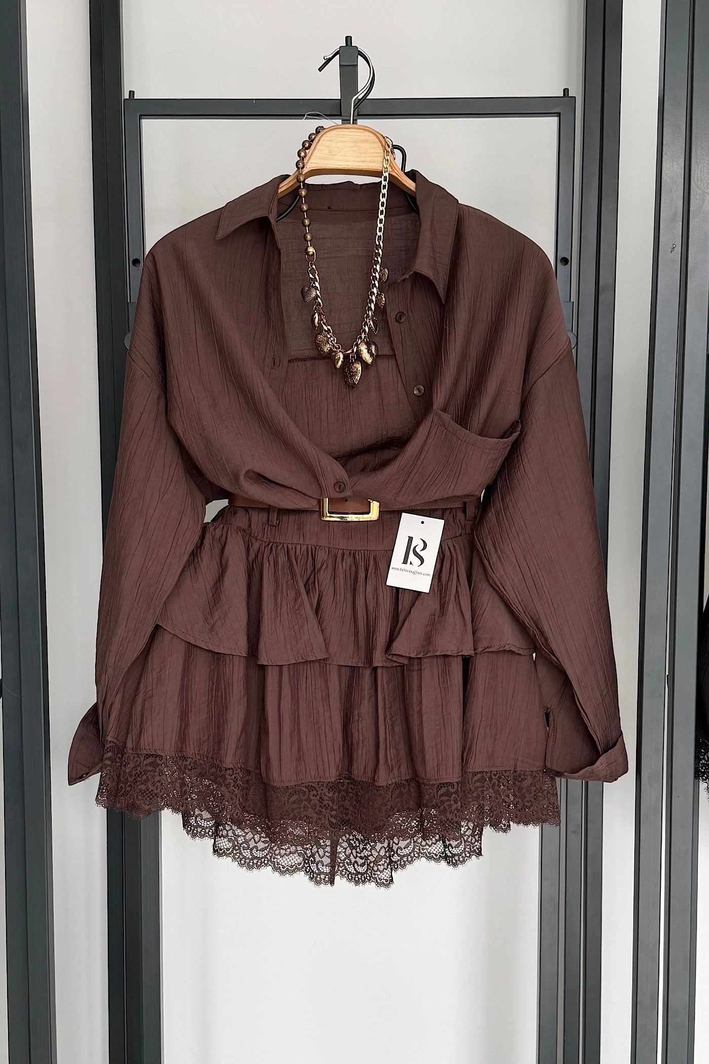 Tasarım Etekli Gömlek Takım Kahve-Mavi