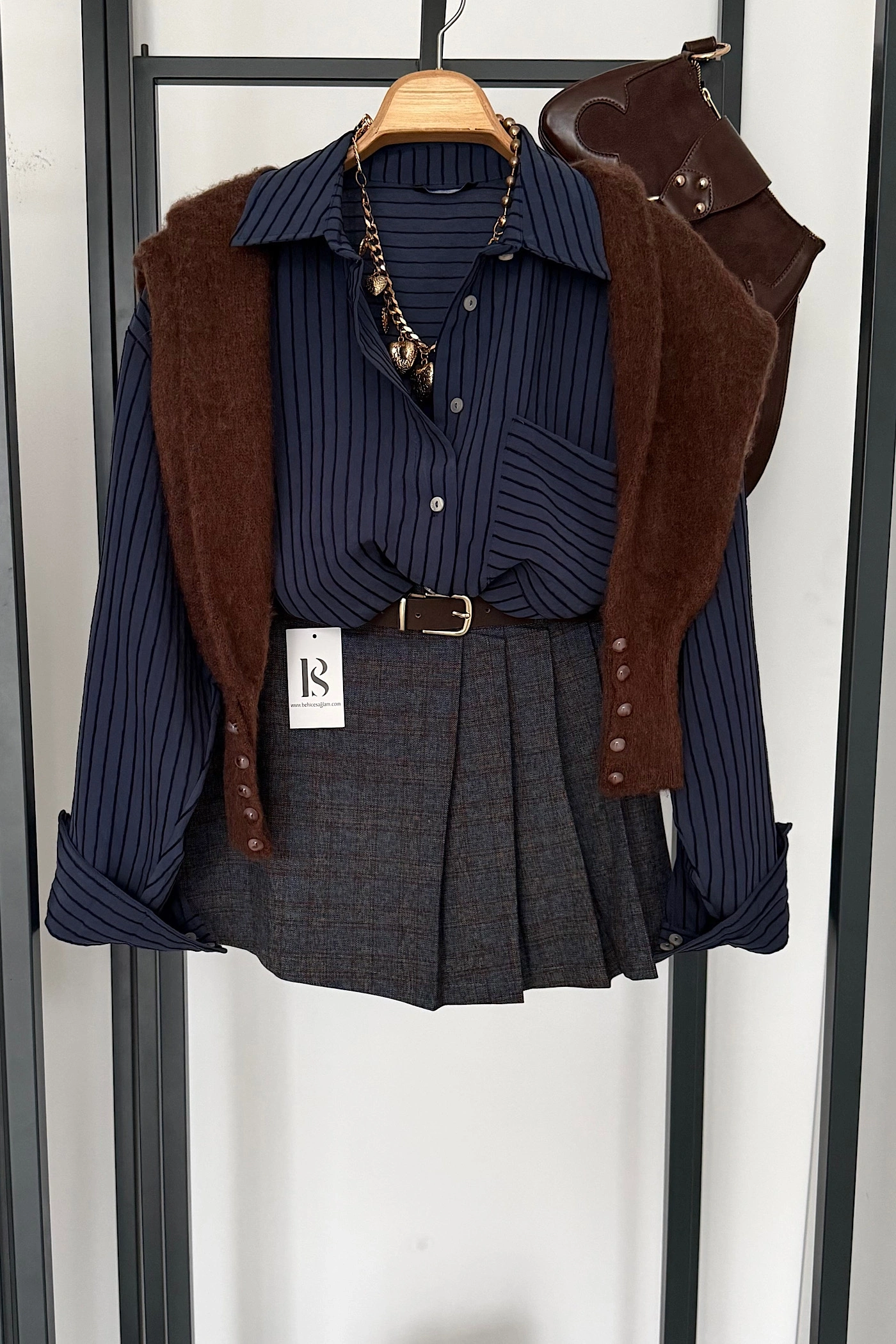 Yandan Yırtmaçlı İskoç Etek Lacivert-Bej