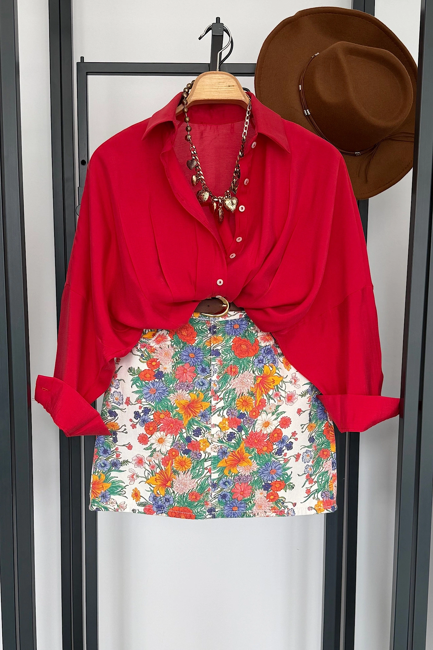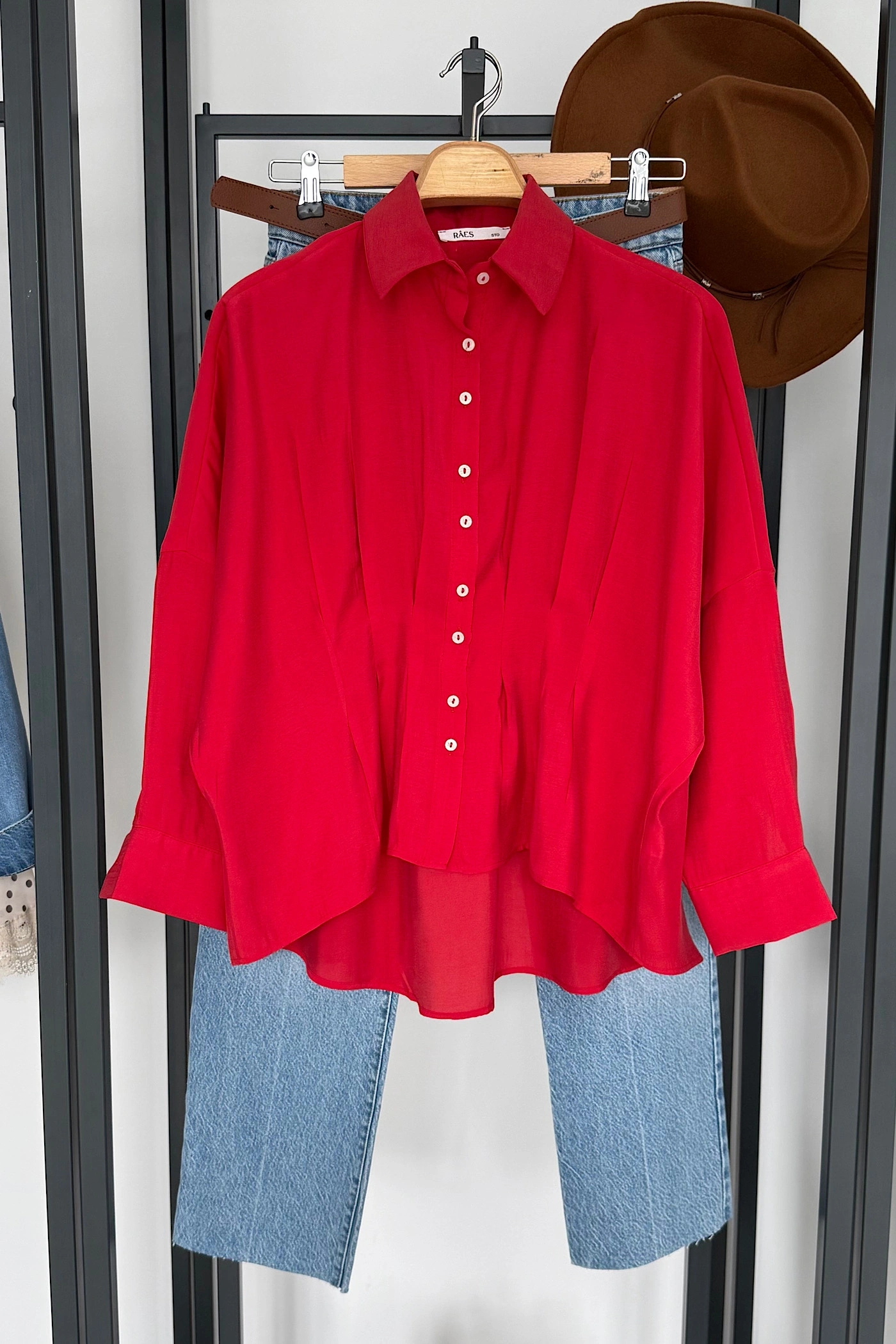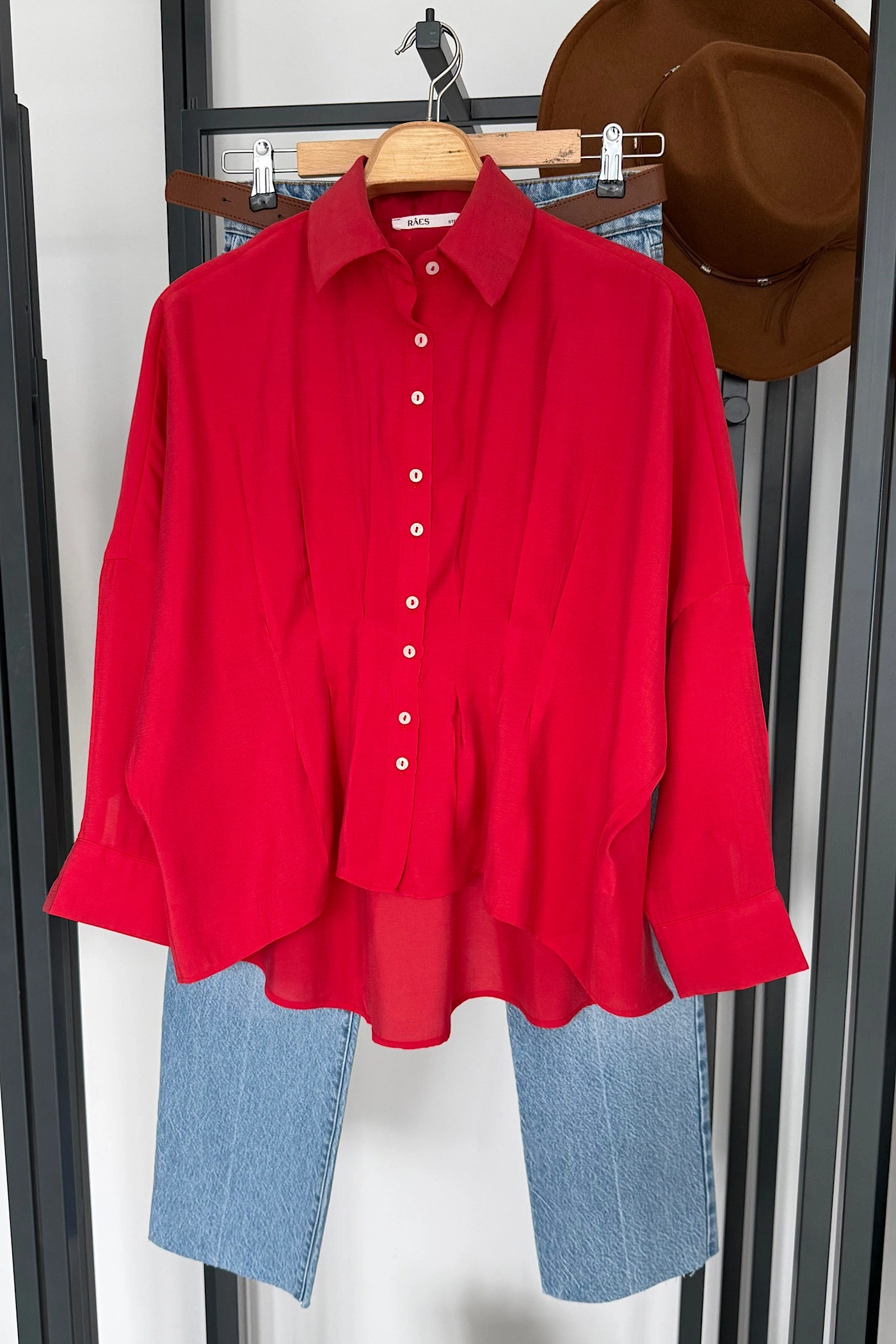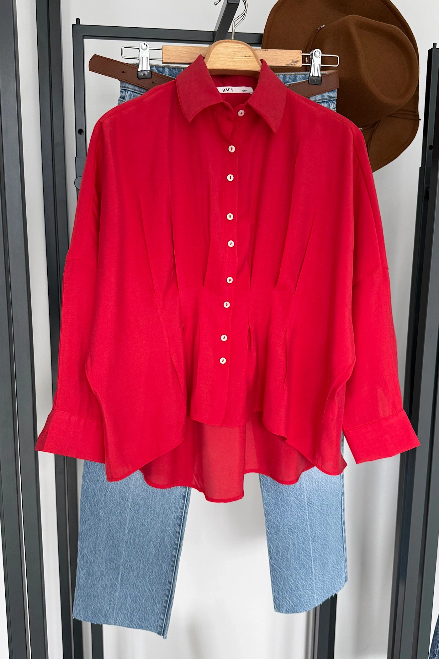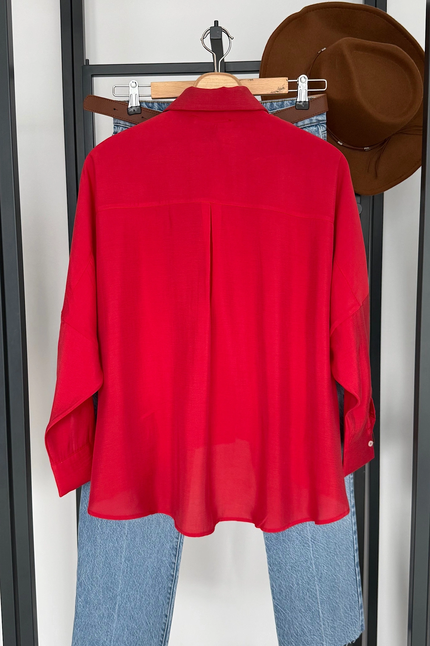 Çizgili Kayık Yaka Gömlek Kırmızı
