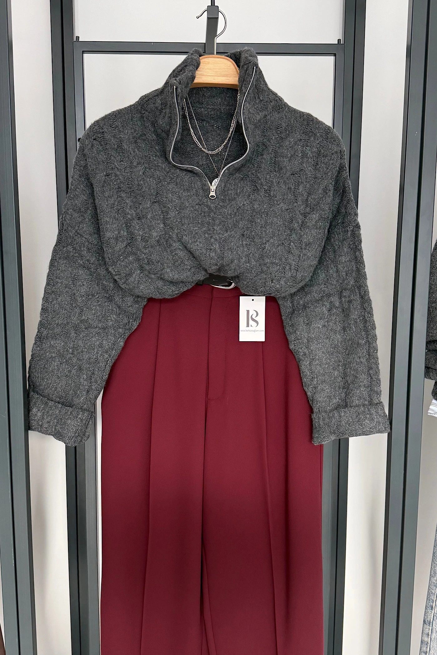 Saç Örgü Fermuarlı Kazak Açık Bej