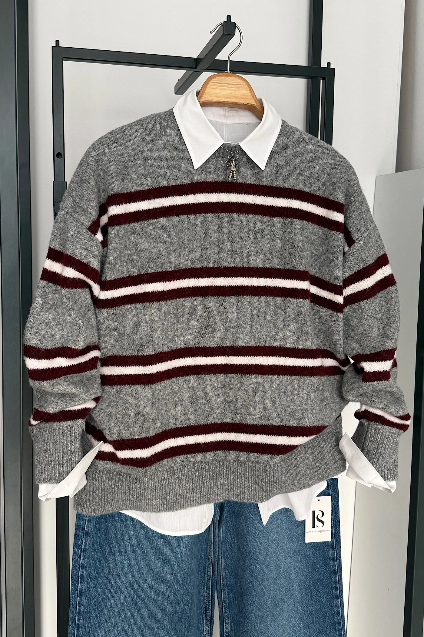 Tek Omzu Açık Çizgili Kazak Koyu Gri-Siyah