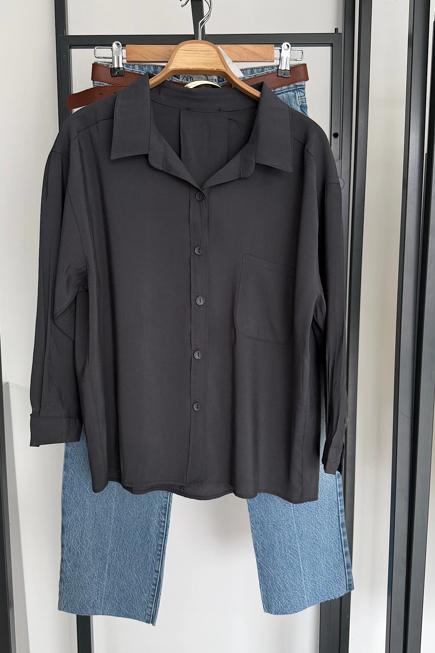 Tek Cep Oversize Gömlek Füme