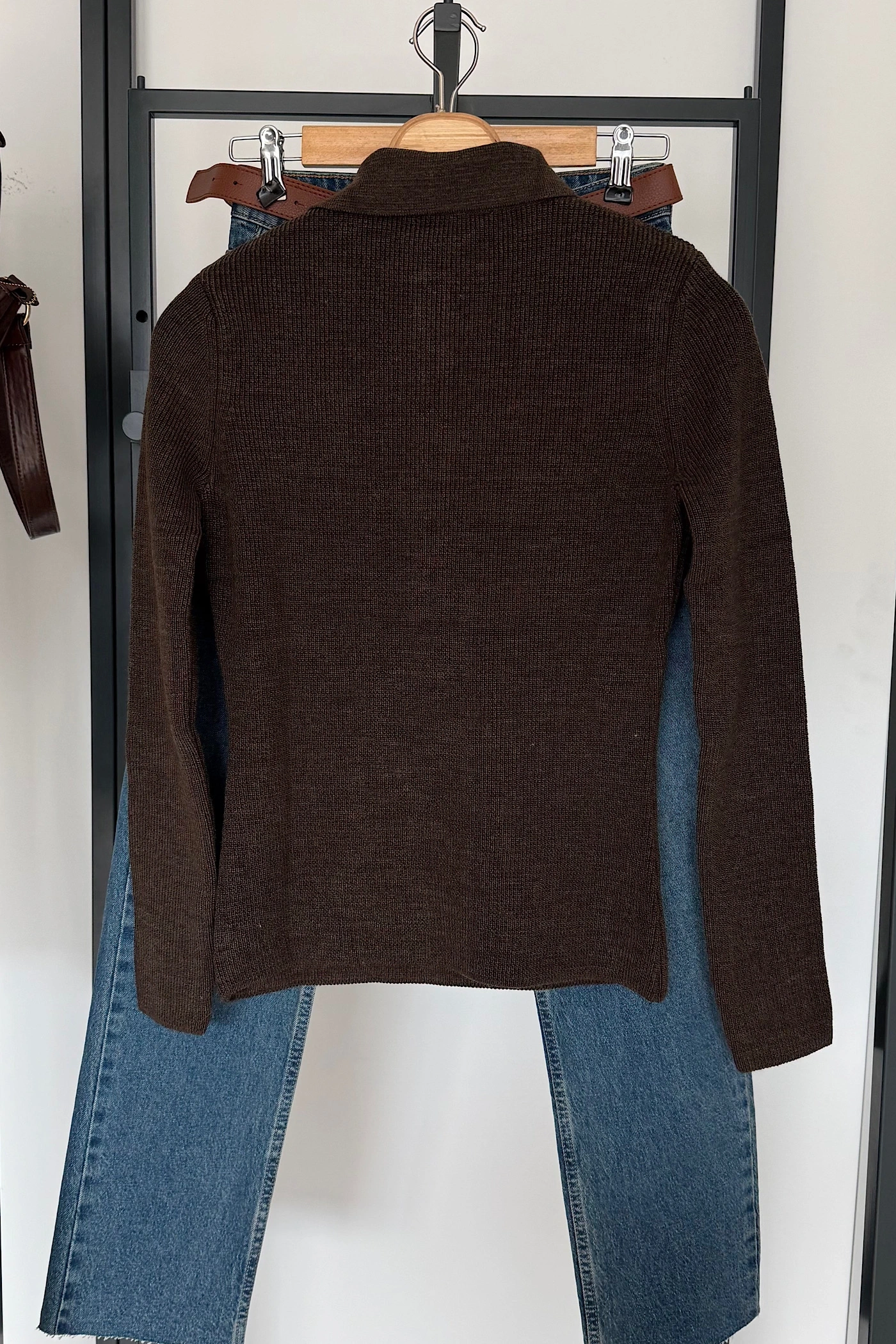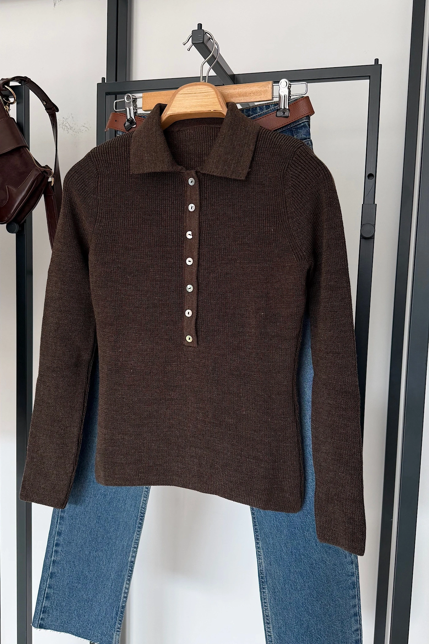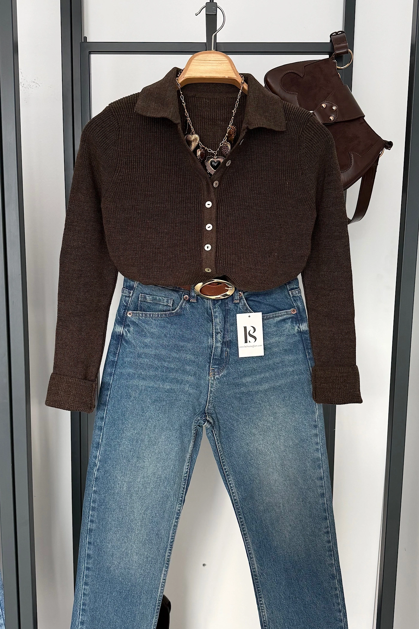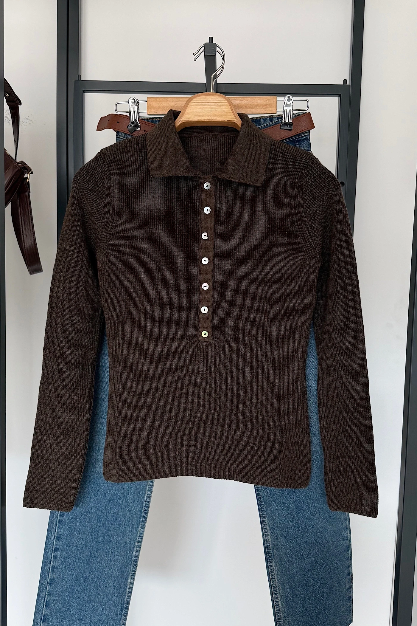 Uzun Kollu Polo Yaka Kazak Koyu Kahve