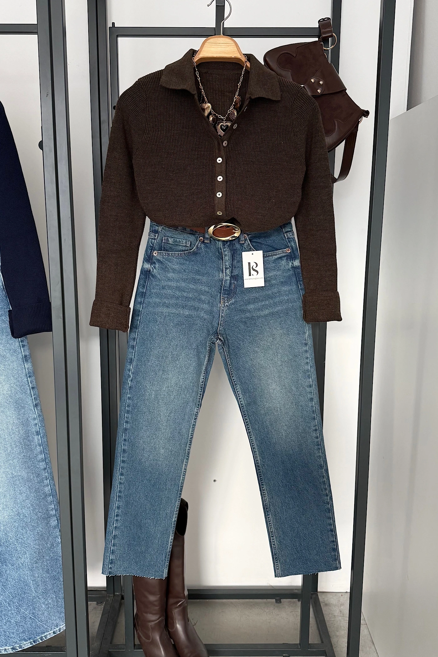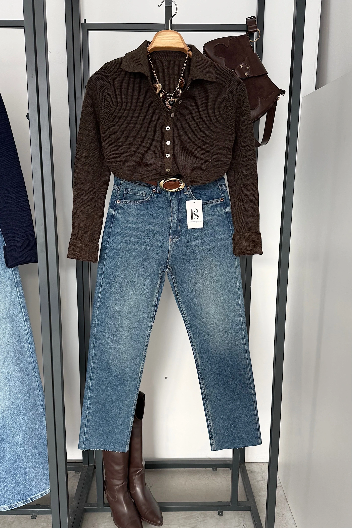 Uzun Kollu Polo Yaka Kazak Kahve Melanj