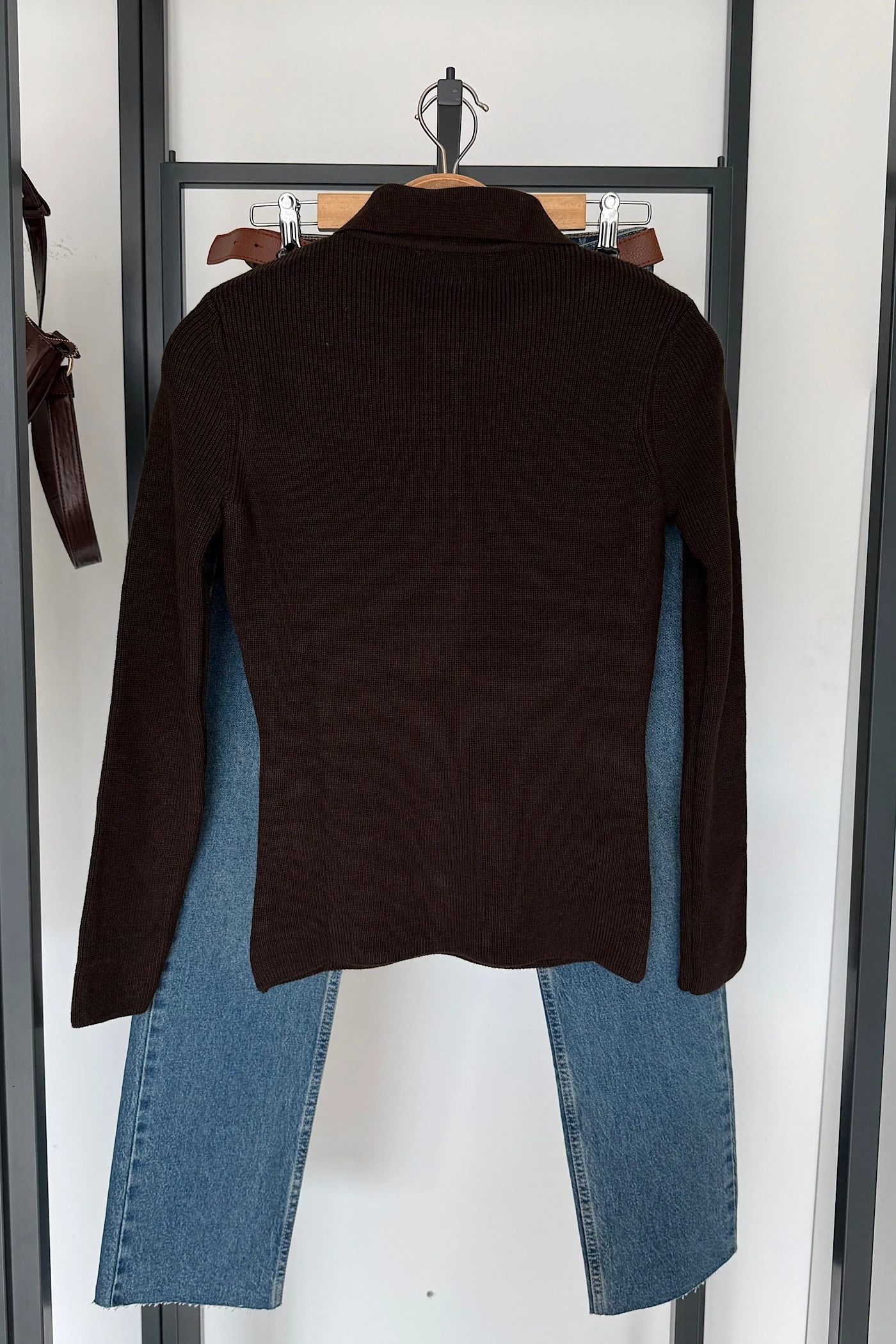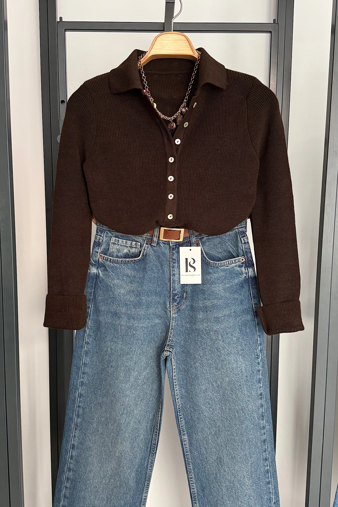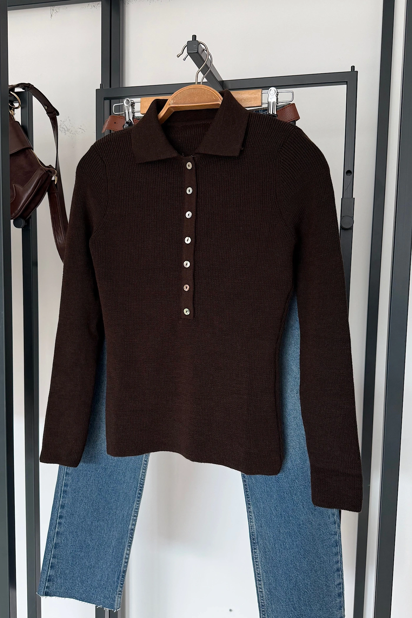 Uzun Kollu Polo Yaka Kazak Koyu Kahve