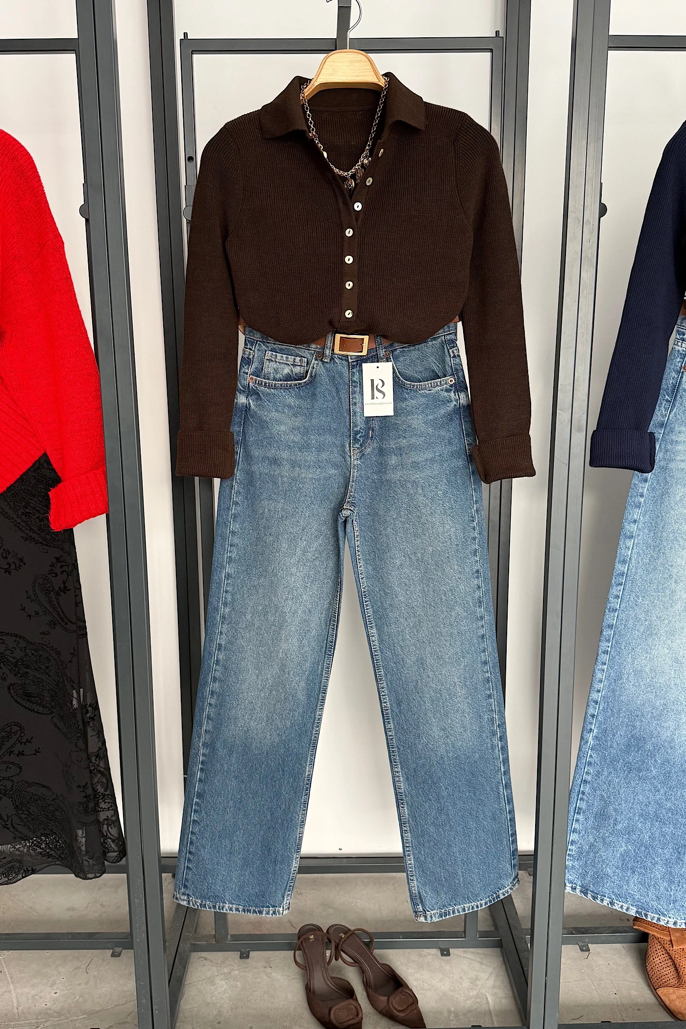 Uzun Kollu Polo Yaka Kazak Kahve Melanj