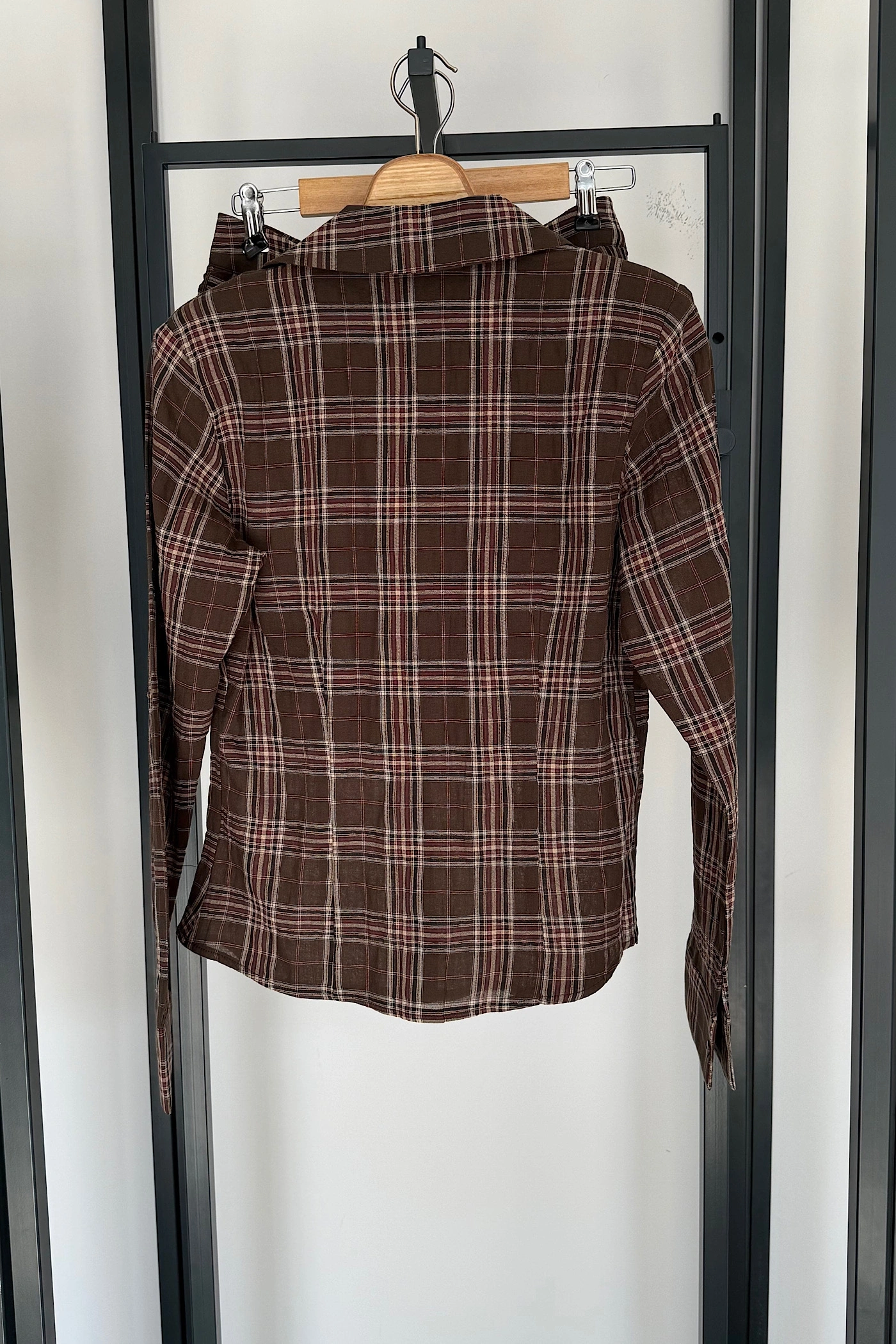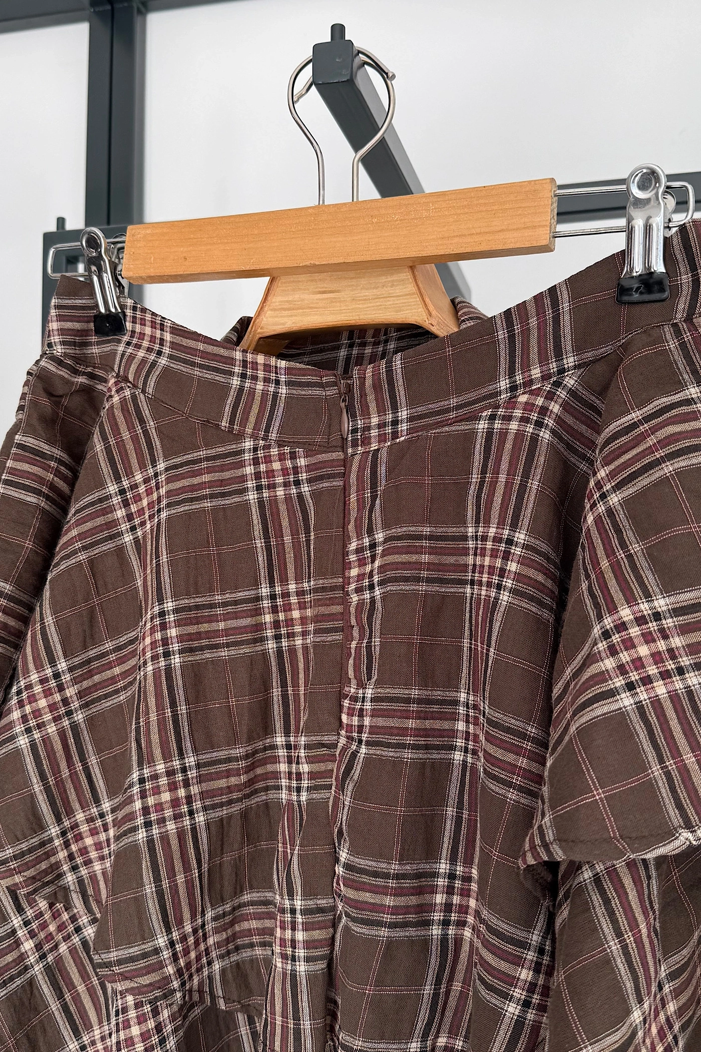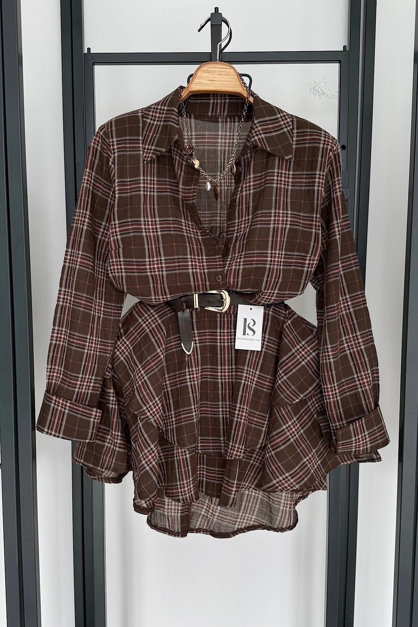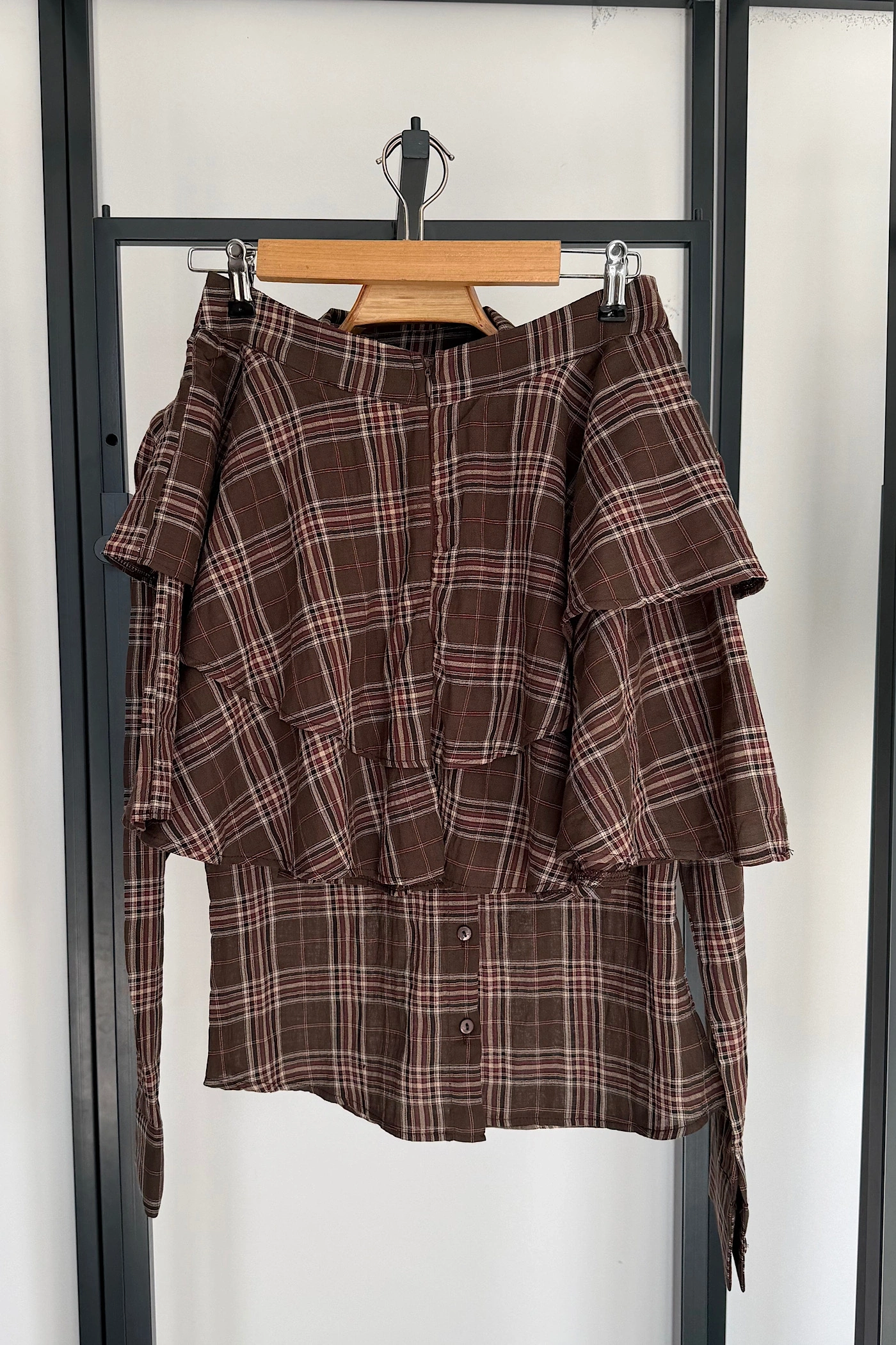 Eteği Katlı Ekose Gömlek Takım Kahverengi