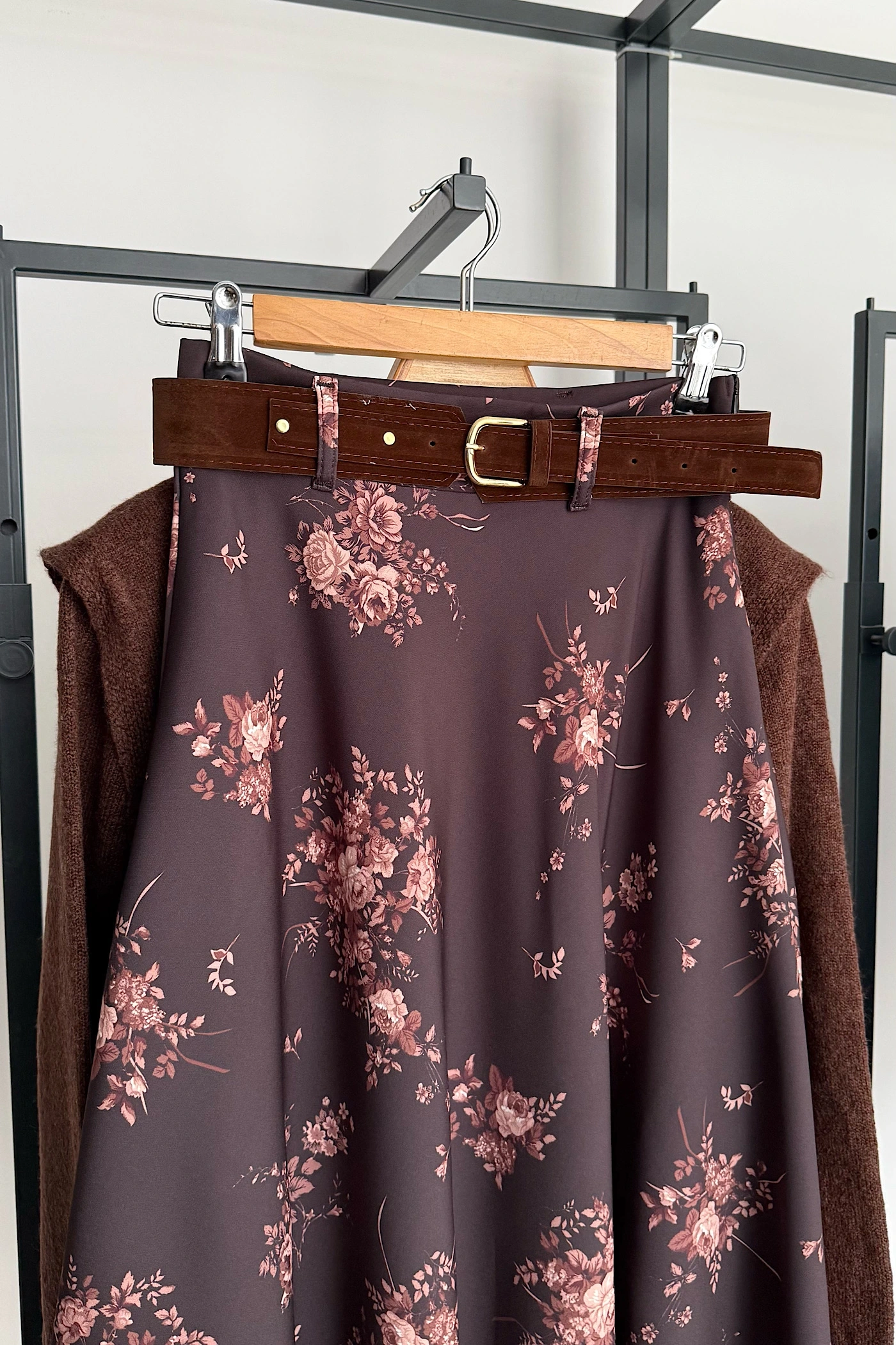 Kendinden Kemerli Çiçek Desen Etek Kahve Çiçek
