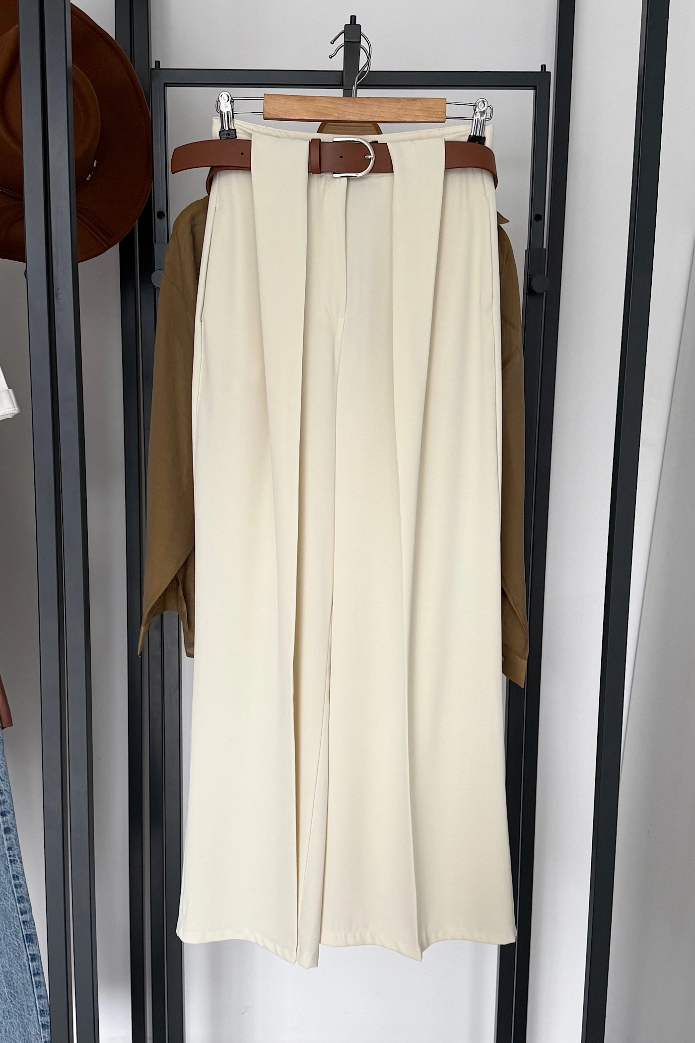 Kendinden Kemerli Kumaş Pantolon Ekru