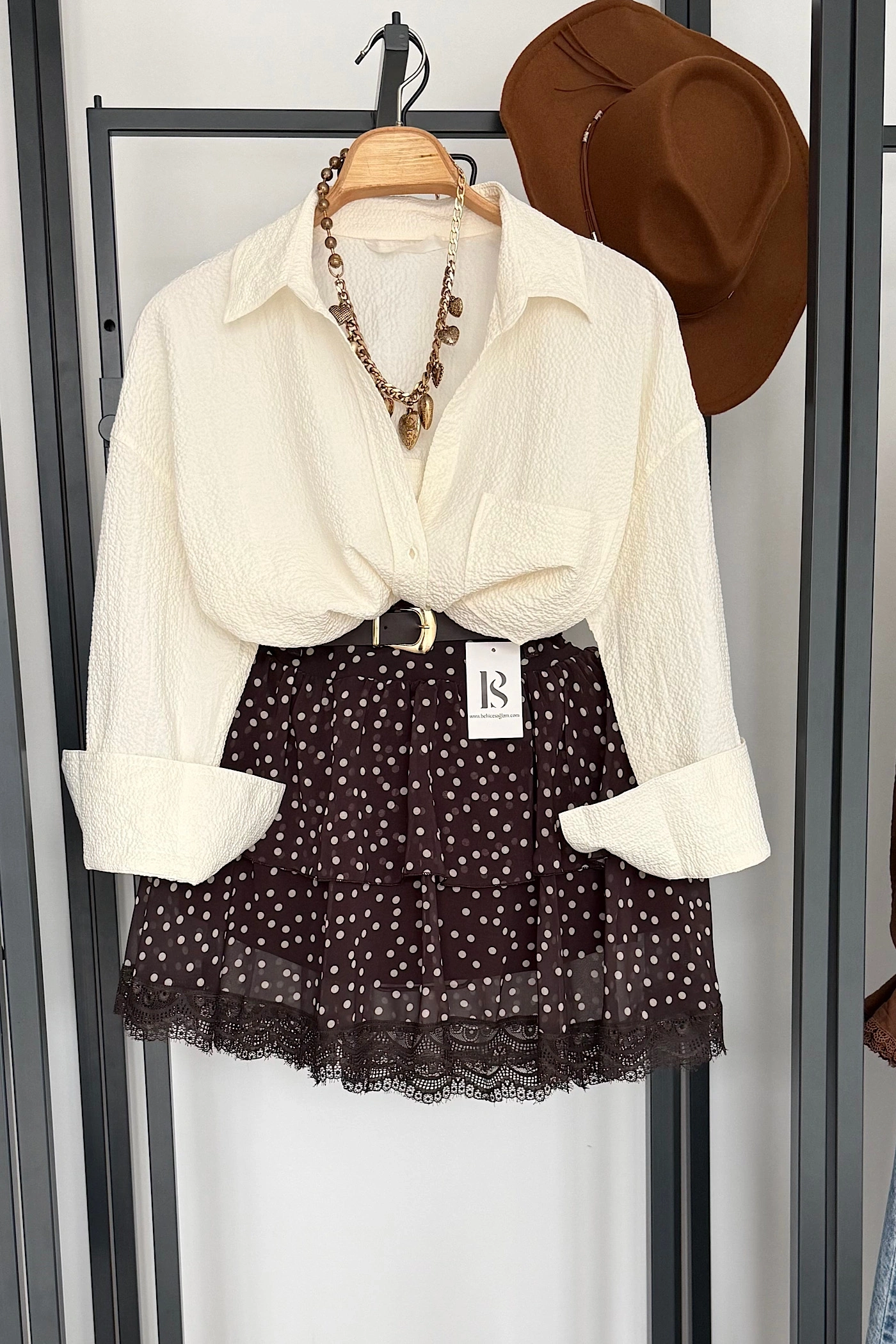 Kendinden Kemerli Puantiyeli Şifon Etek Kahverengi