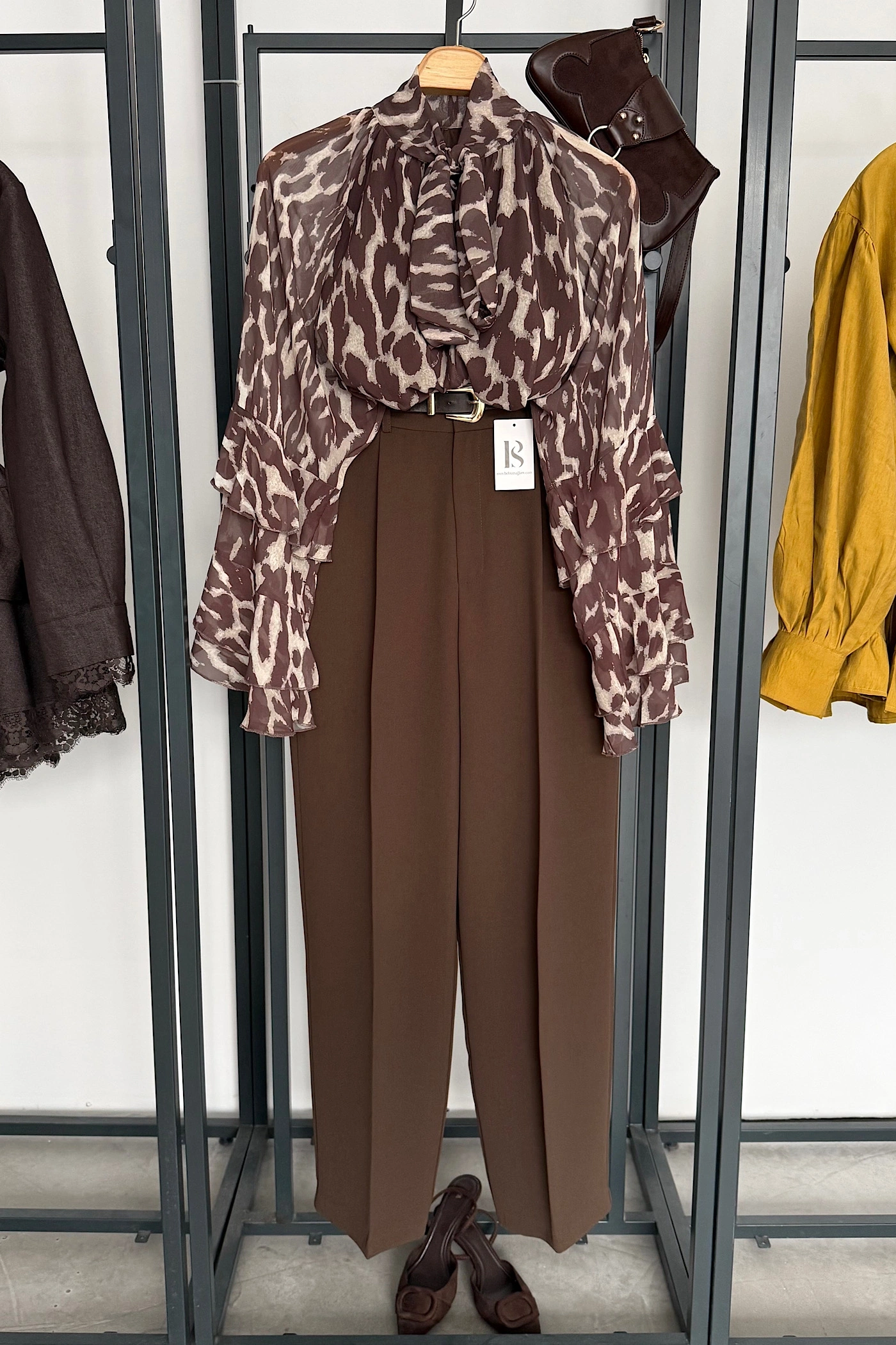 Tasarım Volanlı Bağlama Detaylı Gömlek Kahverengi