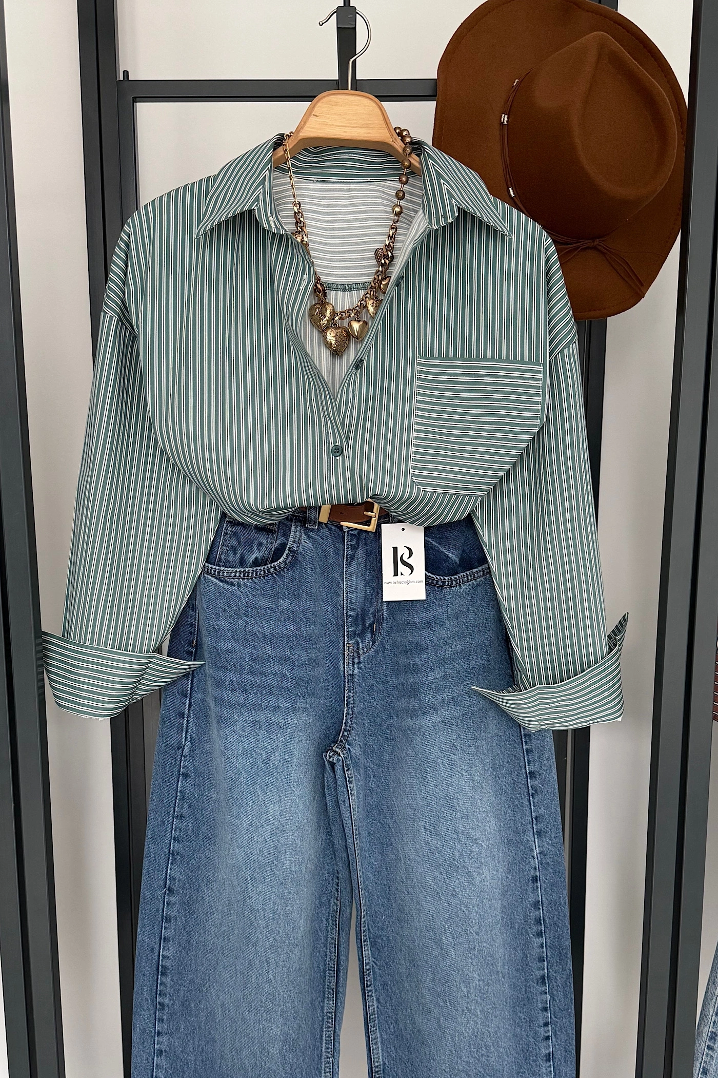 Oversize Çizgili Cepli Gömlek Yeşil