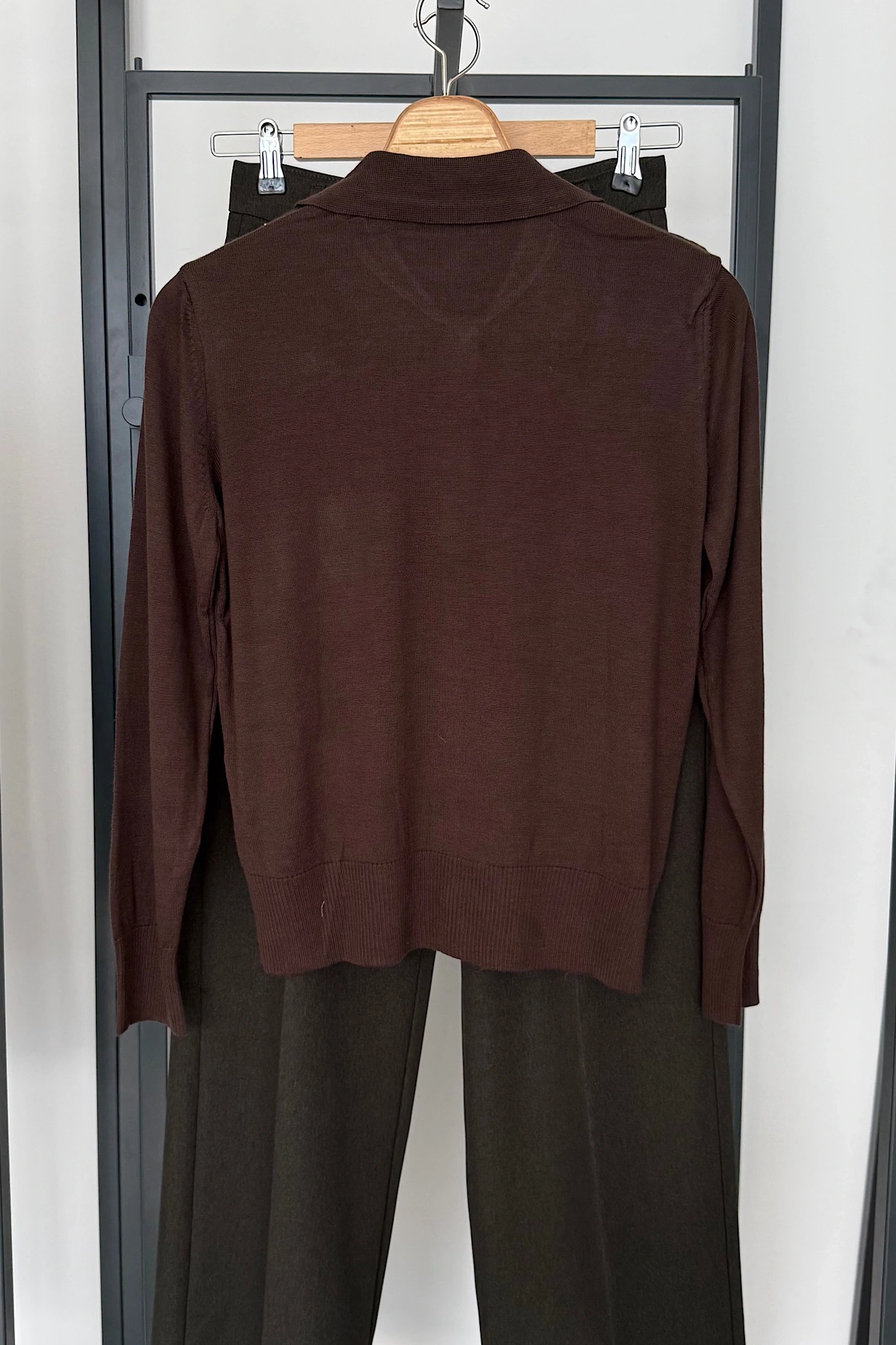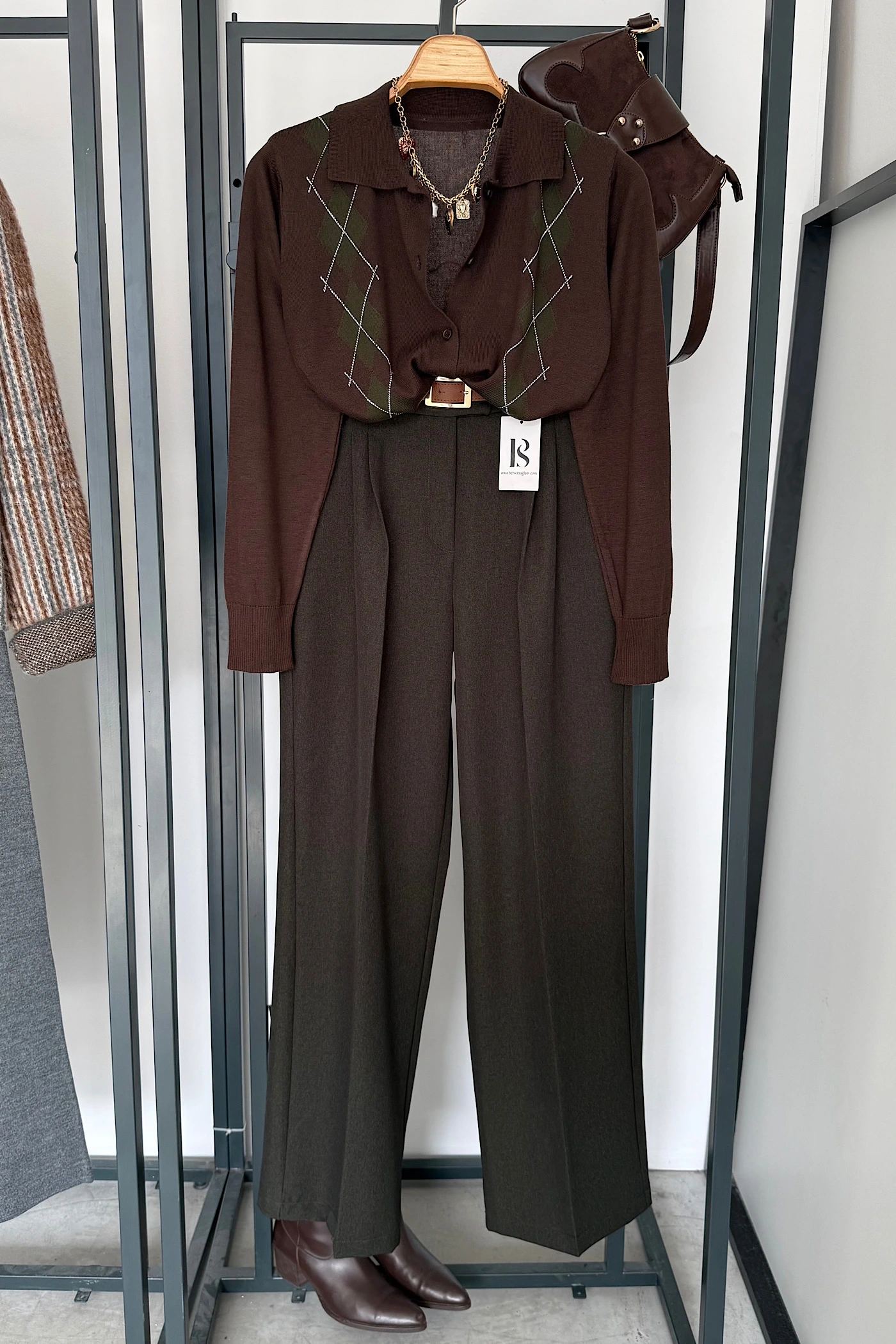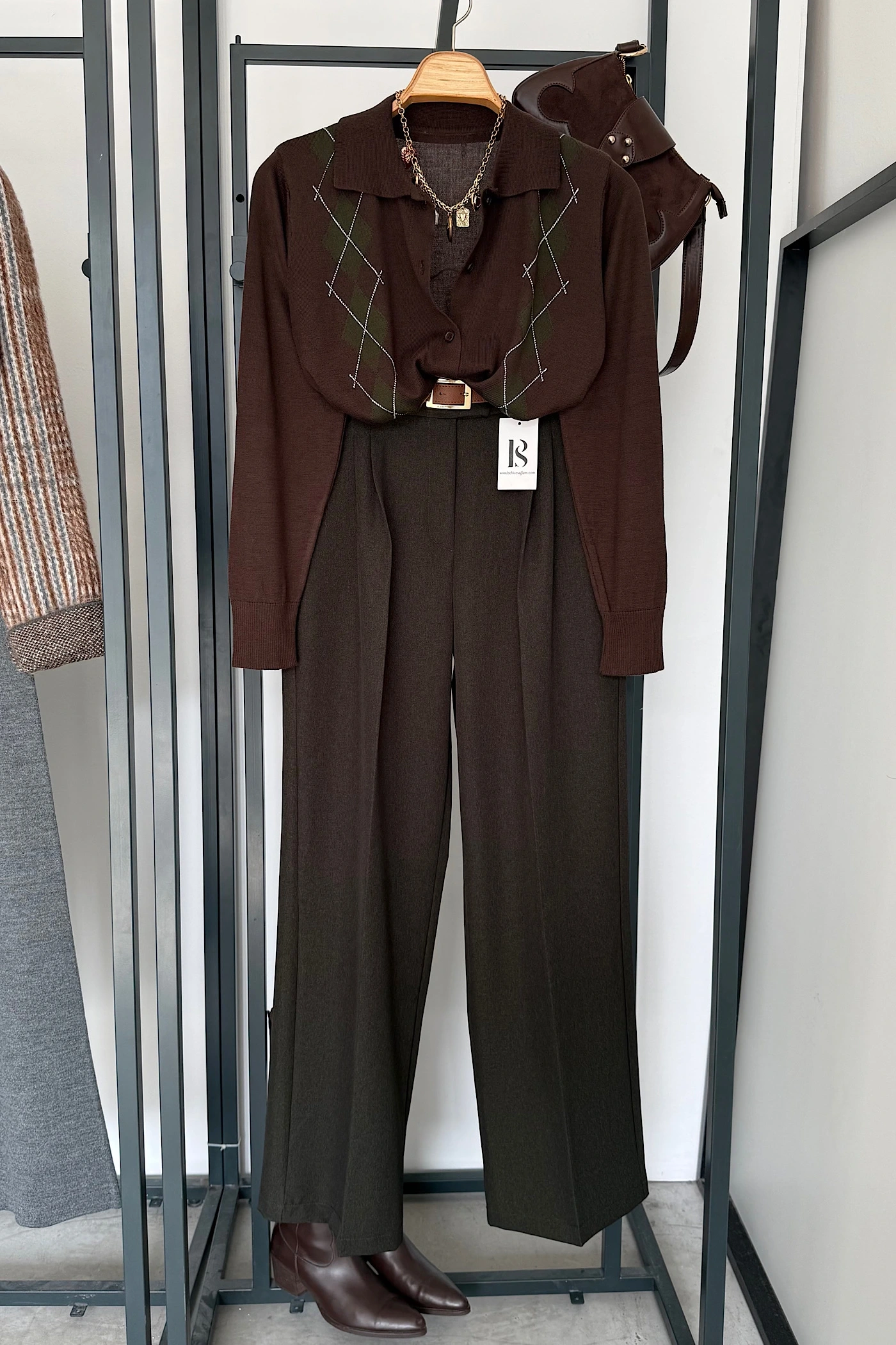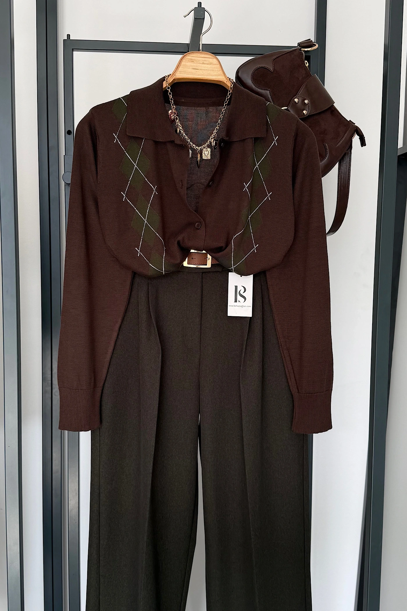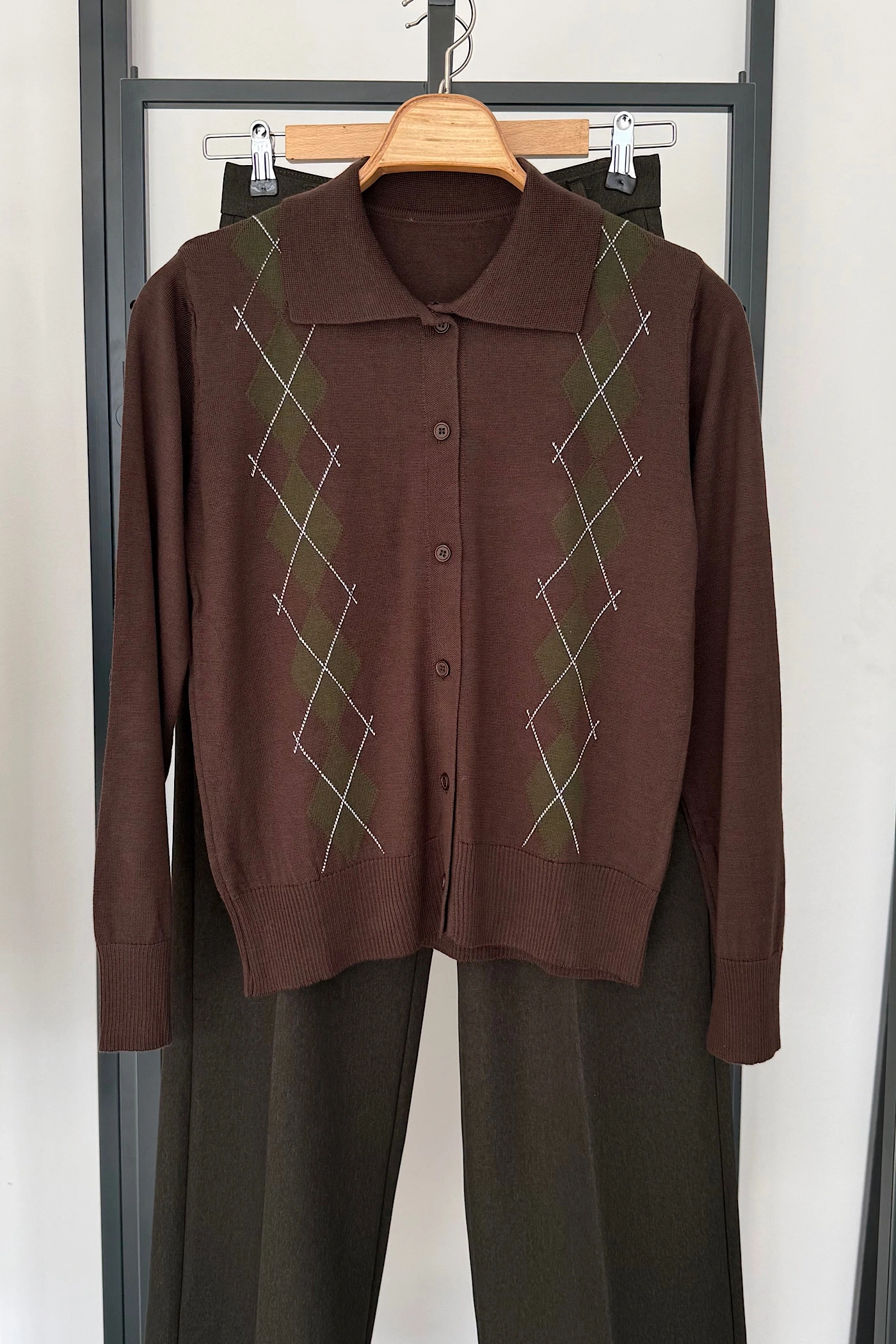 Polo Yaka Baklava Desen Hırka Kahverengi