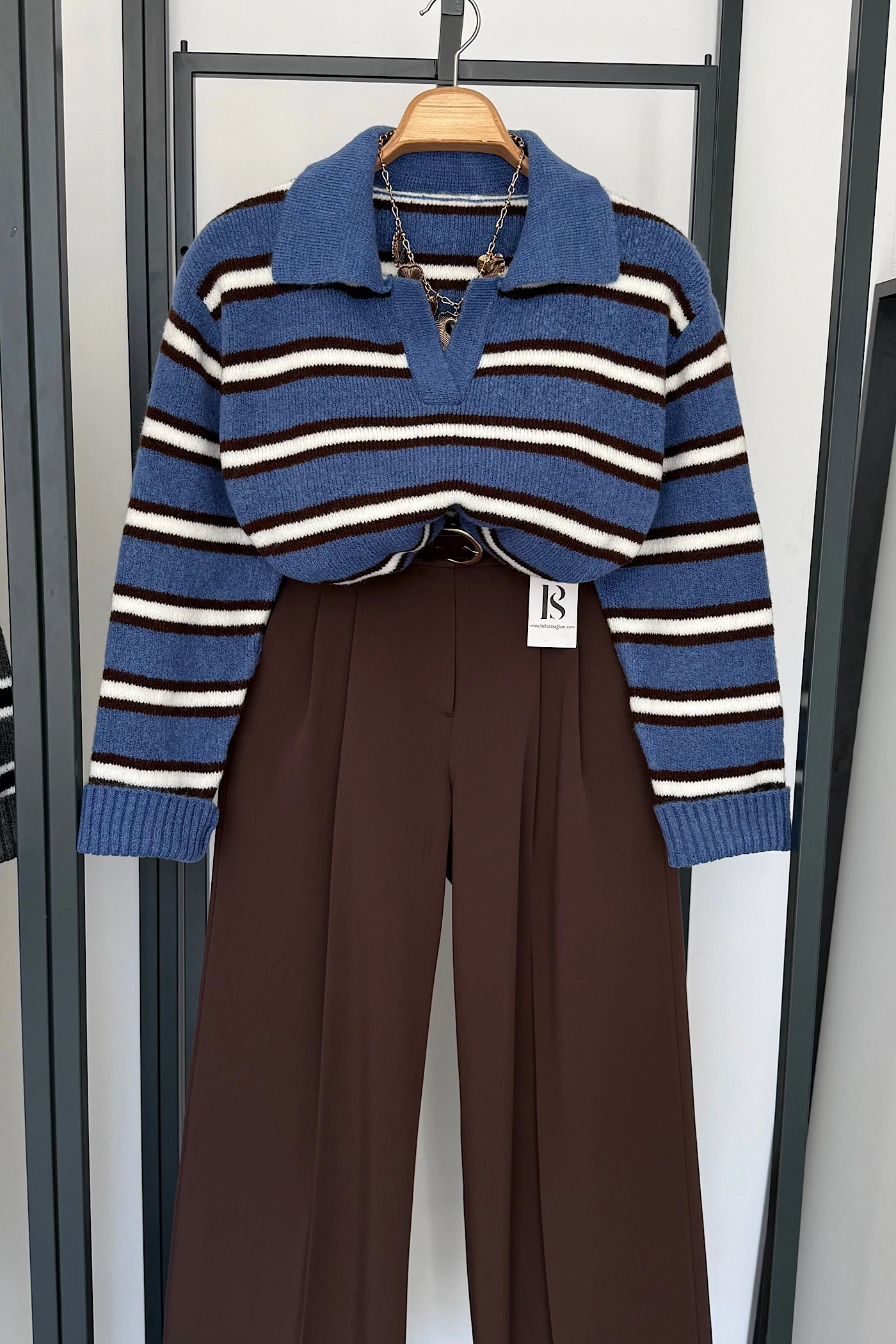 Kaplama Düğmeli Çizgili Gömlek Camel-Lacivert