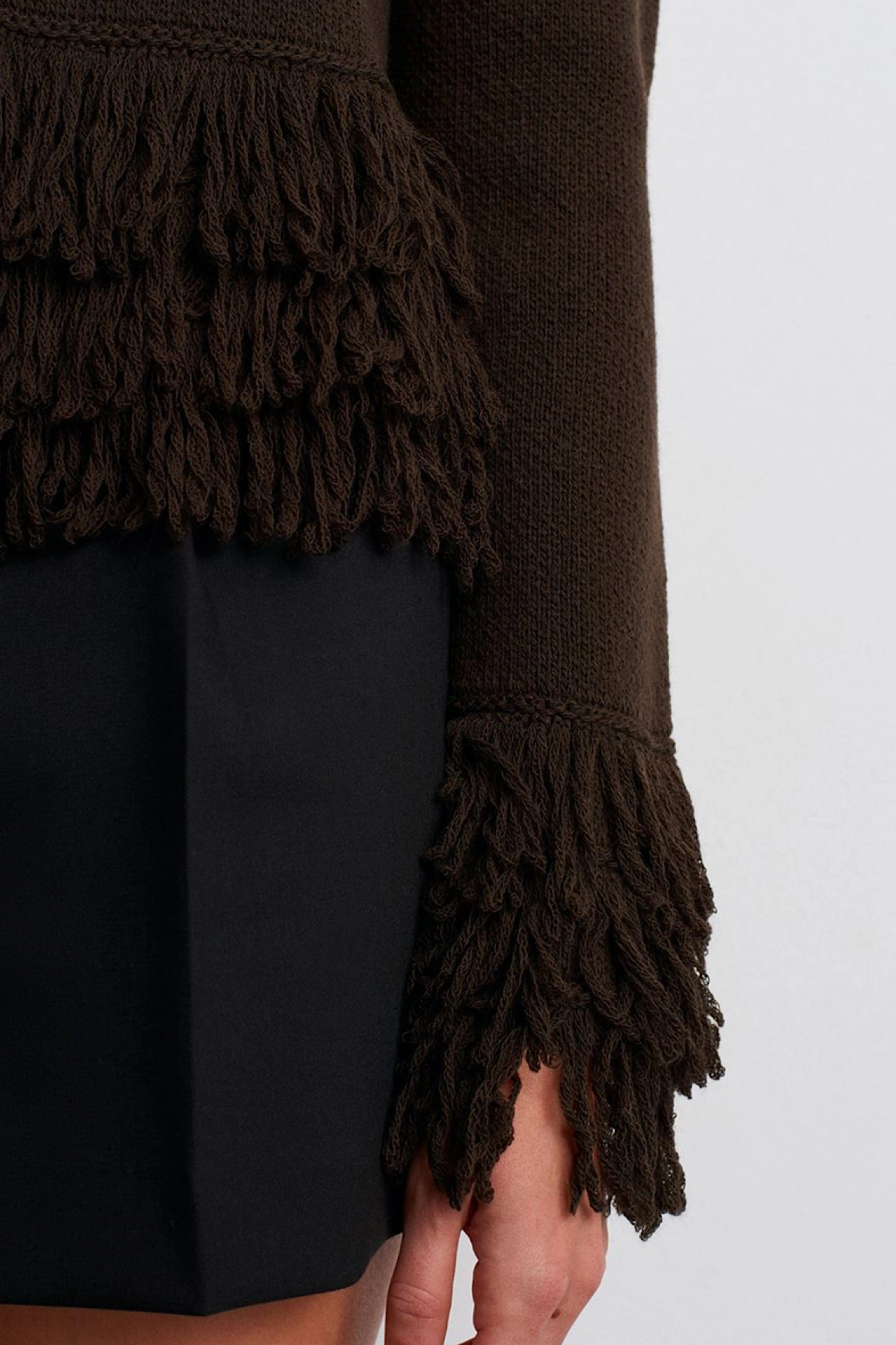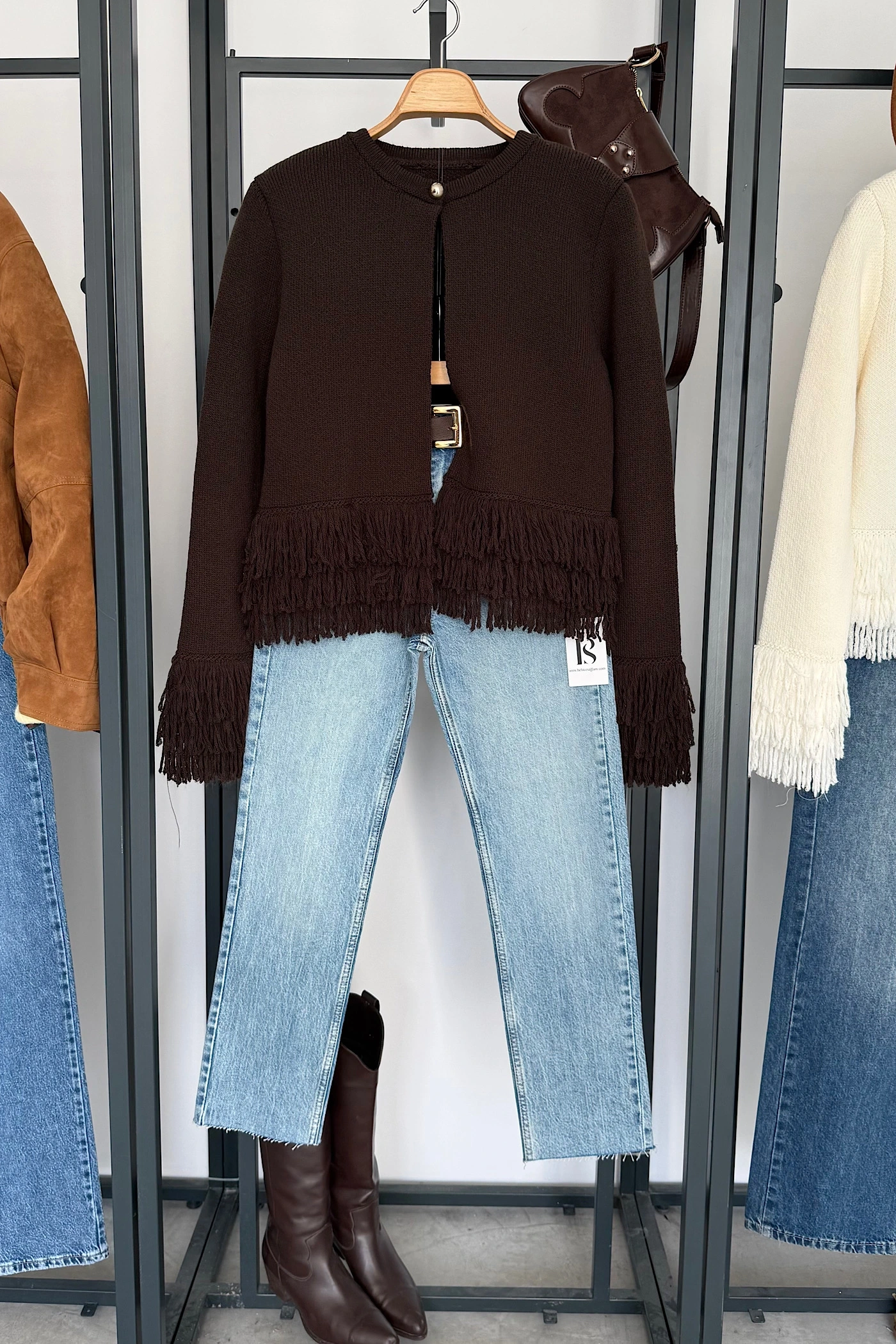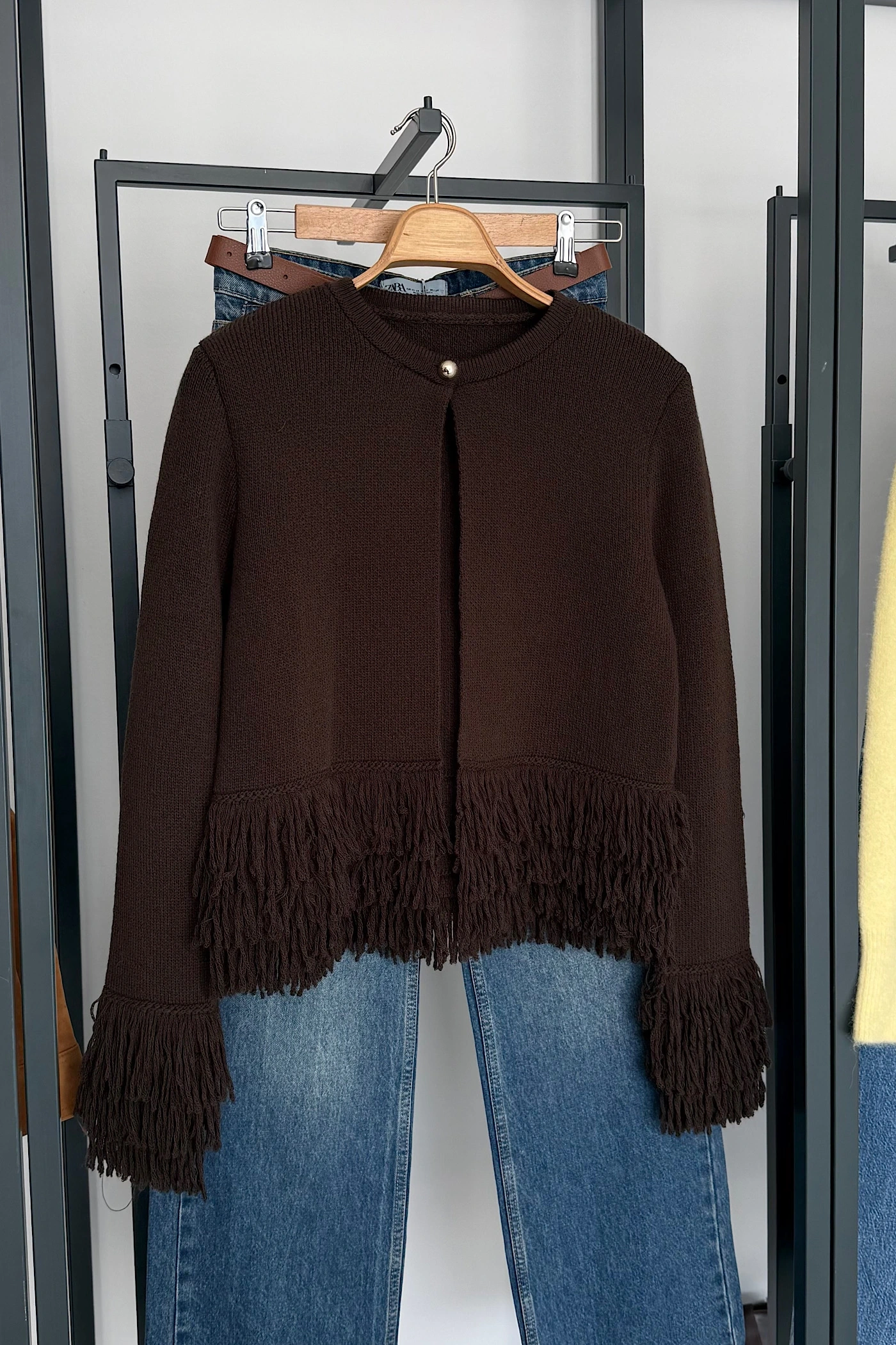 Püsküllü Düğmeli Triko Hırka Kahverengi