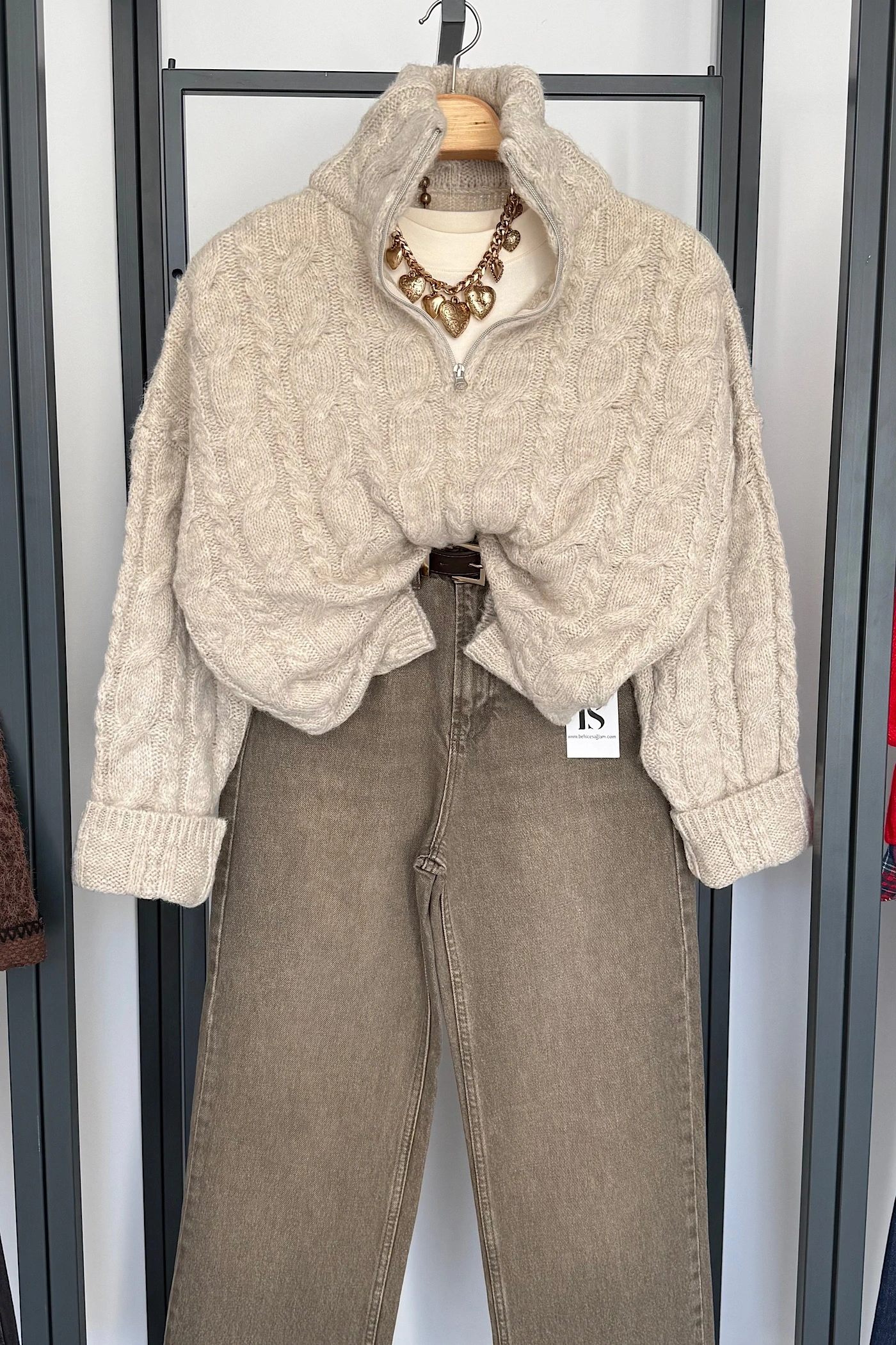 Saç Örgü Fermuarlı Kazak Açık Bej