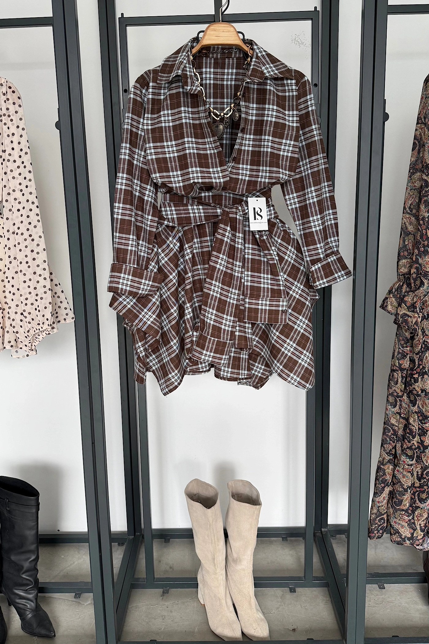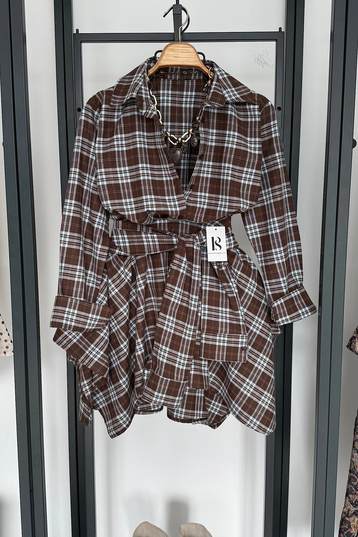 Tasarım Etekli Gömlek Takım Kahve-Mavi