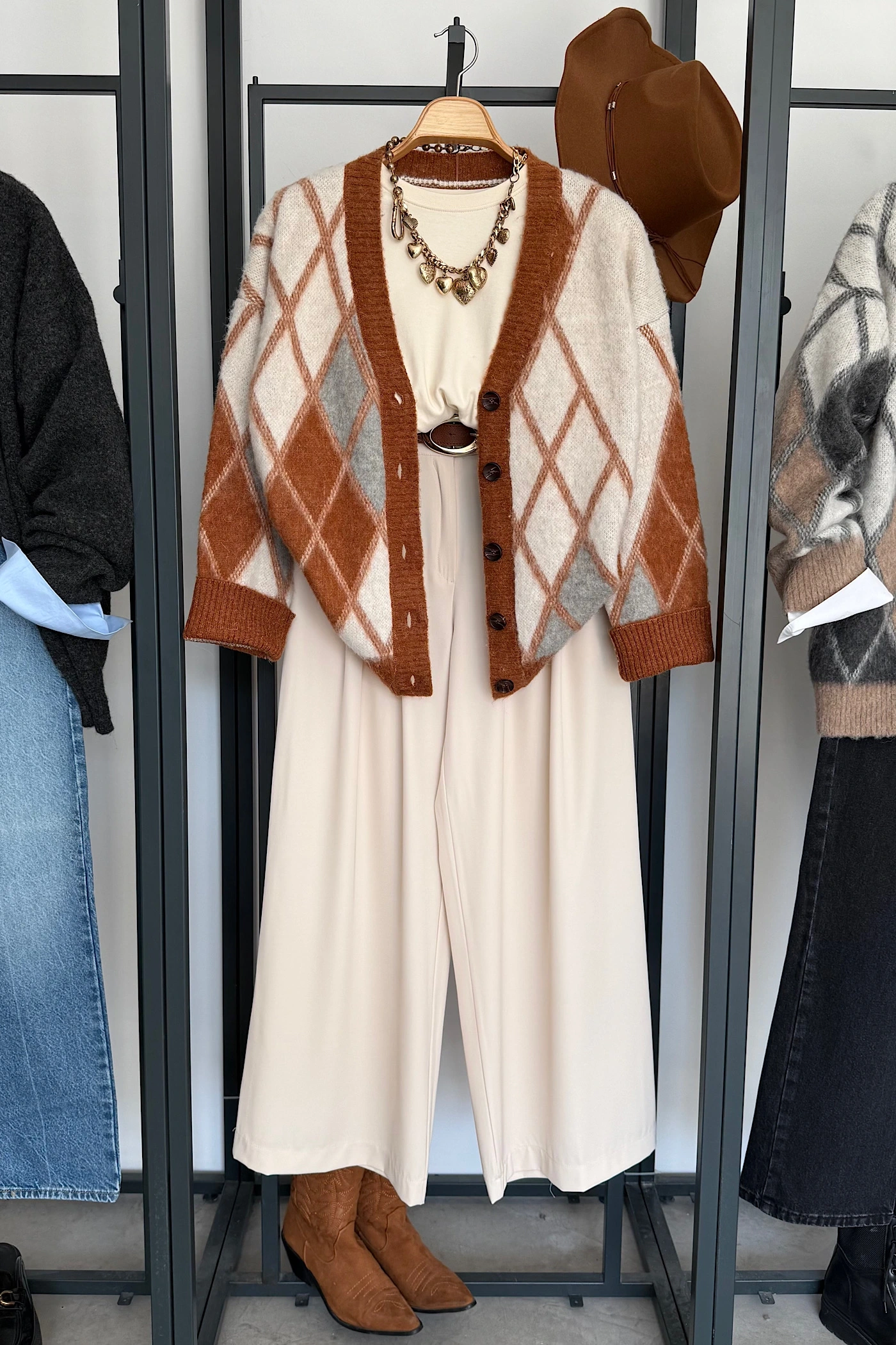 V Yaka Baklava Desenli Şardonlu Triko Hırka Vizon