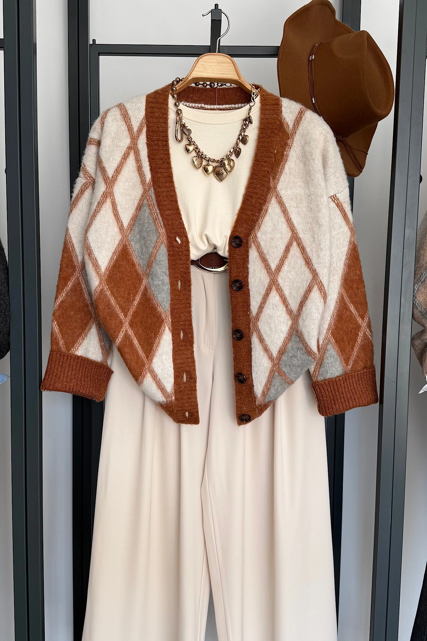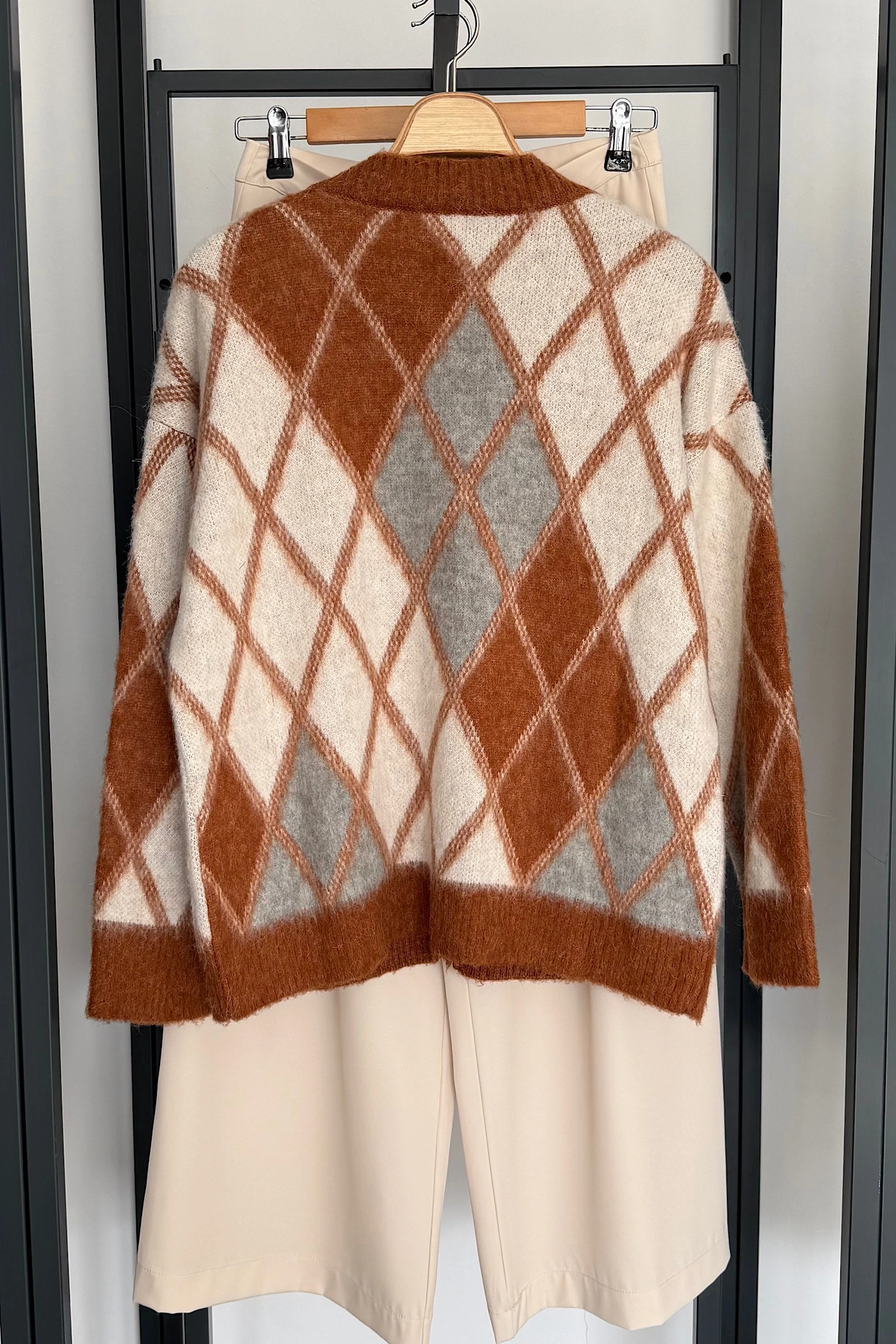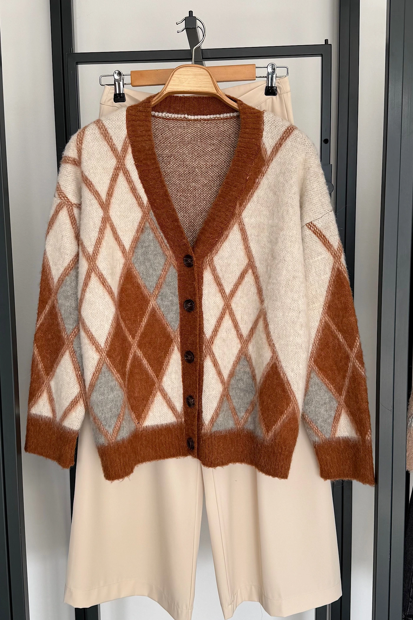 V Yaka Baklava Desenli Şardonlu Triko Hırka Kahverengi